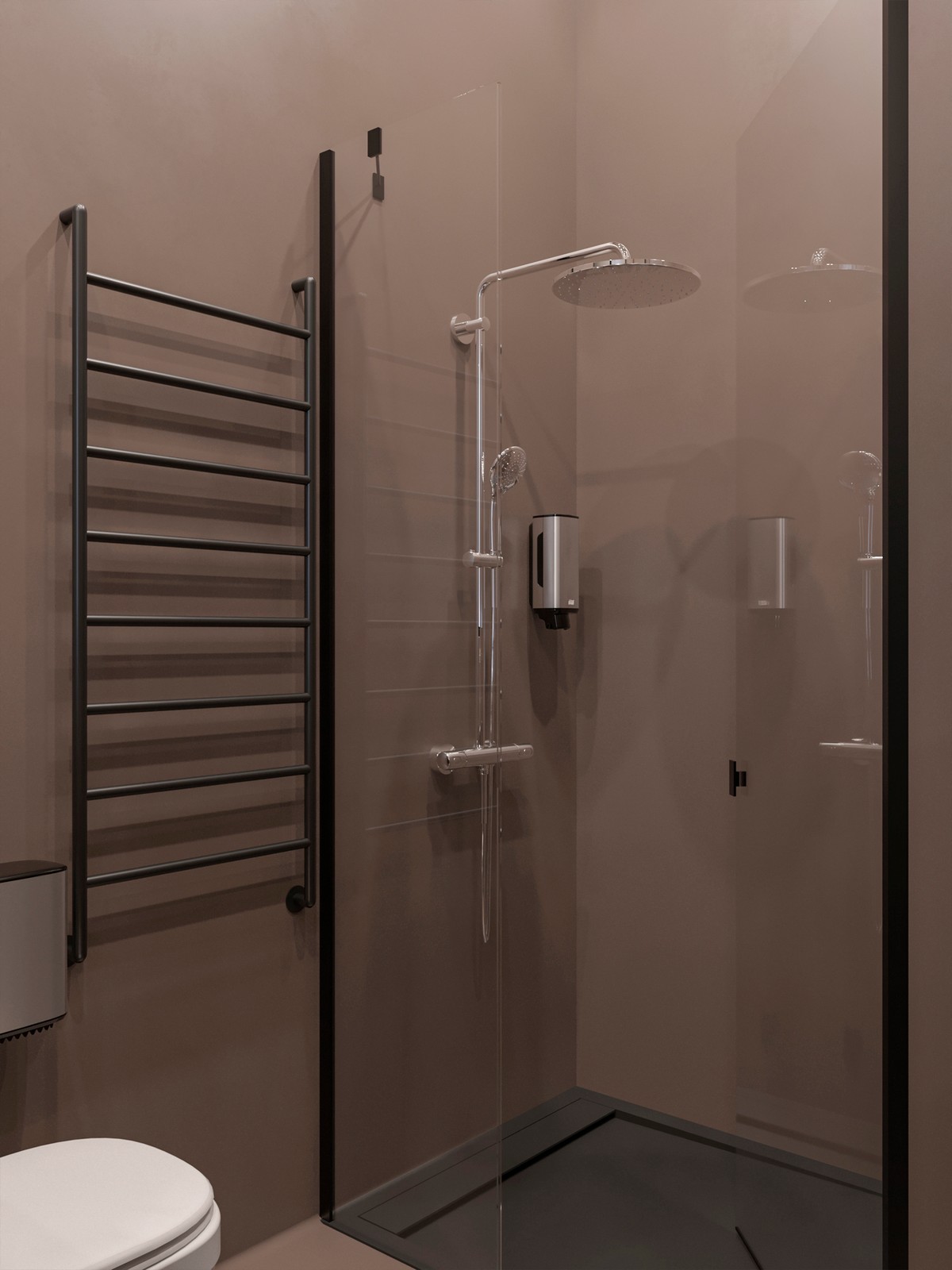 Dušo padėklas „Radaway Teos C/F“ pagamintas iš juodos akmens masės, pasižymi minimalistiniu dizainu, standumu ir atsparumu apkrovai. Be to, vonios kambaryje įrengiamas šiuolaikinio dizaino elektrinis rankšluosčių džiovintuvas PMH „Lasse“.