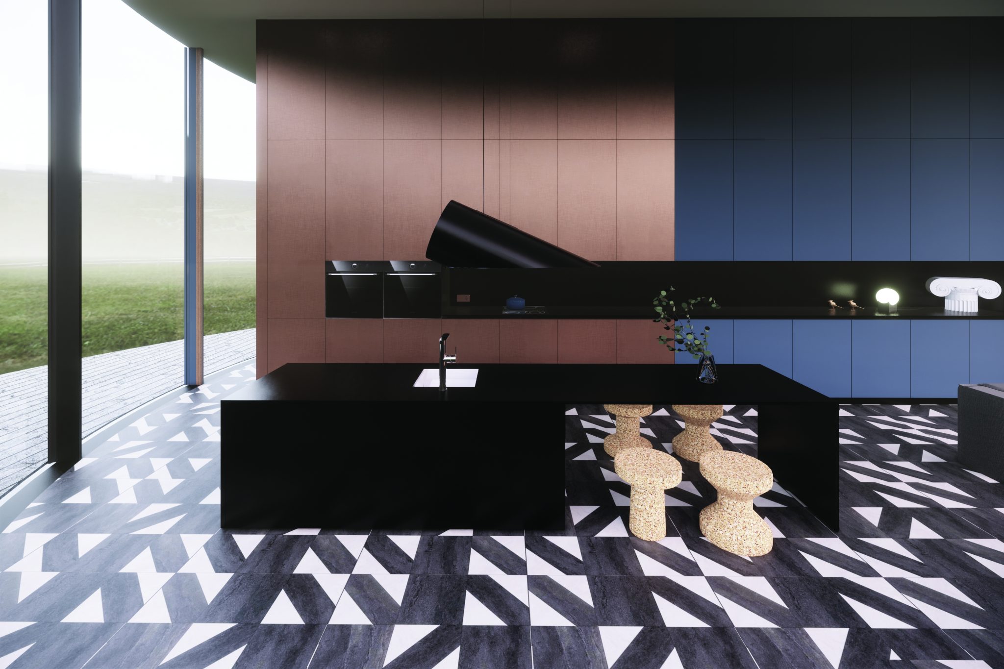 INTERJERO LINIJA. Projektui naudota kolekcijos „Amtico Signature“ grindų danga „Tempus Echo“ ir „Tempus Soothe“. Derinant dvi kontrastingas spalvas ir plytelių formatus išgautas unikalus grindų piešinys.