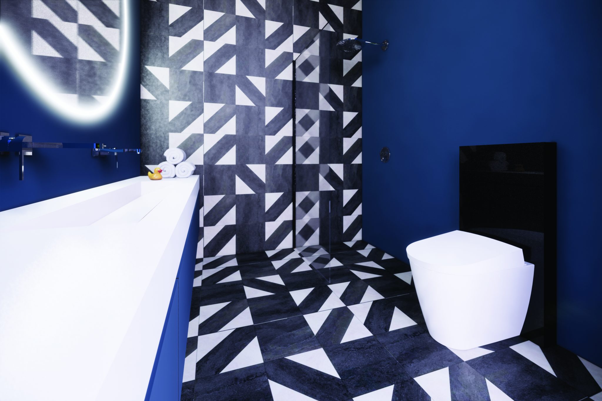 GEBERIT produktai, tokie kaip daugiafunkcis tualeto bakelis „Monolith“ ir pastatomas tualetas „Sela“ su sistema „AquaClean“, savo solidžiomis formomis vonios interjerui suteikia išskirtinumo.