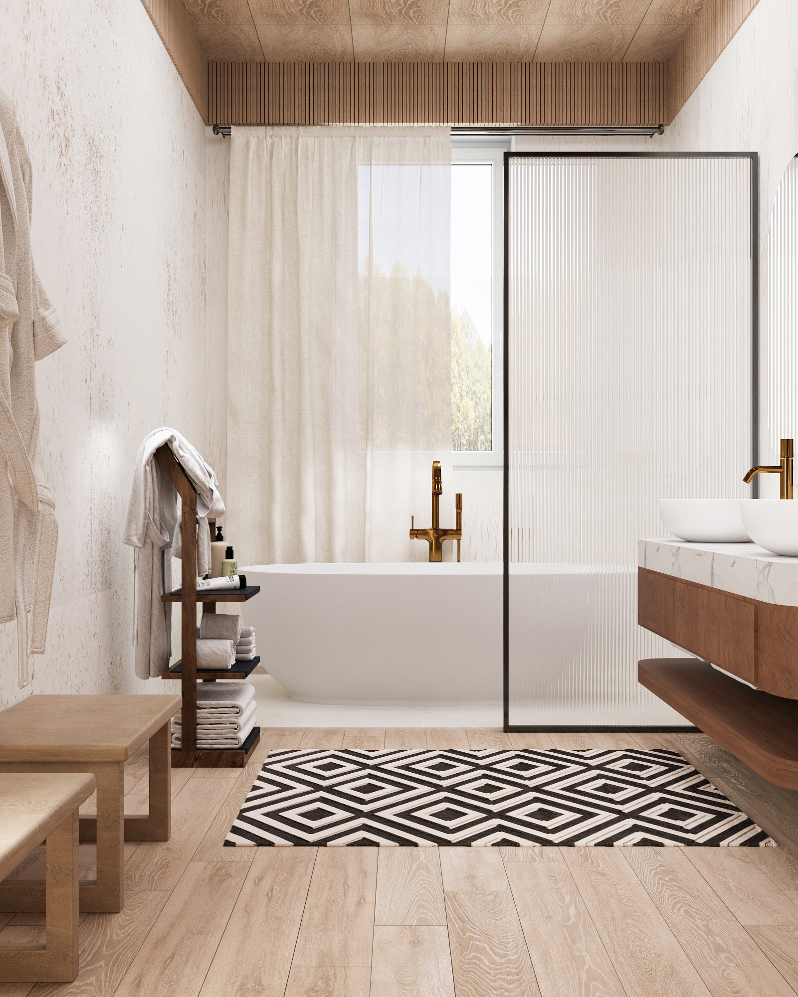 GROHE. Visuose vonios kambariuose pasirinkti „Grohe Essence“ maišytuvai. „Brushed Warm Sunset“ spalva dera prie medinių lubų apdailos, sustiprindama natūralumo ir švelnumo pojūtį interjere.