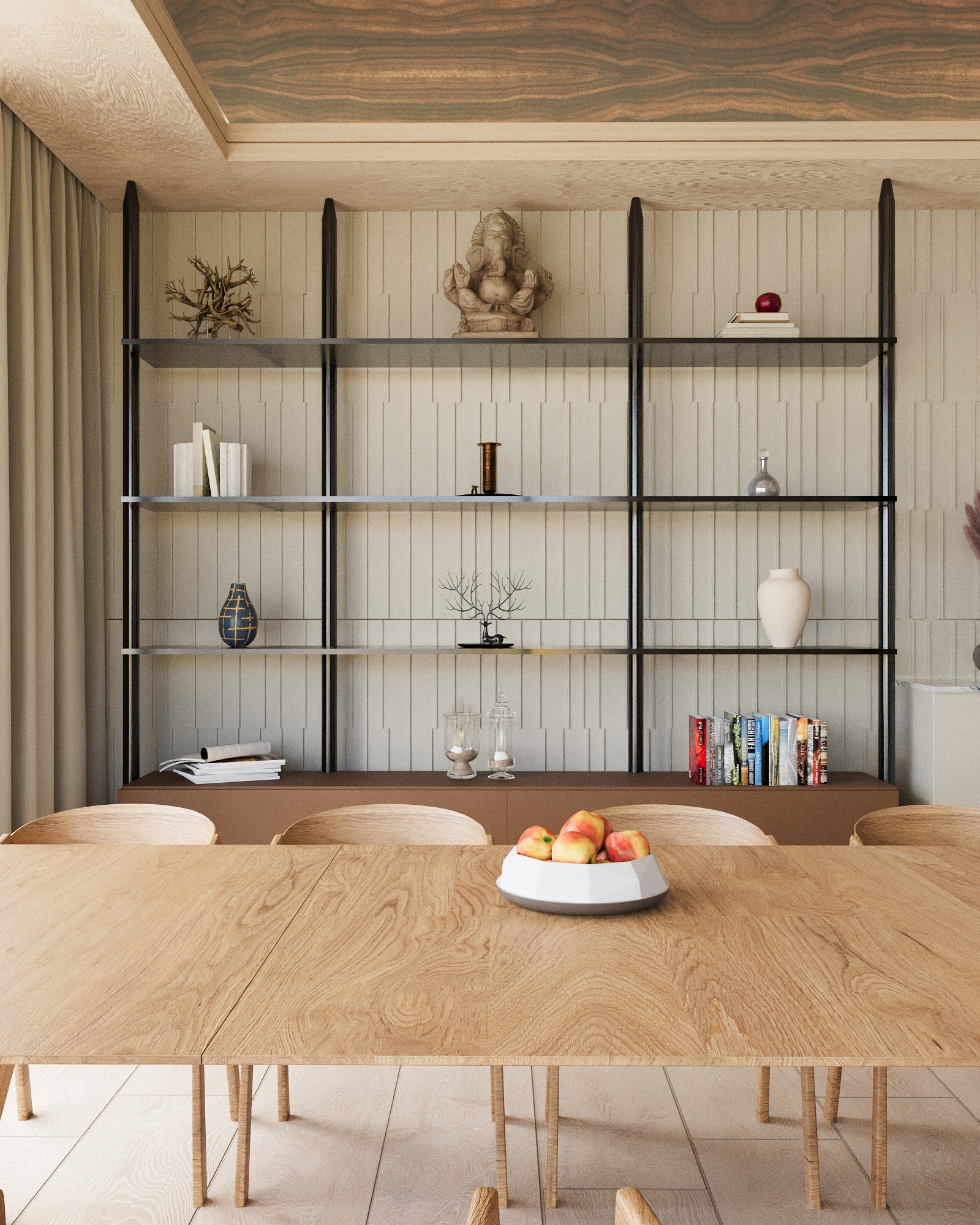 BRASA. Virtuvės erdvėje pritaikyta modulinė lentynų sistema STILI, priderinta prie medžio apdailosir laikančiųjų konstrukcijų. Apatiniai stalčiai skirti indams ir serviravimo įrankiams, o viršutinėslentynos – prisiminimams bei dekorui. Tokiu būdu valgomasis tampa gyvenamąja erdve, kuriojeformuojamos tradicijos, ritualai ir jaukiai leidžiamas laikas.