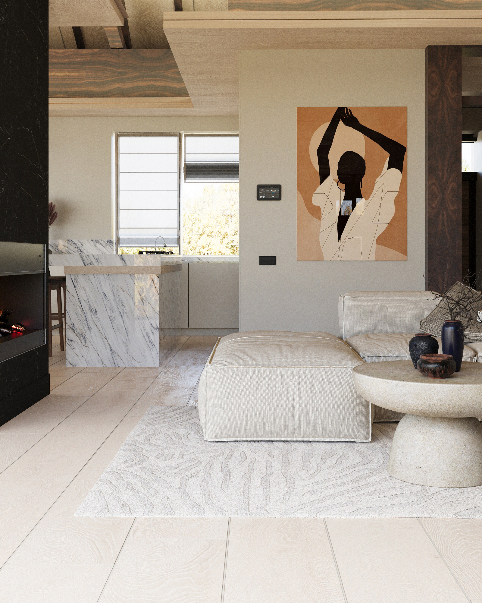 JUNG. Pasirinkta LS 990 serija – Les Couleurs® Le Corbusier® matinė „4320J terre d’ombre brûlée59“ spalva. Ji suteikia interjerui individualumo ir natūralumo išraišką, o smulkios klavišo detalėspabrėžia skulptūriškumą. Visas inžinerinis valdymas suvedamas į JUNG KNX „Smart Panel“ planšetę, užtikrinant patogų ir intuityvų sistemos naudojimą.