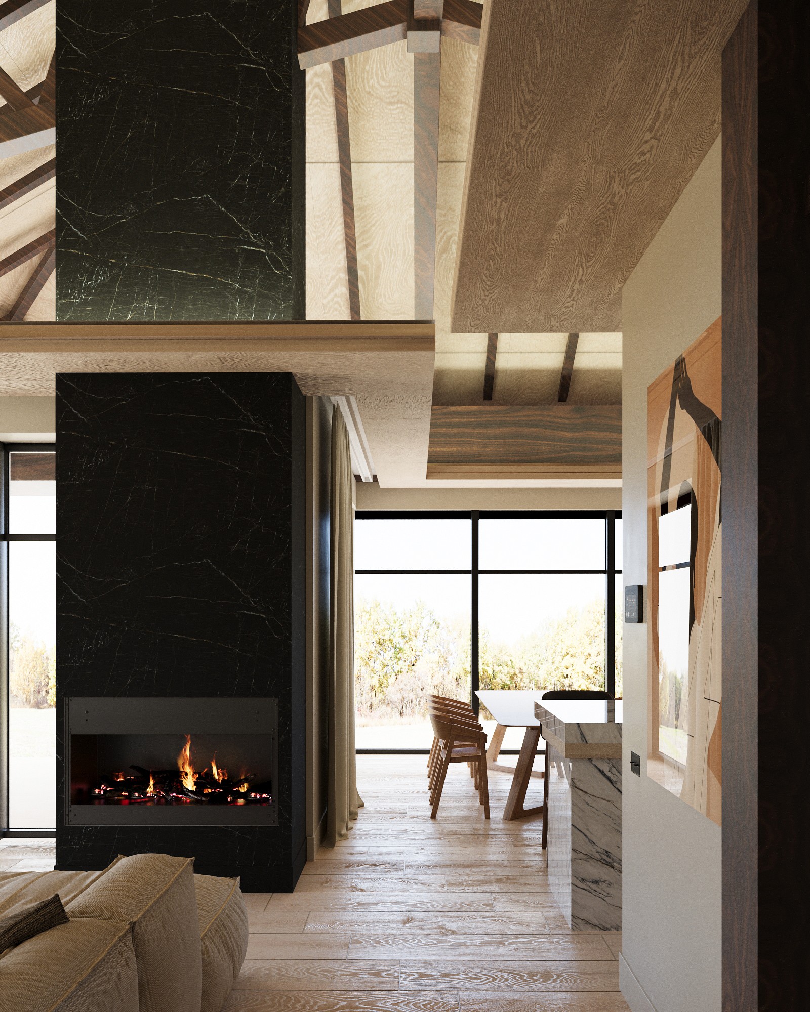 COSENTINO. Virtuvės salos stalviršiui pasirinkta „Dekton Onirika“ kolekcijos plokštė (spalvaTrance). Židinio apdailai naudota ta pati kolekcija (spalva Somnia) – ji tampa pagrindiniu interjeroakcentu. Vonios kambariuose pritaikytos „Dekton“ plokštės (Lunar ir Nillium), kurios natūraliaisatspalviais subtiliai dalija erdvę. „Dekton“ paviršiai atsparūs karščiui, nekeičia spalvos ir išlaiko savoestetiką ilgus metus.