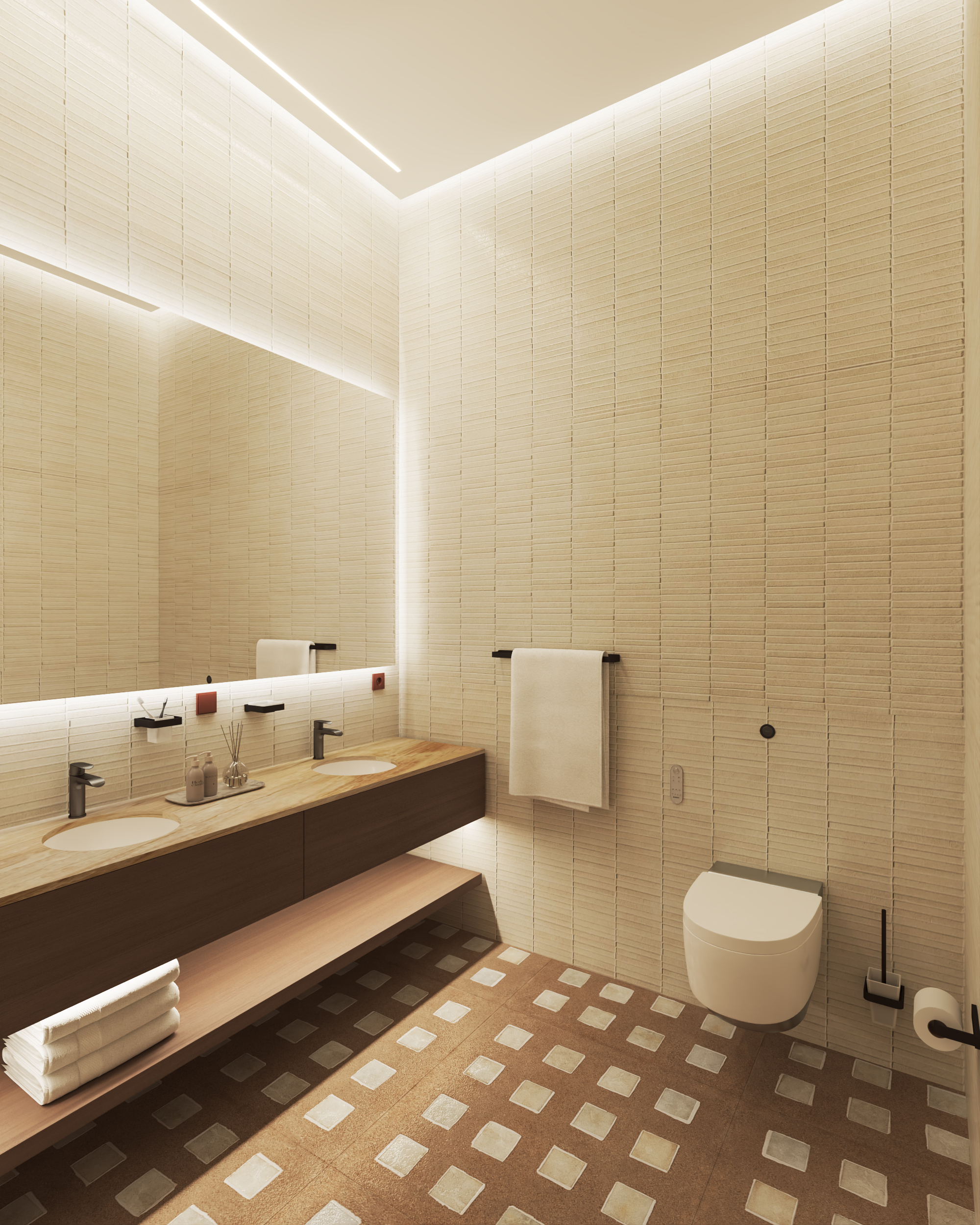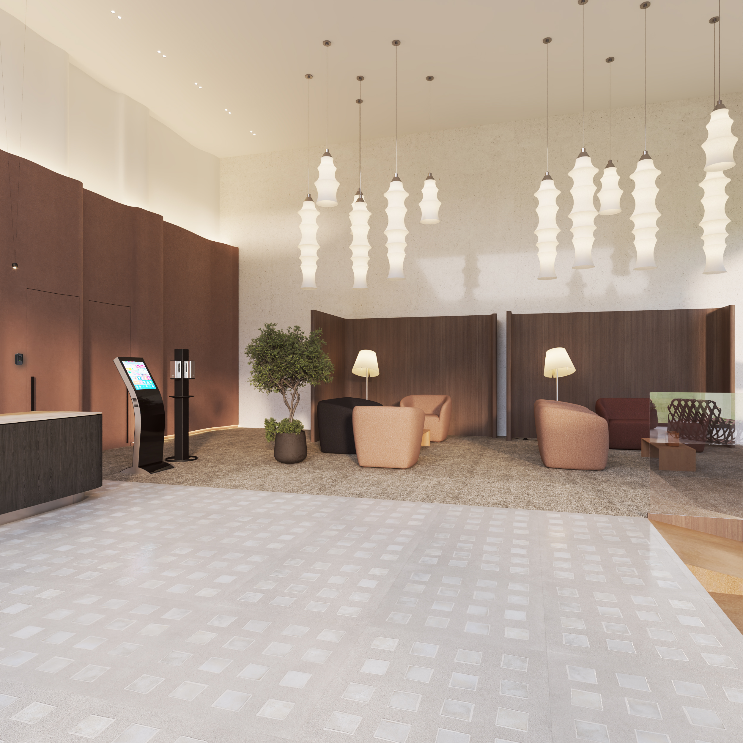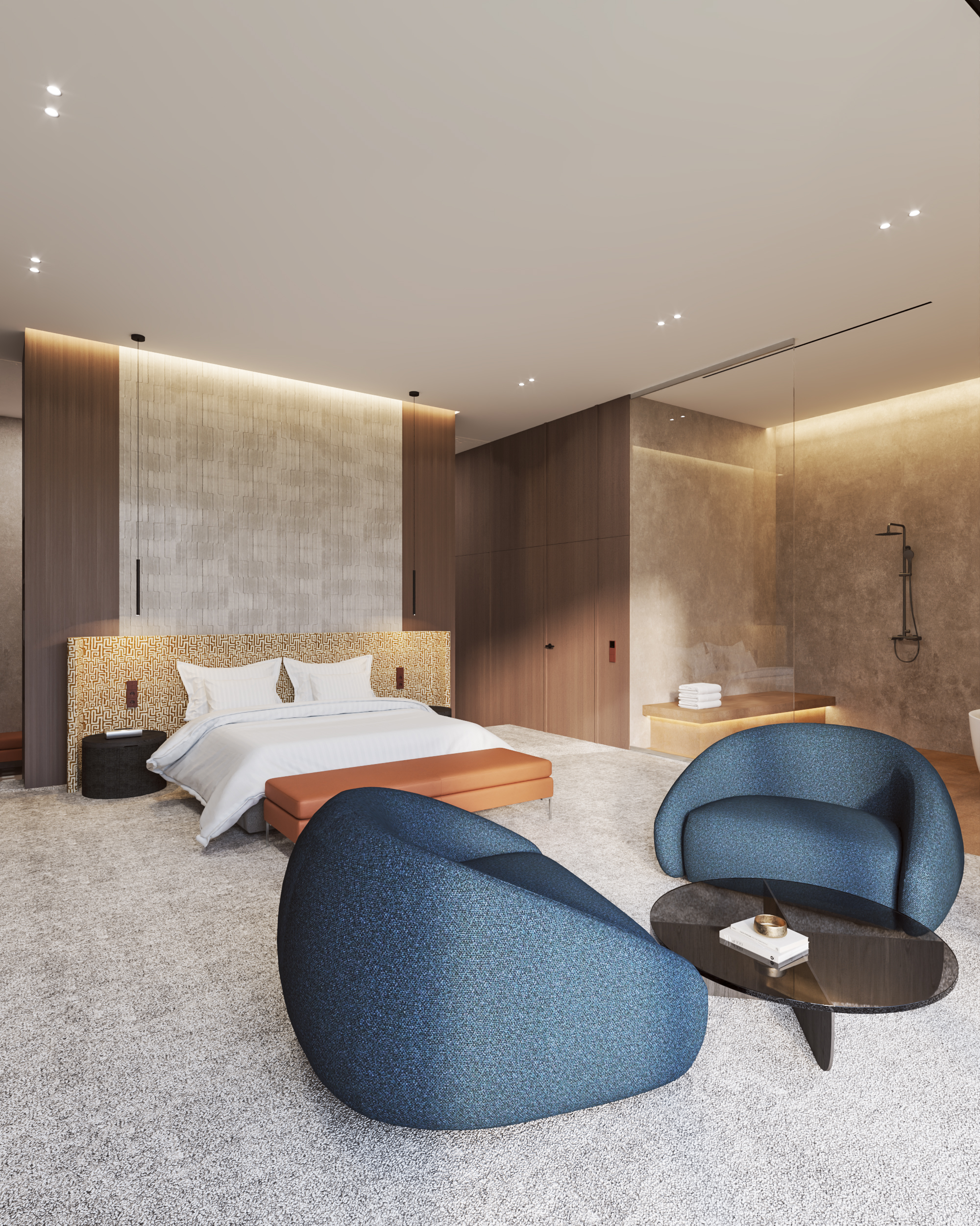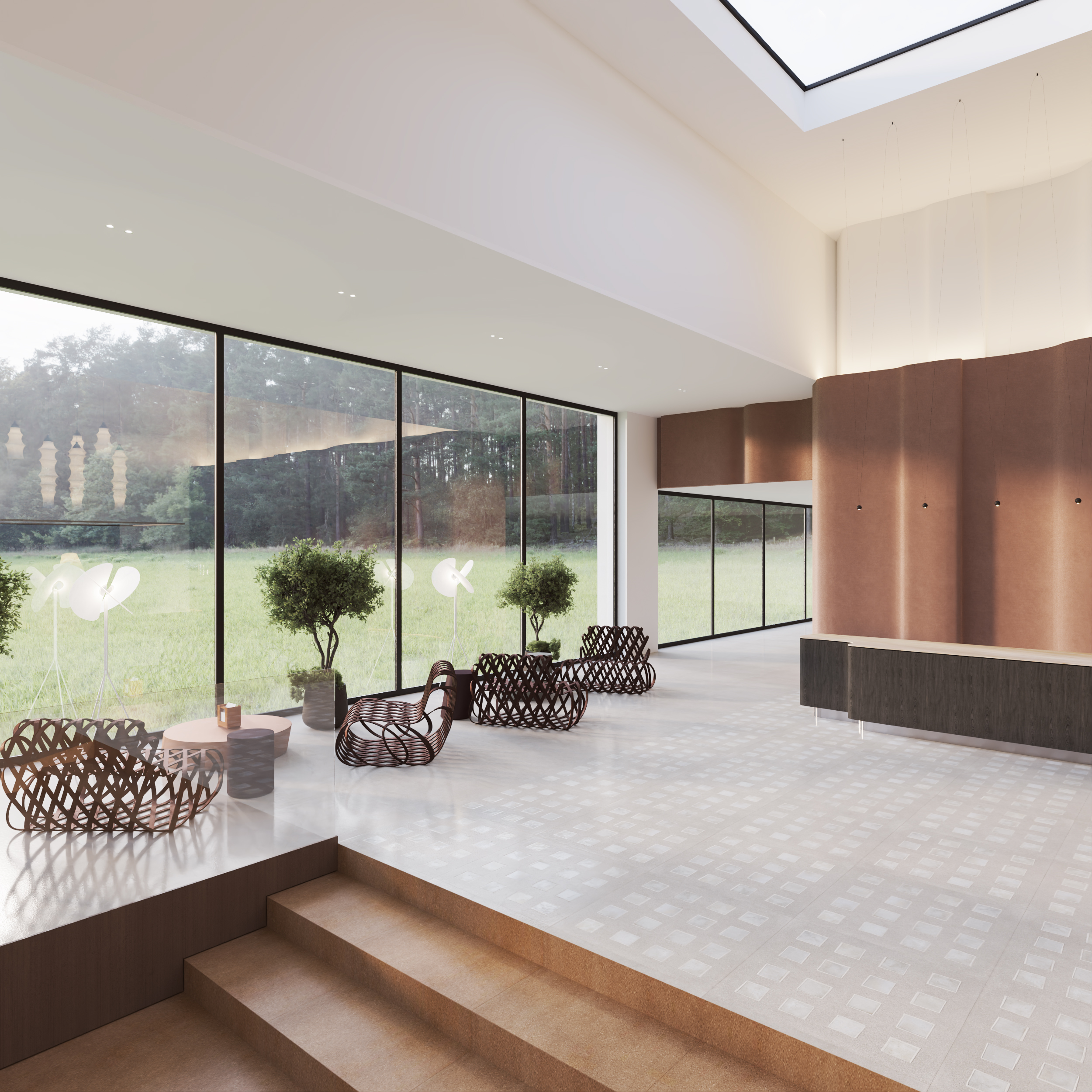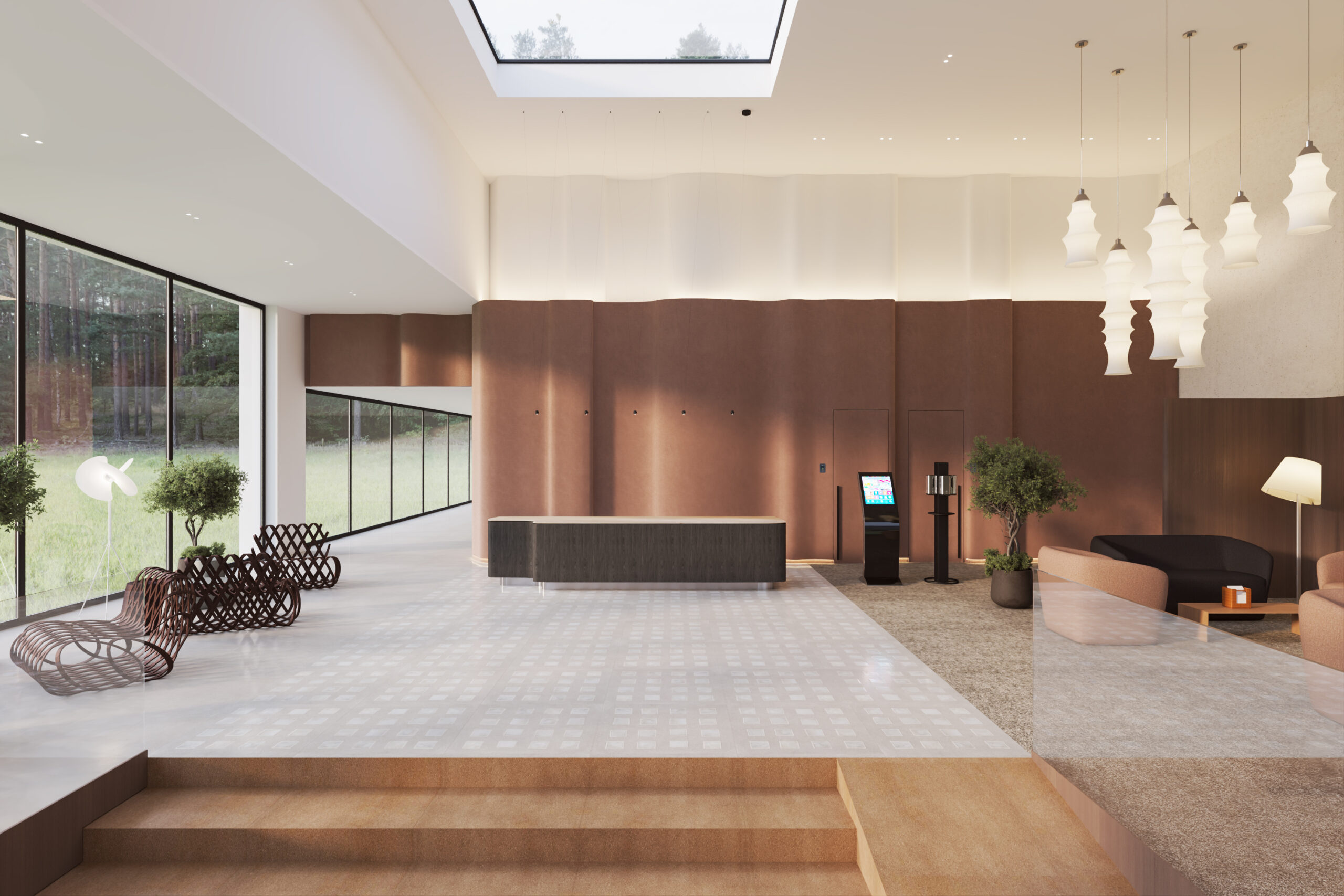 Interjeras pasižymi drąsiais tamsių, natūralių spalvų, medžio, akmens, tekstilės deriniais, kurie suteikia vizualinio gylio, prabangos ir lengvo Mid Century dvelksmo. Komfortas užtikrinamas per integruotus modernius apšvietimo valdymo, santechnikos, kitus viešosioms erdvėms pritaikytus technologinius sprendimus, o ergonomiškas išplanavimas bei estetinis vientisumas užtikrina išskirtinį charakterį.