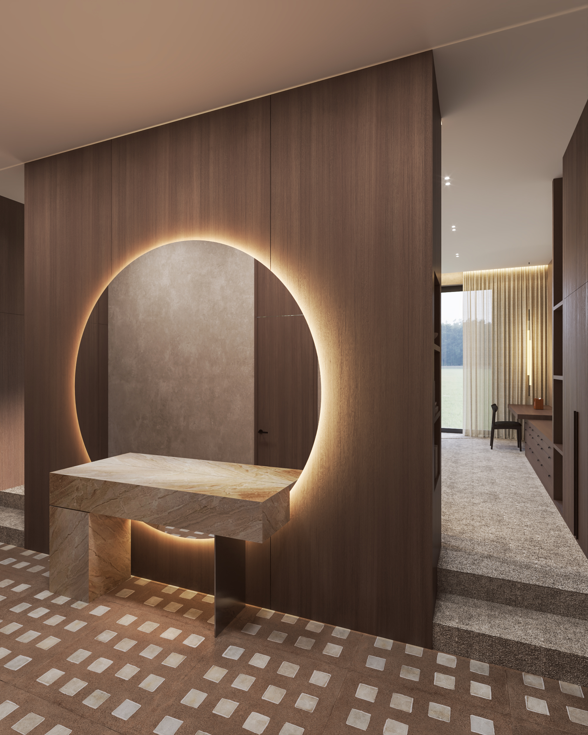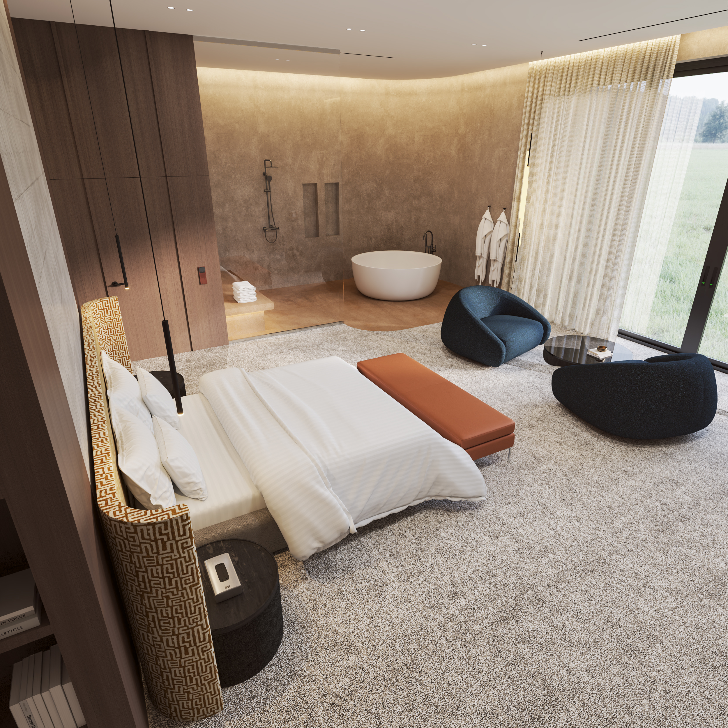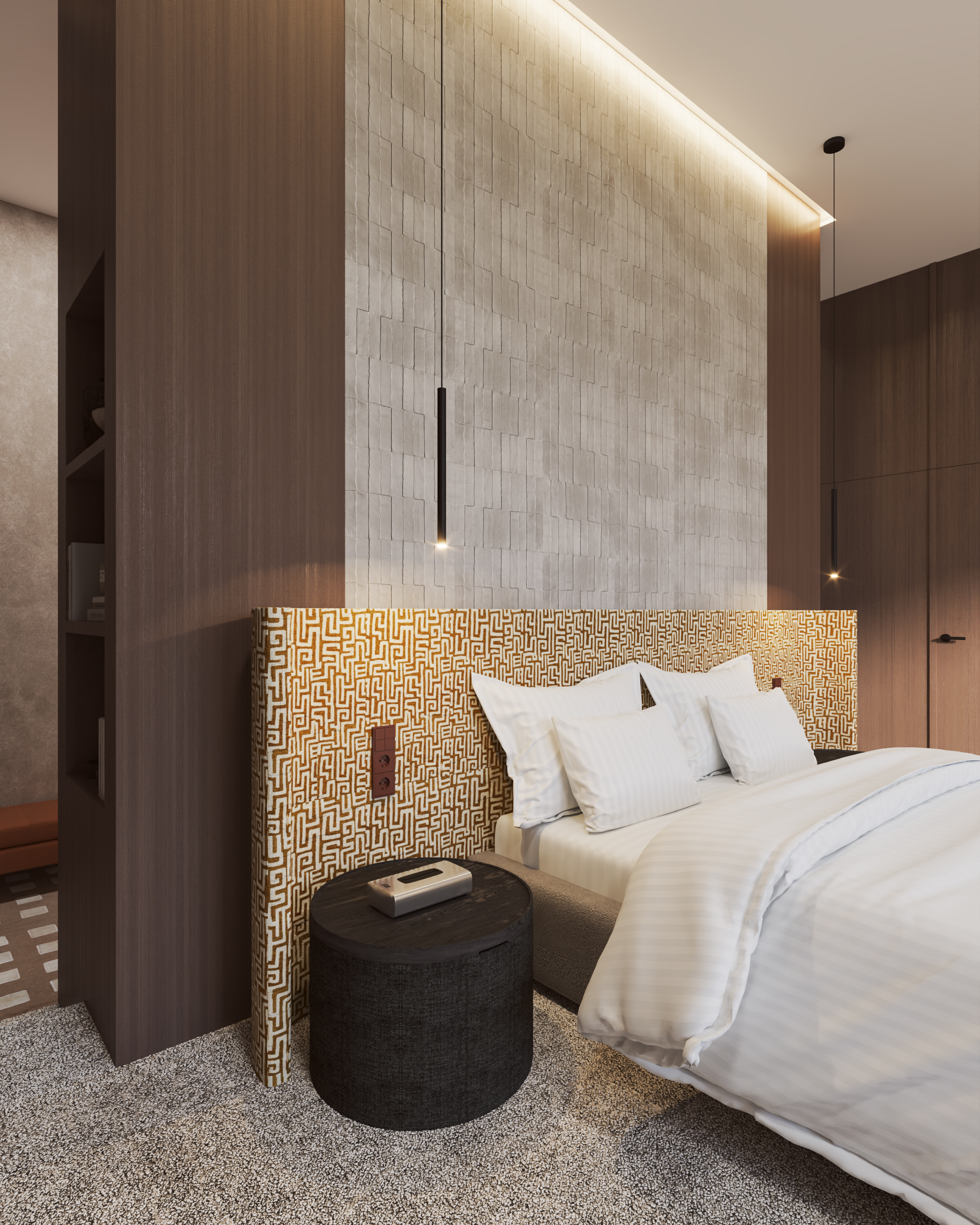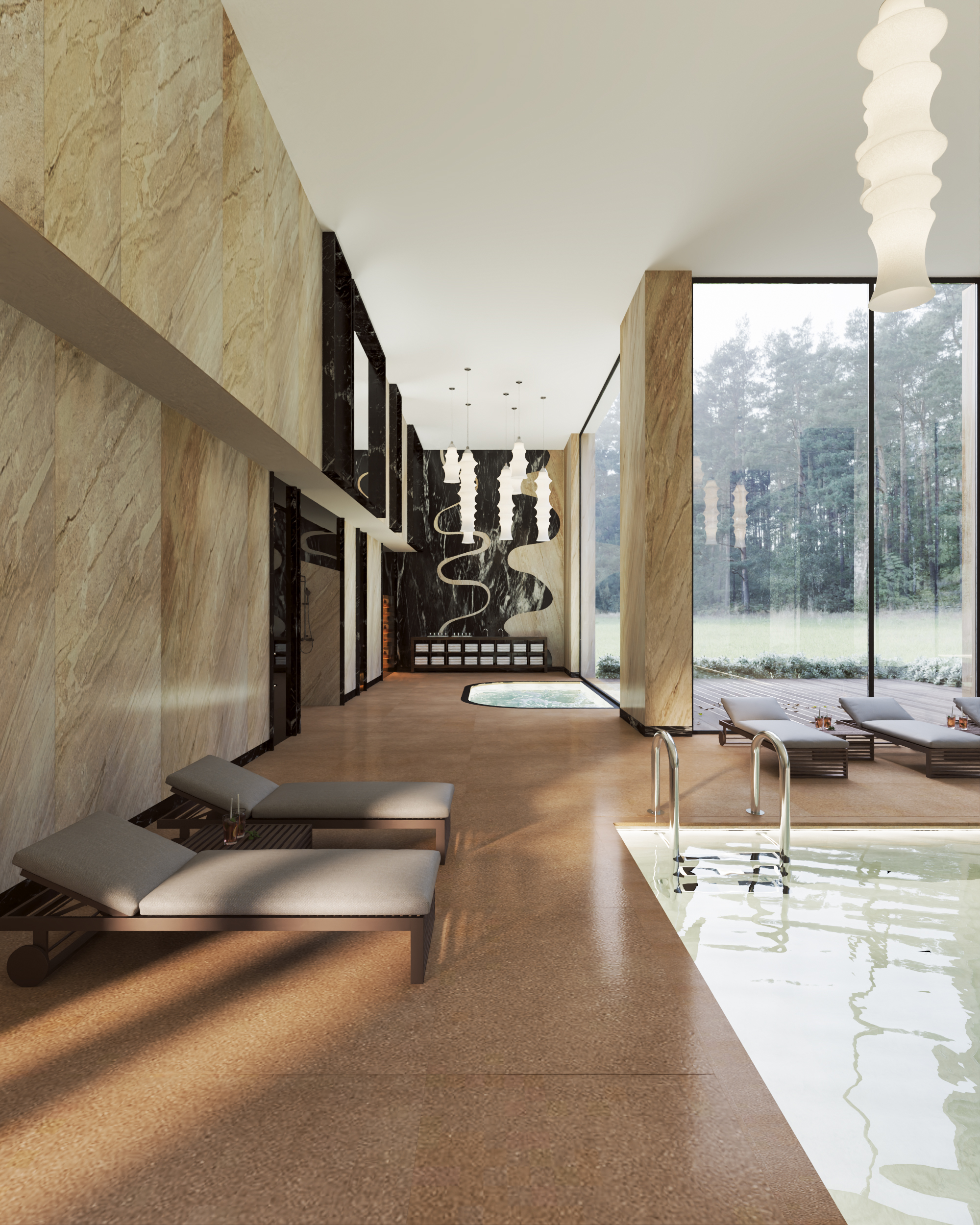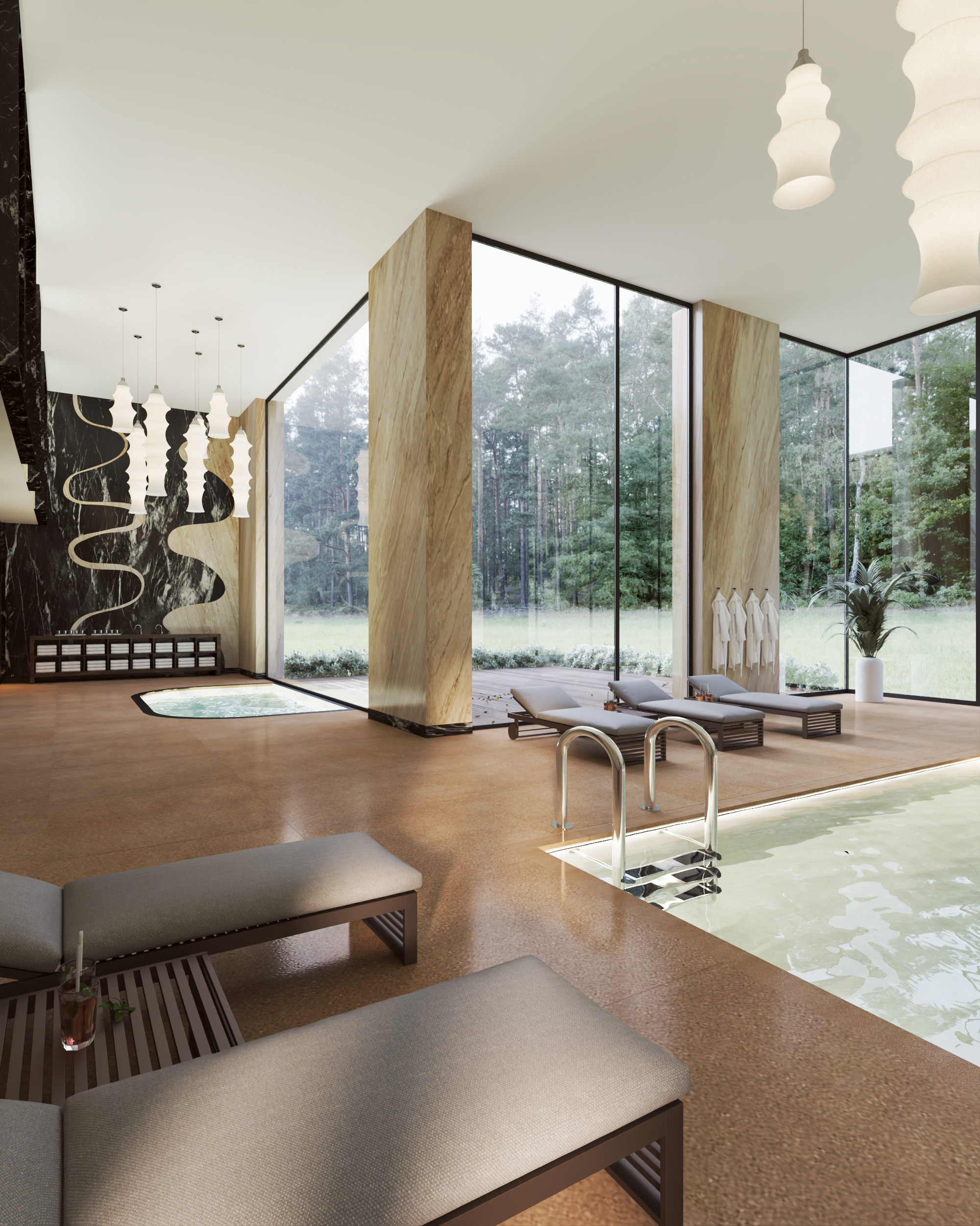 Interjeras pasižymi drąsiais tamsių, natūralių spalvų, medžio, akmens, tekstilės deriniais, kurie suteikia vizualinio gylio, prabangos ir lengvo Mid Century dvelksmo. Komfortas užtikrinamas per integruotus modernius apšvietimo valdymo, santechnikos, kitus viešosioms erdvėms pritaikytus technologinius sprendimus, o ergonomiškas išplanavimas bei estetinis vientisumas užtikrina išskirtinį charakterį.