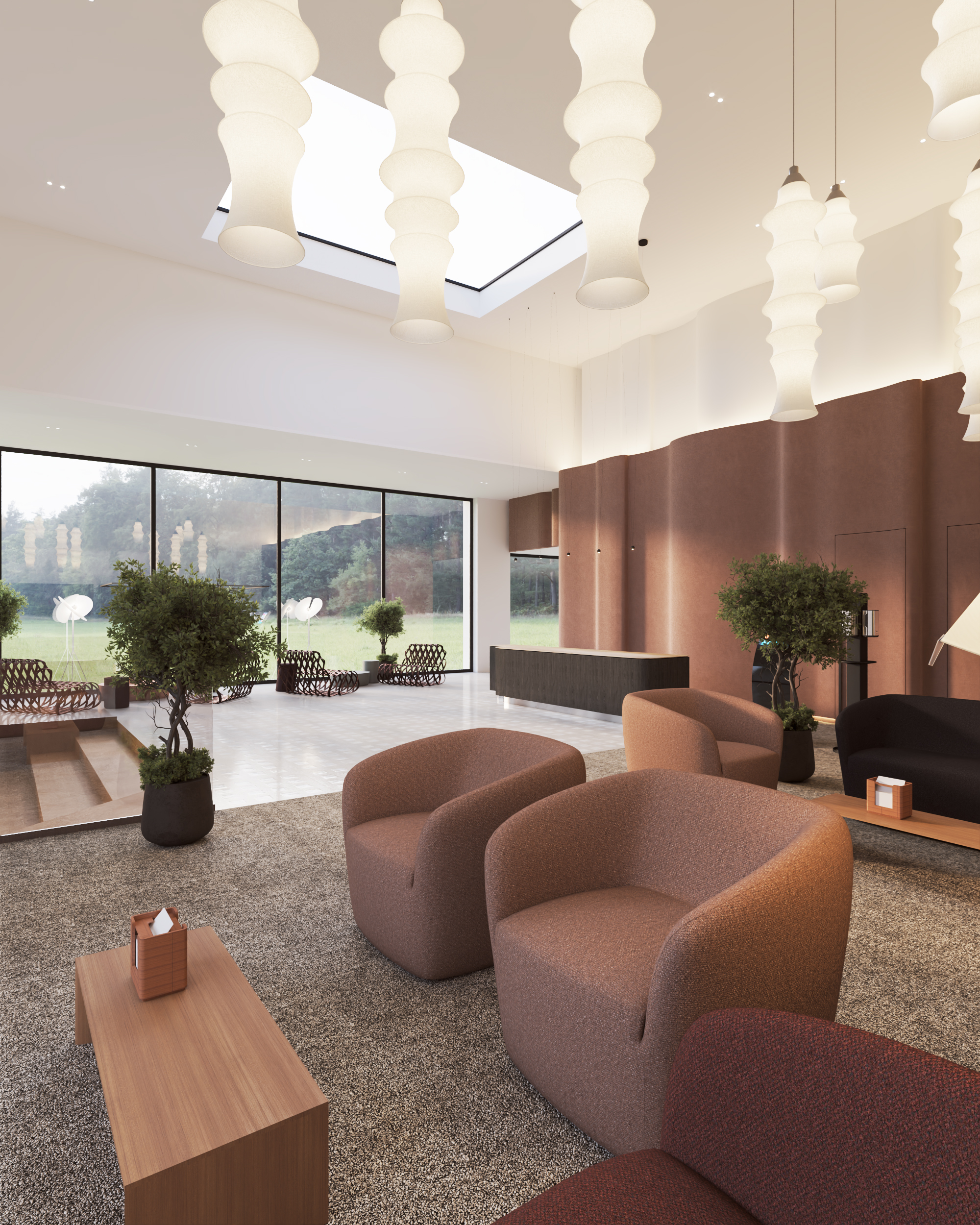 la Cividina Aria – išskirtinio dizaino krėslai recepcijos zonai suteikia charakterio, jų spalva puikiai dera su terakotine sienų apdaila.
