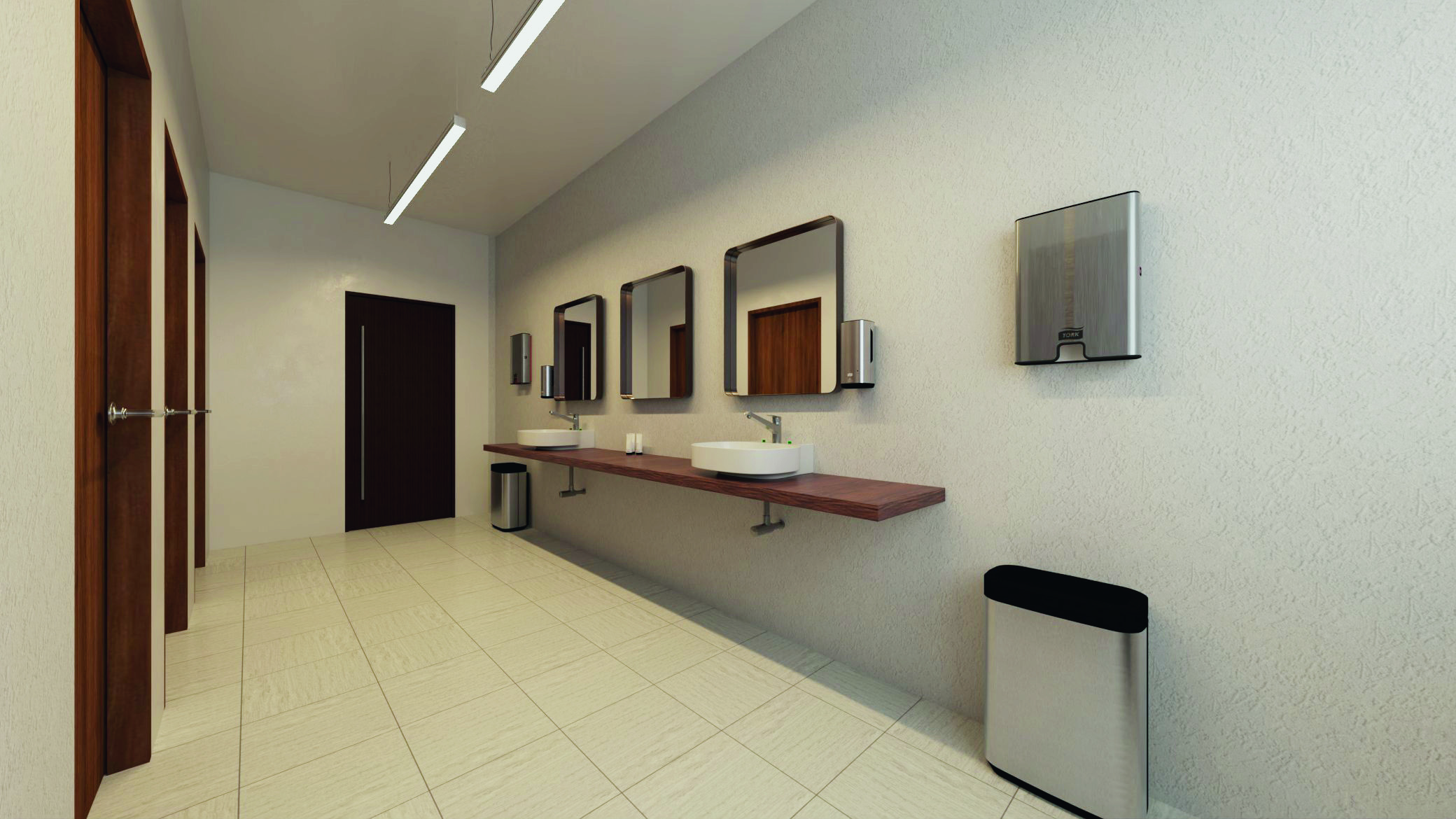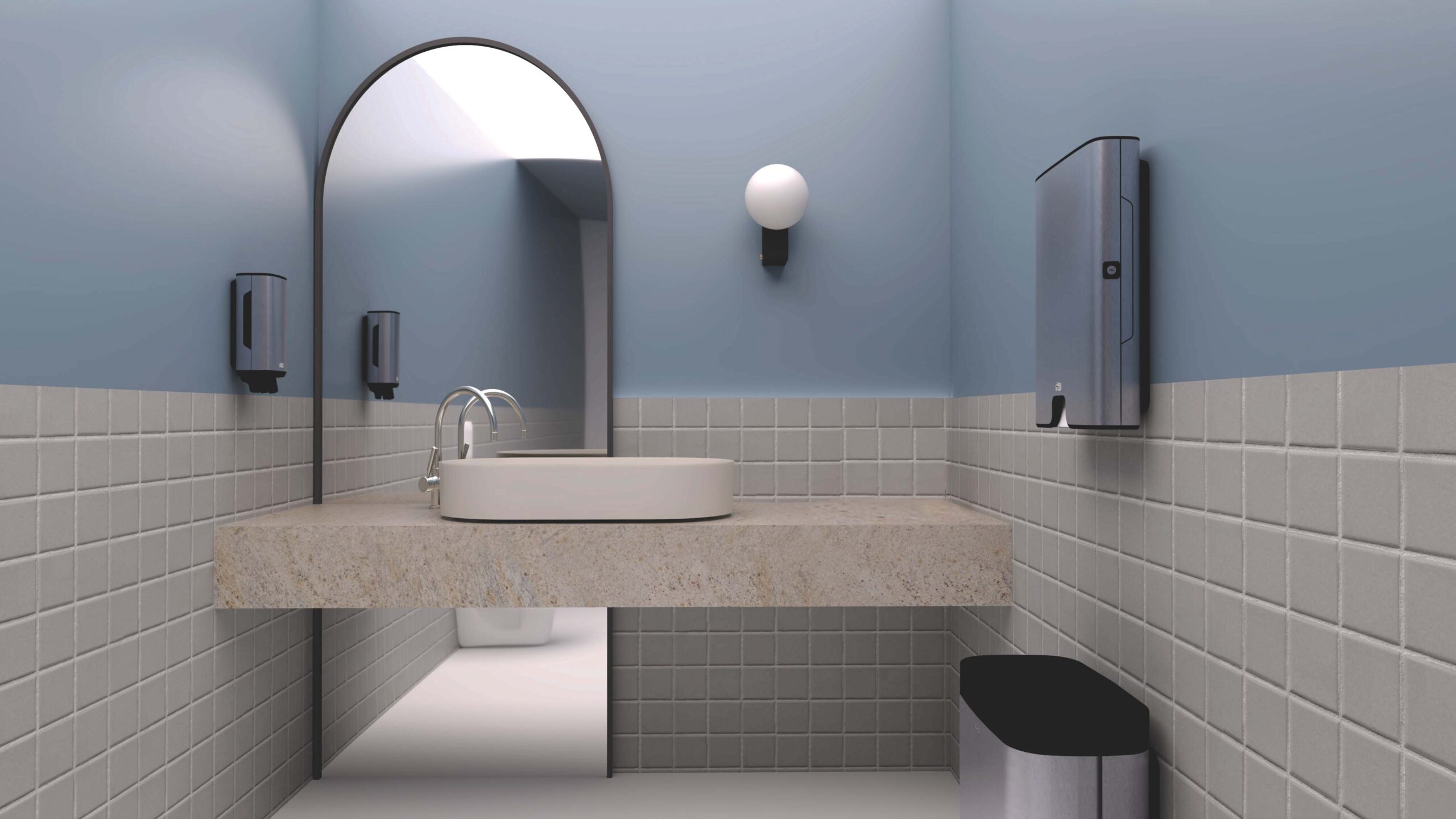 TORK. Sanitariniuose mazguose įrengtos „Tork“ šiukšliadėžės, odos priežiūros priemonių dozatoriai ir sulankstytų popierinių rankšluosčių dozatoriai „Tork Xpress® Multifold“. Produktai su stilinga nerūdijančiojo plieno apdaila harmoningai dera prie viso interjero dizaino, suteikdami erdvėms modernumo ir estetikos.