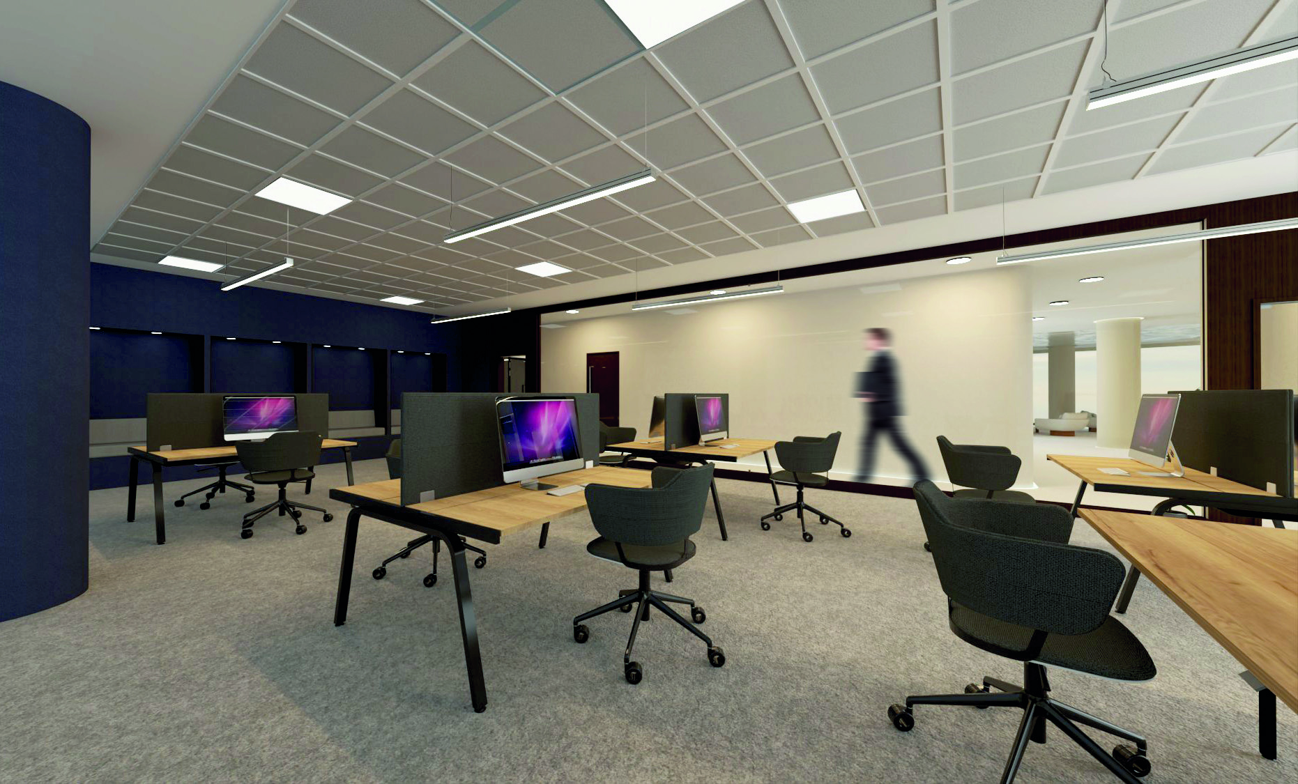 ISKU. Darbo zonai išrinktas stalas „Bench Multi-purpose“, lengvai transformuojamas pagal skirtingus poreikius. Išradinga jo kabelių ir maitinimo šaltinių valdymo sistema suteikia galimybę tuo pat metu naudoti kelis įrenginius. Darbo zonoje ir konferencijų salėje pasirinktos serijos „MyFlow“ kėdės, kurių spalvas ir medžiagas užsakovas gali rinktis pagal savo poreikius. Konferencijų salėje stovintis serijos „MyFlow“ stalas užtikrina funkcionalumą ir vientisą dizainą.