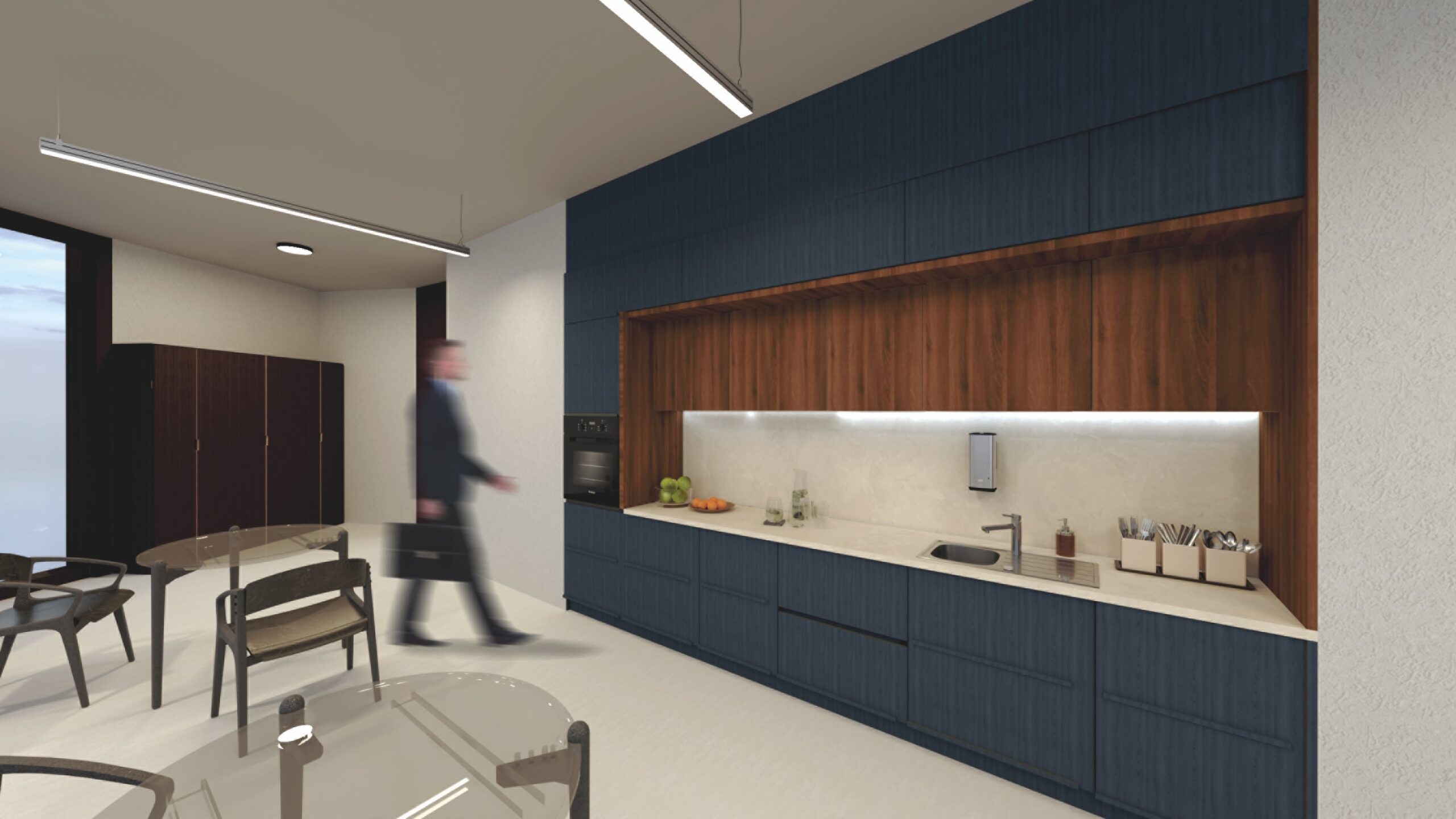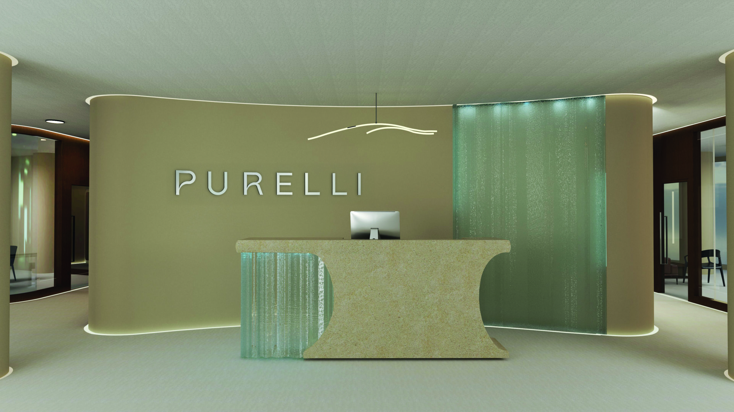 Purelli“ – harmoninga ir organiška interjero erdvė. Tai gėlo vandens agentūros biuras, kuriame stiklas tampa pagrindiniu simboliu, perteikiančiu vandens skaidrumą, lengvumą ir srauto pojūtį. Išskirtinai integruotas į individualaus projekto stalą ir sieną recepcijos zonoje, stiklas sukuria subtilią vandens iliuziją, o veidrodinės lubos tampa vandens atspindžiu. Šis sprendimas išryškina įmonės esmę ir misiją – tiekti tyrą ir švarų vandenį. Interjero spalvinis akcentas yra tamsiai mėlyna spalva. Šviesūs smėlio atspalviai kuria švaros ir erdvumo įspūdį, o natūralaus medžio tonai suteikia erdvei jaukumo ir šilumos. Tokiu dizainu harmoningai sujungiami estetiniai sprendiniai ir funkcionalumas, užtikrinama švari, profesionali ir įkvepianti darbo aplinka.