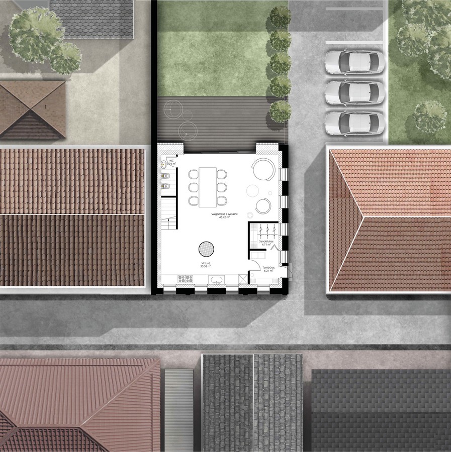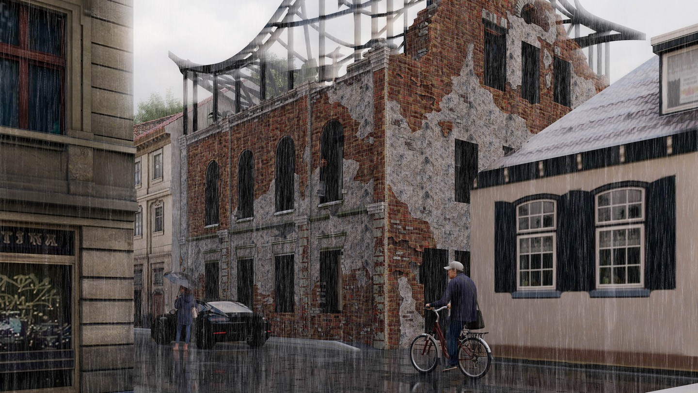 Mes pasirinkome sklypą Kaune, Kurpių gatvėje, kaip mūsų įsivaizduojamos ateities problematikos pavyzdį. Didėjant žmonių tankiui, trūksta būstų, o paveldas yra niokojamas. Tad pasirinktame sklype esamus griuvėsius integruojame į projektą kontrasto principu.