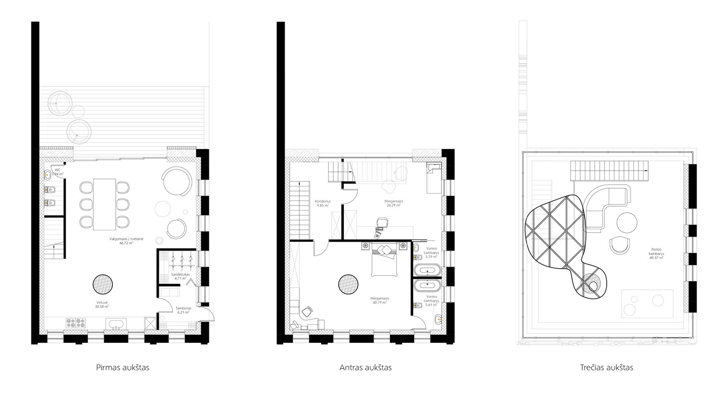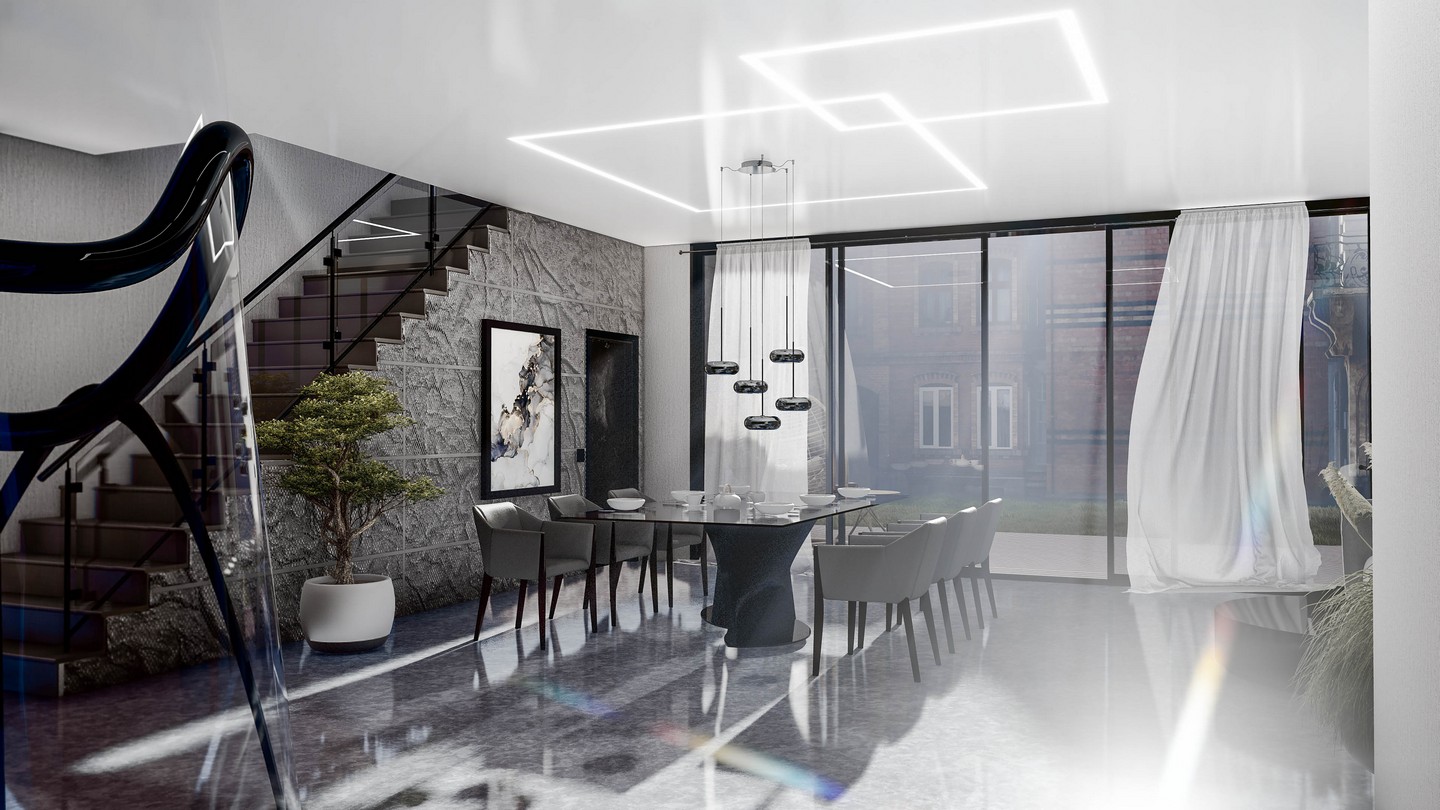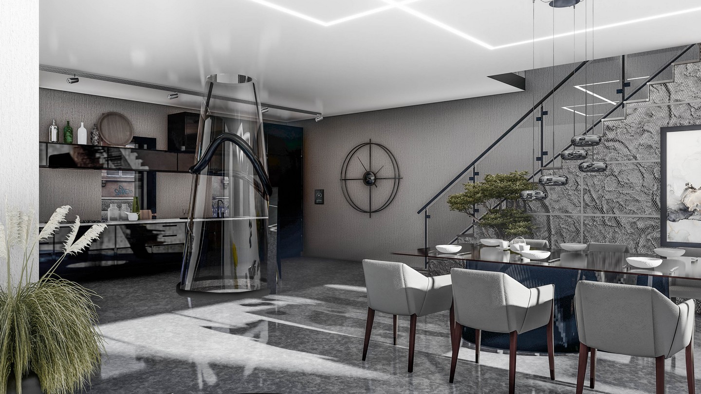 UAB „DUSĖTAI“. Parinktas valgomojo stalas „Petal“ – vėduoklinio tipo organinė stalo forma mėgdžioja svetainės stiklinio šviesos tunelio akcentą, o aštrūs elementai pabrėžia ir tikslesnes geometrines linijas interjere. Svetainės foteliai iš „Odeon“ linijos pasirinkti dėl unikalių apskritų formų dizaino ir pagyvinančių tekstūrų.