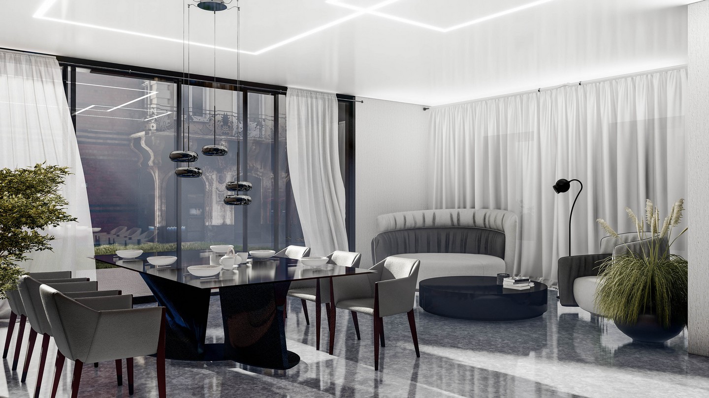 VITTALI. Svetainei ir virtuvei jaukų, minimalistinį apšvietimo sprendimą padėjo sukurti įtempiamosios lubos ir jose integruotos šviesos linijos be jokių matomų įrangos kraštų. Lubos atsparios drėgmei, smūgiams, nekaupia dulkių ir lengvai valomos, tad įsilieja į sterilų, šviesų interjerą ir praktine, ir estetine prasme.