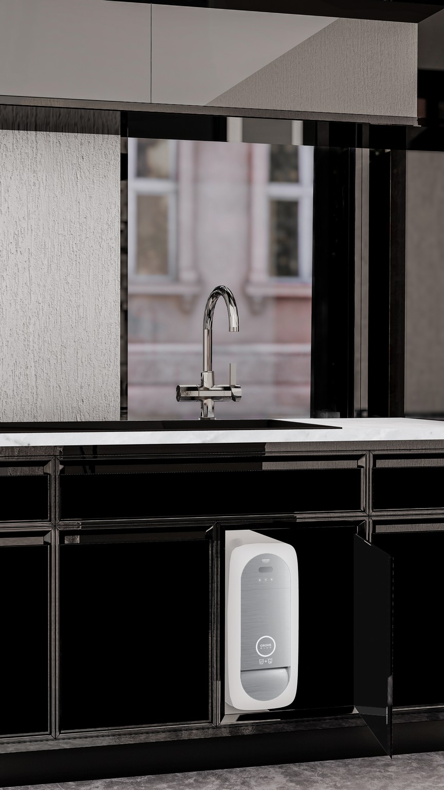 GROHE. Vonios kambariui pasirinkome produktus iš modernios, kubistinio stiliaus „Eurocube“ kolekcijos. Produktų linija išsiskiria griežtų, aštrių formų dizainu, kuris puikiai tinka kontrastui išryškinti tarp tradicijos ir inovacijos mūsų projekte. Pasirinkti produktai iš kolekcijos: praustuvo maišytuvas (M dydžio), dušo / vonios maišytuvas. Prie virtuvės plautuvo maišytuvo pajungta GROHE BLUE sistema, kuria tiekiamas atvėsintas filtruotas vanduo su pasirinkimo galimybe: negazuotas, švelniai arba stipriai gazuotas.