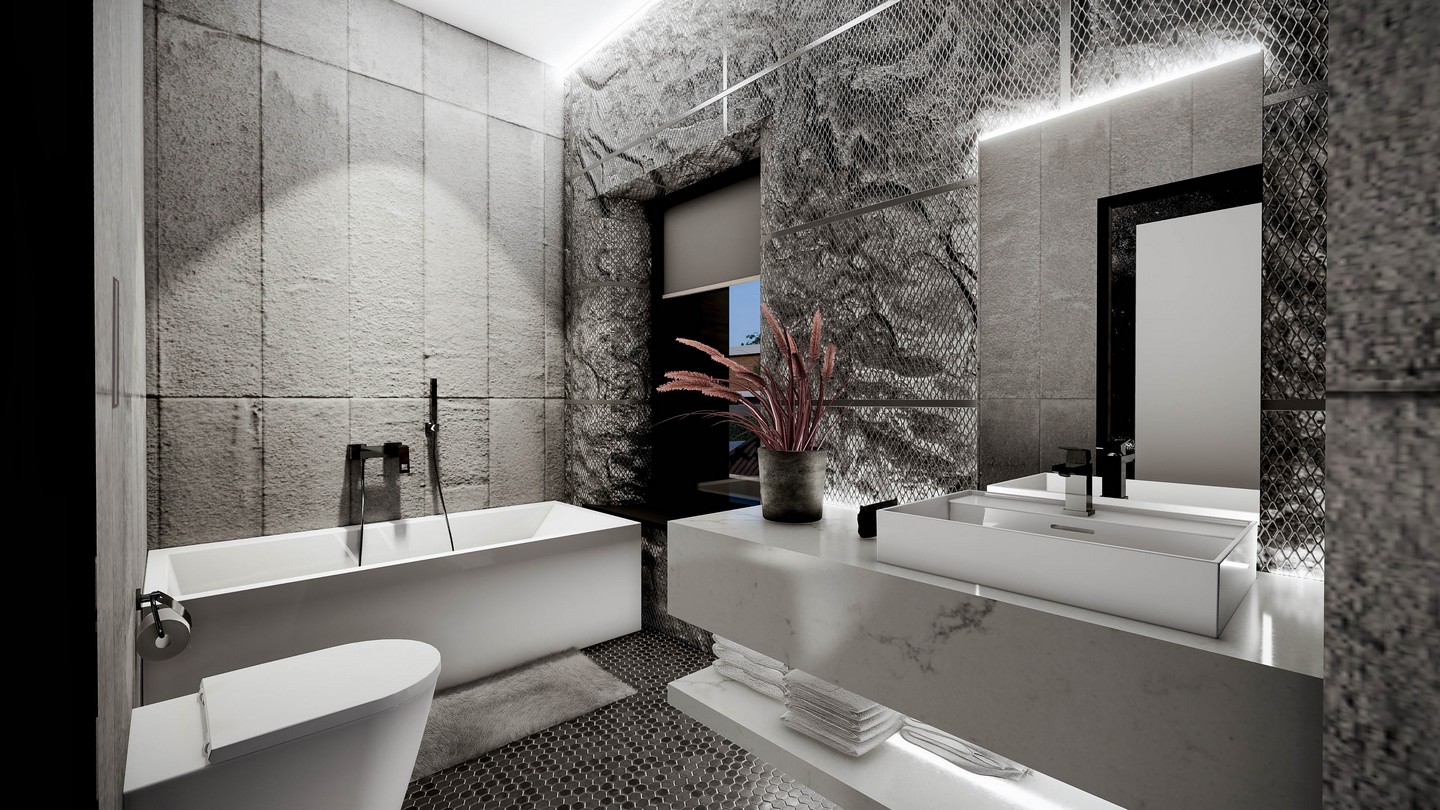 COSENTINO. Vonios kambario stalviršiui parinkta „Silestone®“ „ Ethereal“ linijos „Noctis“ spalva. Paviršių gamybai pritaikyta „HybriQ“ technologija – aukščiausios kokybės mineralų, kvarco ir perdirbto stiklo mišinio formulė, o pats gamybos procesas vyksta naudojant tik atsinaujinančios energijos šaltinius bei perdirbtą vandenį. Didelis atsparumas dėmėms, pažeidimams, cheminėms medžiagoms, stiprumas ir lengva priežiūra – svarbiausios produkto savybės vonios kambario erdvei, o švelnus marmuro raštų imitacijos dizainas suteikia prabangos jausmą.