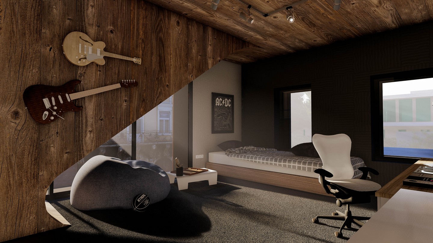 UAB „MEDŽIO APDAILA“. Miegamojo erdvės daliai panaudotos ąžuolinės trisluoksnės parketlentės „Boen Longstrip Andante“. Natūrali medienos spalvų variacija pagyvina kambario kontrasto idėją. Įmonės siūlomų parketlenčių asortimentas – tik iš sertifikuotų miškų ūkių, todėl grindų pasirinkimas pagrįstas ir tvarumo aspektu.