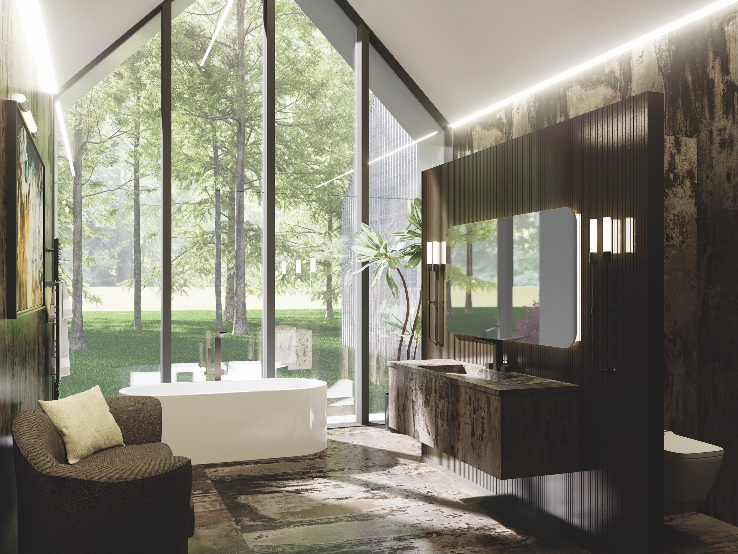 COSENTINO. Namo „VYTIS“ vonioje pasirinkta „Dekton“ kolekcijos ultrakompaktinė porcelianinėplokštė „Trilium“. Ji kuria tvirtumo, ilgaamžiškumo ir elegancijos įspūdį, suteikia interjerui modernų, prabangiai industrinį charakterį, išlaikydama subtilų rafinuotumą. Paviršius atsparus drėgmei ir turiantibakterinių savybių, todėl puikiai tinka intensyviai naudojamose erdvėse, tokiose kaip vonioskambarys.