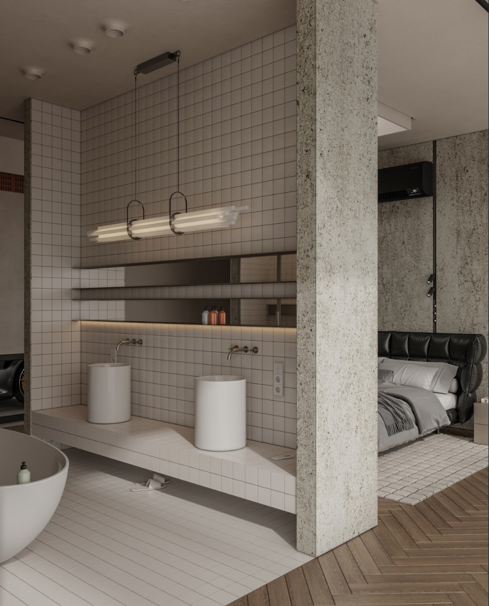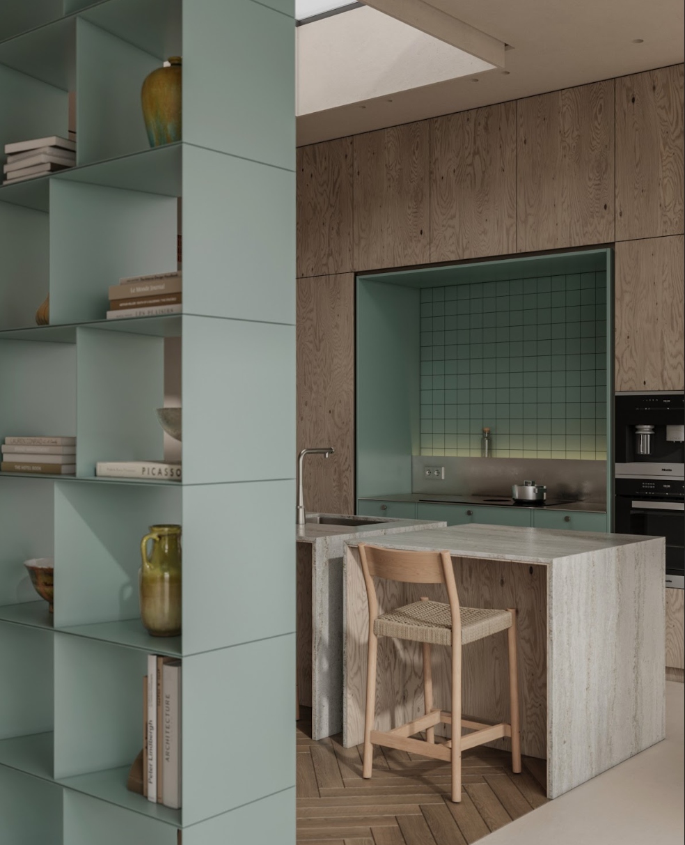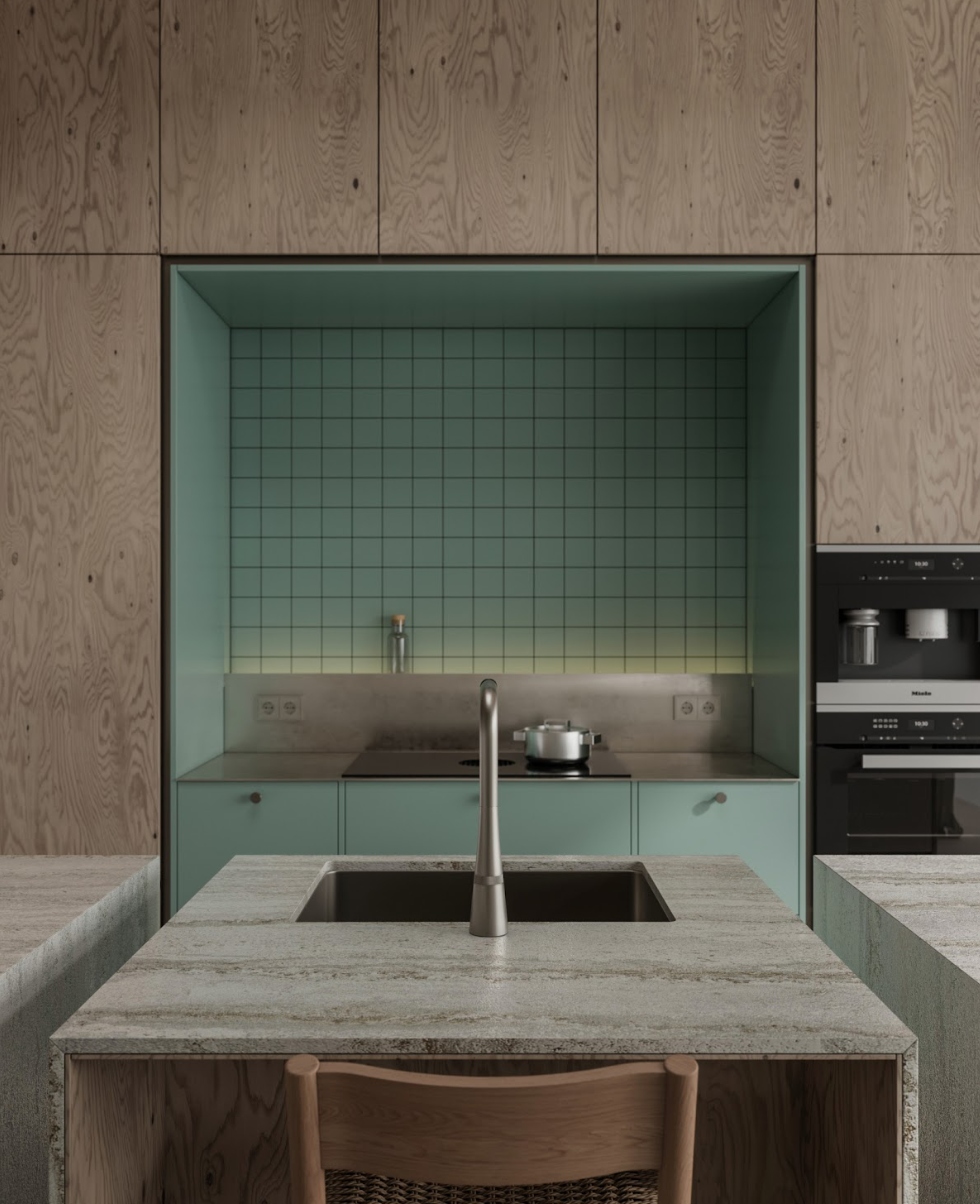 COSENTINO. Paviršiai interjere tampa vientisa estetikos ir funkcijos dalimi – ilgaamžiai, tvarūs, interjerą papildantys ir jam tarnaujantys sprendimai. Inovatyvios medžiagos, tokios kaip „Dekton“, užtikrina ne tik atsparumą, bet ir subtilų, laikui nepavaldų grožį. Šiame interjere labiausiai įsiliejo virtuvės salos stalviršiui bei formai pabrėžti naudojamas „Trevi“ travertinas iš „Pietra Edition“ kolekcijos, taip pat savo subtilumu vonios ir miegamojo erdvėse vidinio plano struktūrai paryškinti – „Keon“ iš „DK Tech“ kolekcijos.