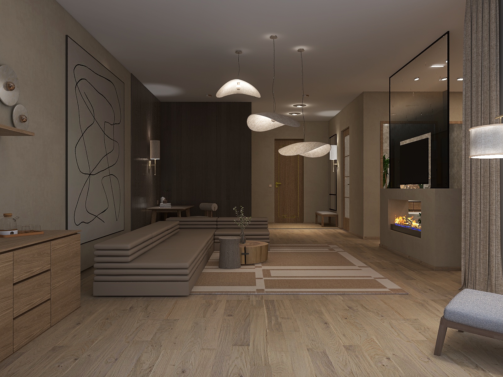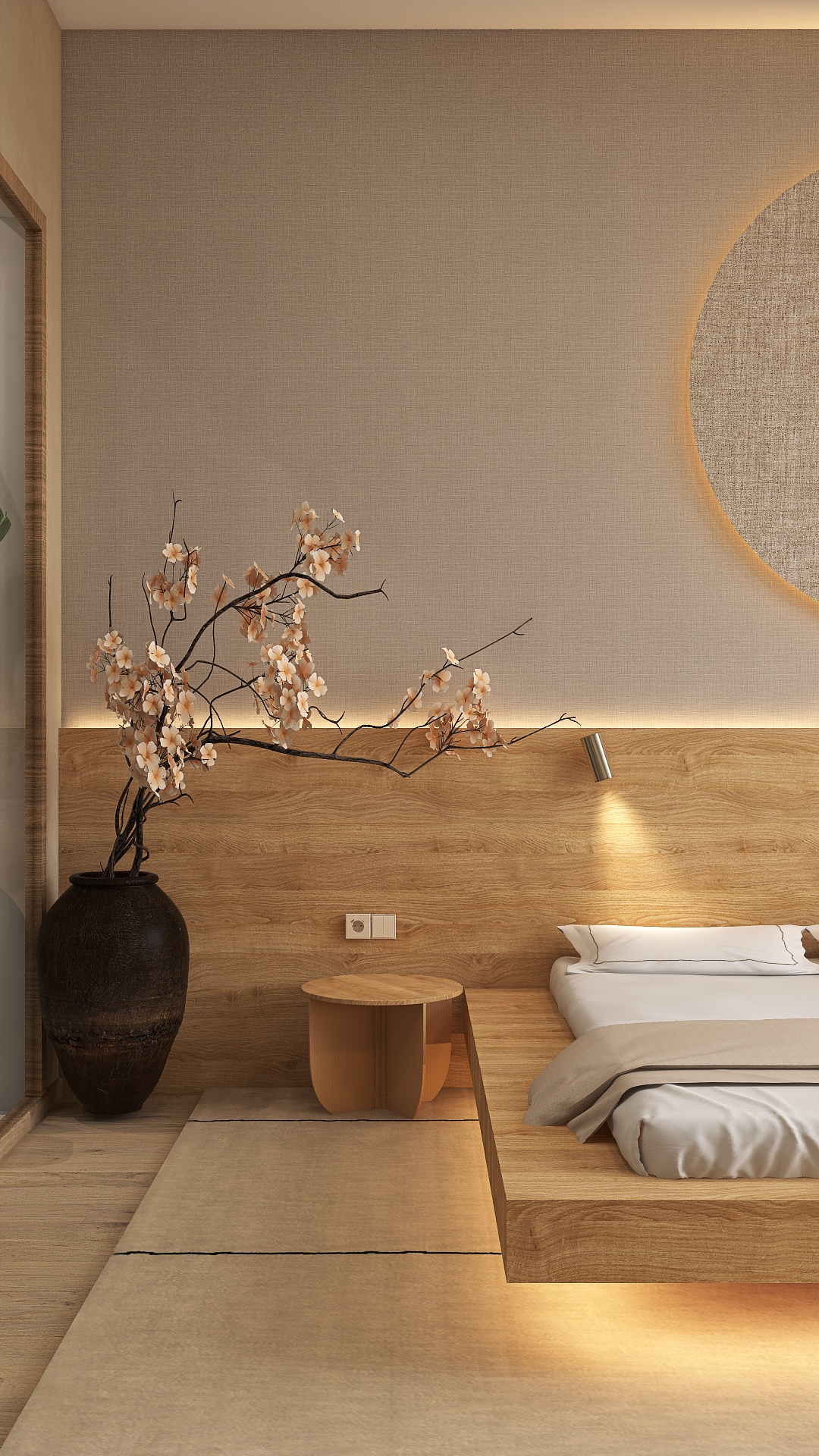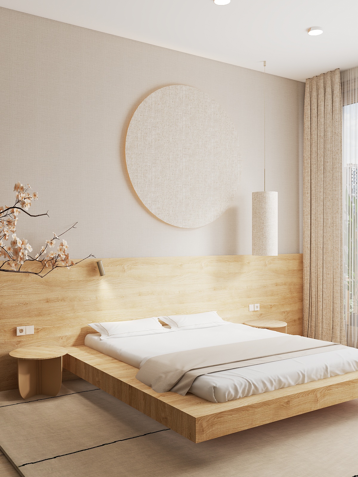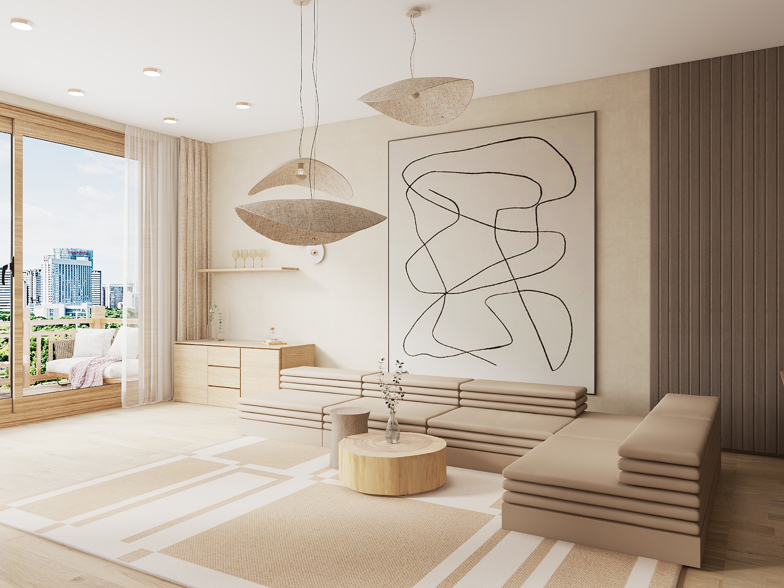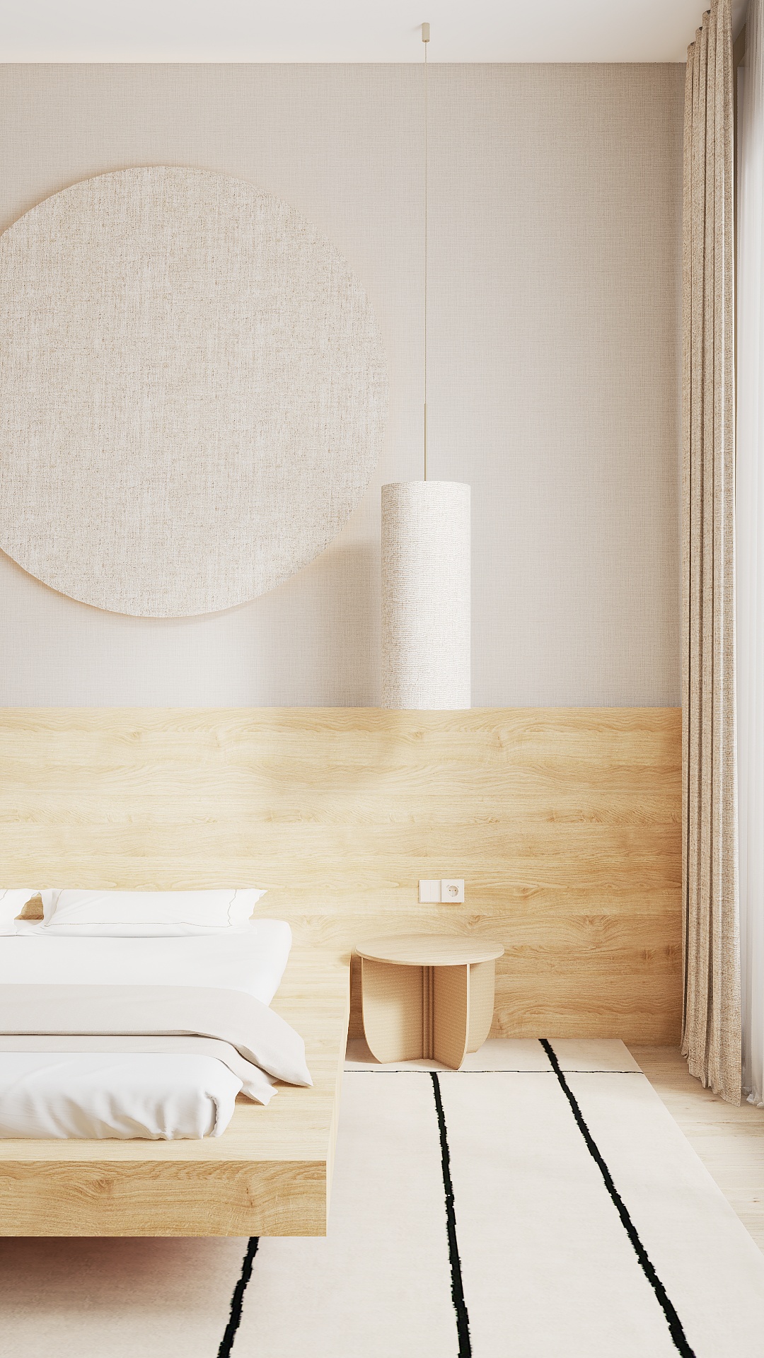Interjeras kurtas Japandi stiliumi – subtiliu japoniško minimalizmo ir skandinaviško jaukumo deriniu. Dominuoja natūralios medžiagos – medis, akmuo, linas – bei žemiški tonai, įkvepiantys atsipalaiduoti ir jaustis arčiau gamtos. Daug dėmesio skirta natūraliai šviesai ir augmenijai, kad erdvės atrodytų gyvos, kvėpuojančios ir harmoningos, pripildytos ramybės.