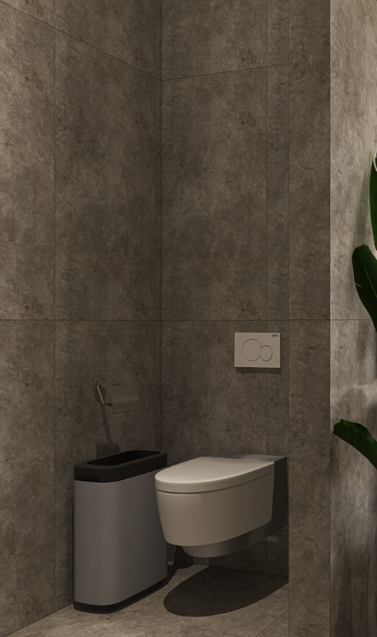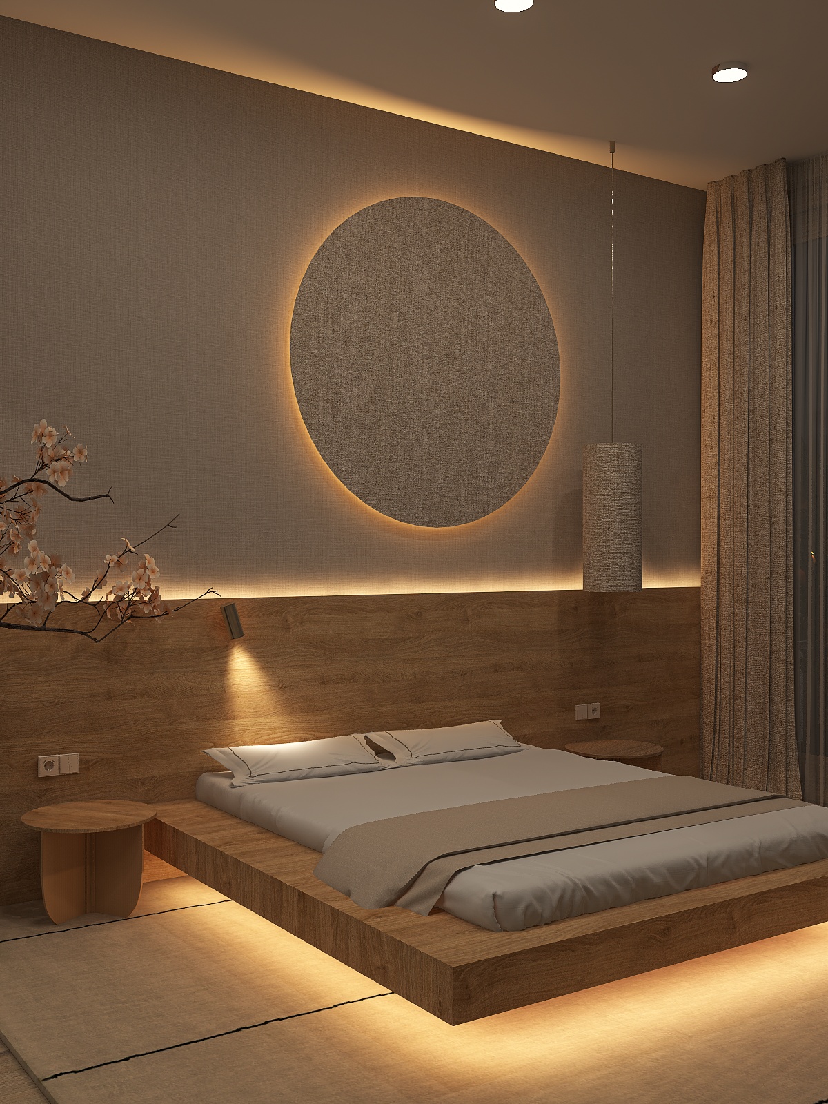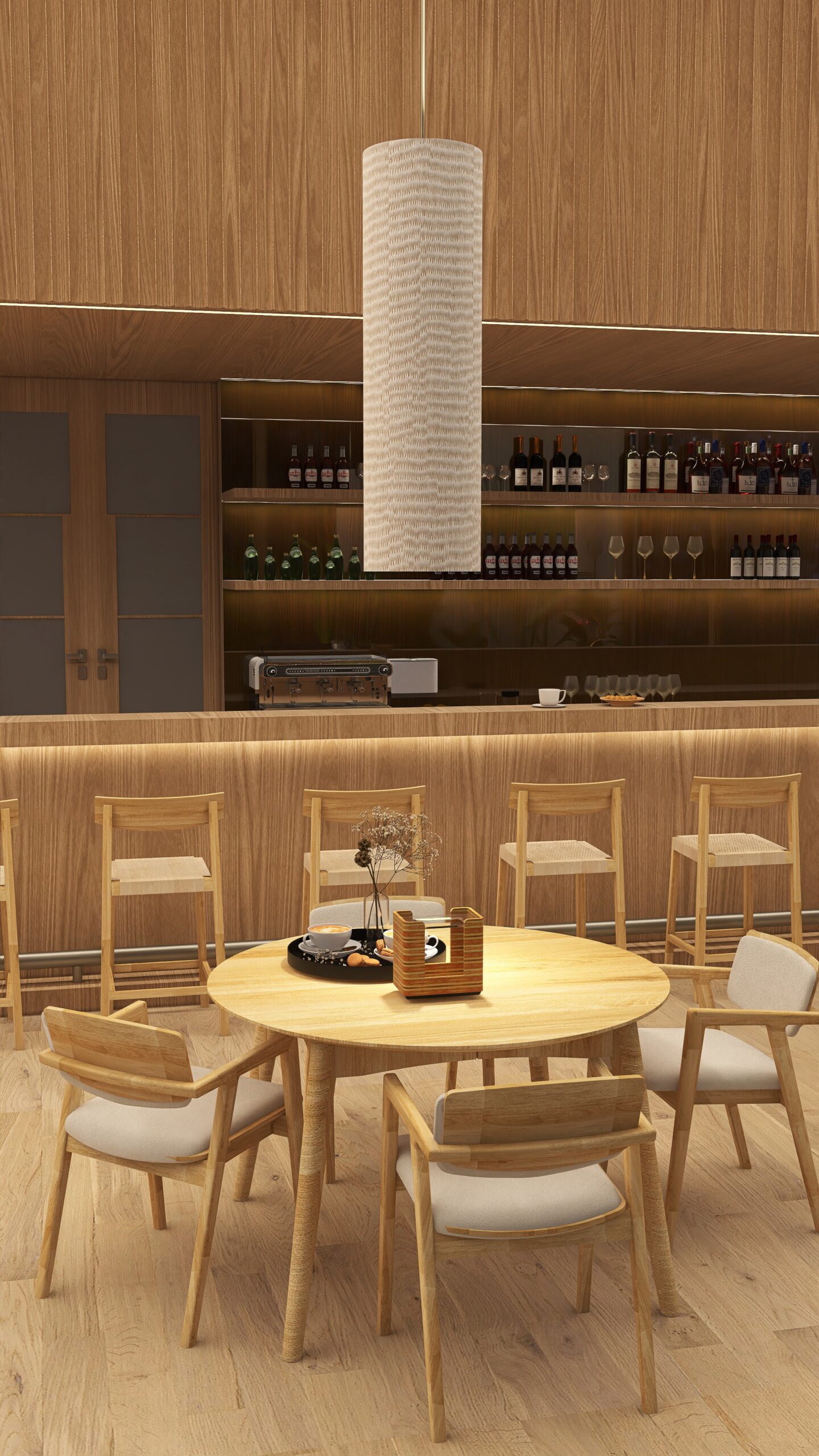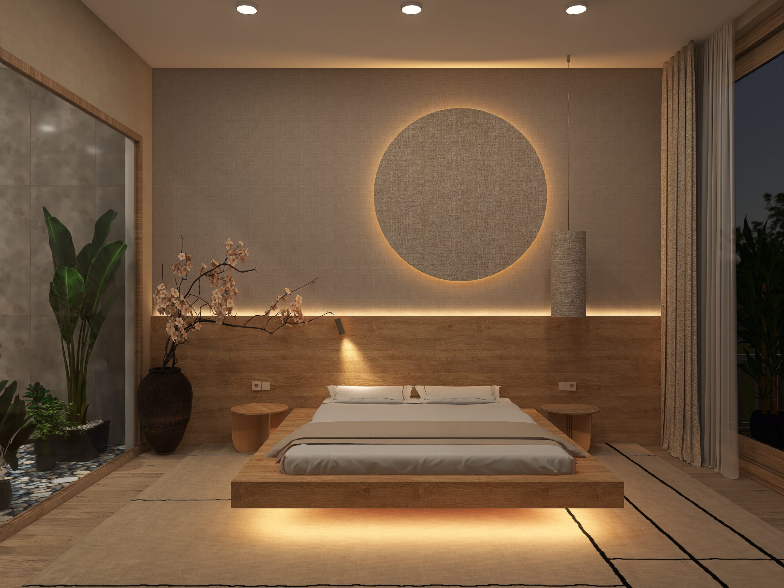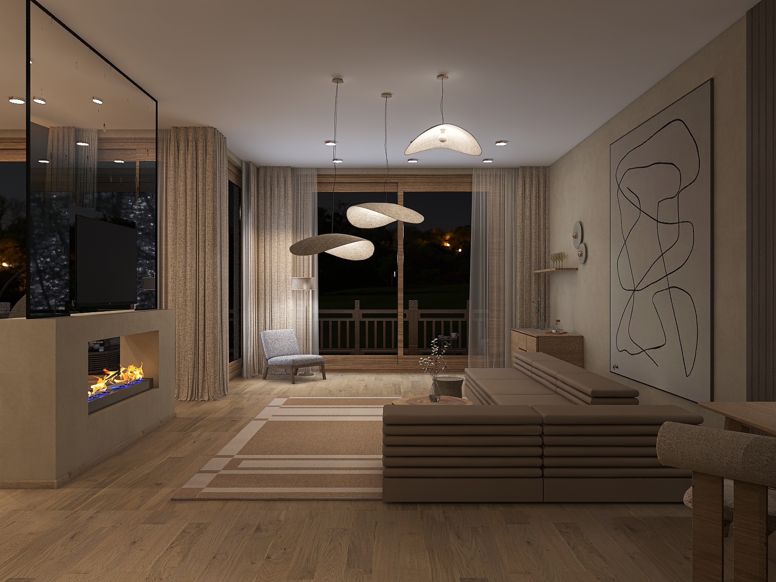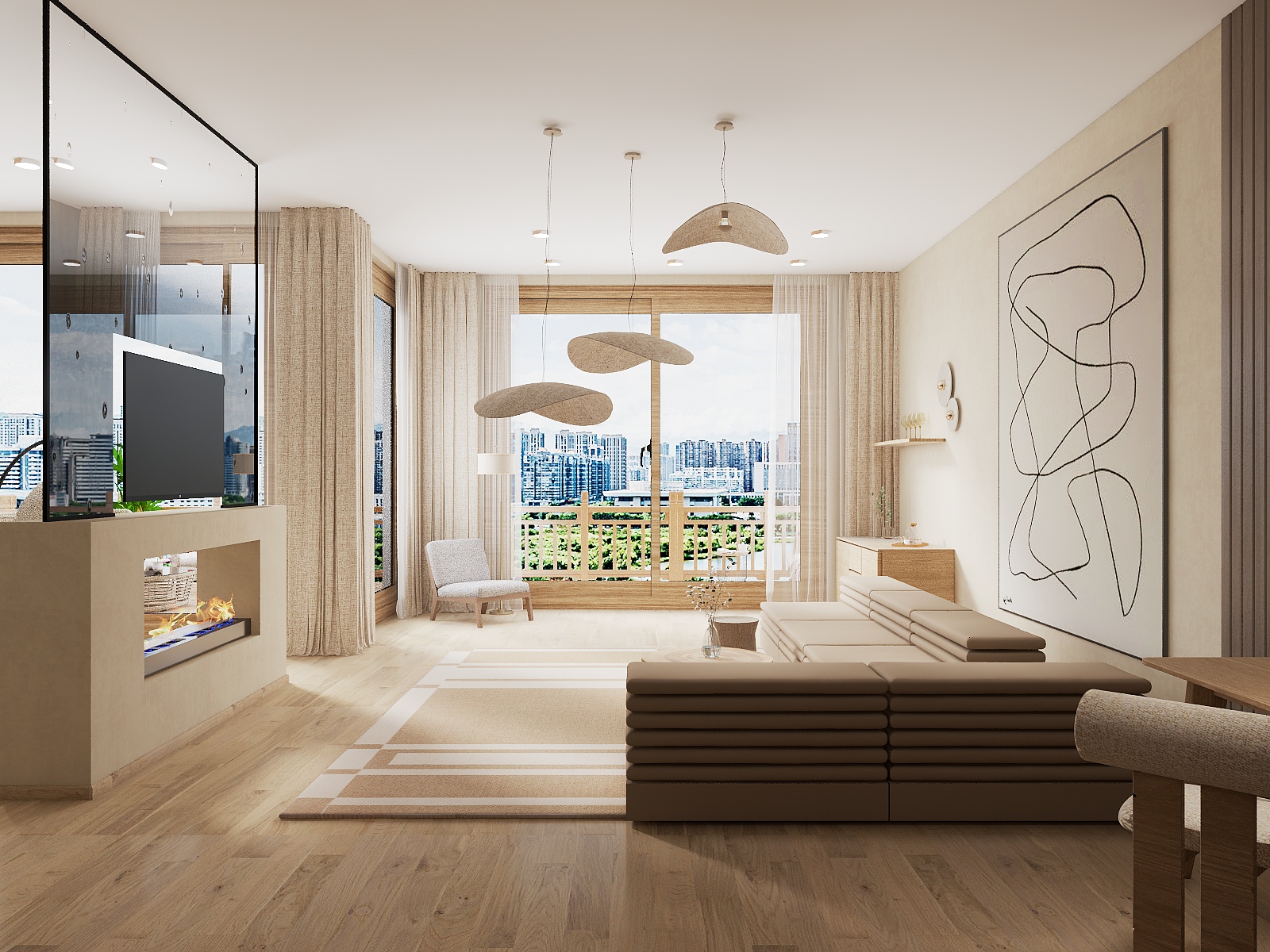 Interjeras kurtas Japandi stiliumi – subtiliu japoniško minimalizmo ir skandinaviško jaukumo deriniu. Dominuoja natūralios medžiagos – medis, akmuo, linas – bei žemiški tonai, įkvepiantys atsipalaiduoti ir jaustis arčiau gamtos. Daug dėmesio skirta natūraliai šviesai ir augmenijai, kad erdvės atrodytų gyvos, kvėpuojančios ir harmoningos, pripildytos ramybės.