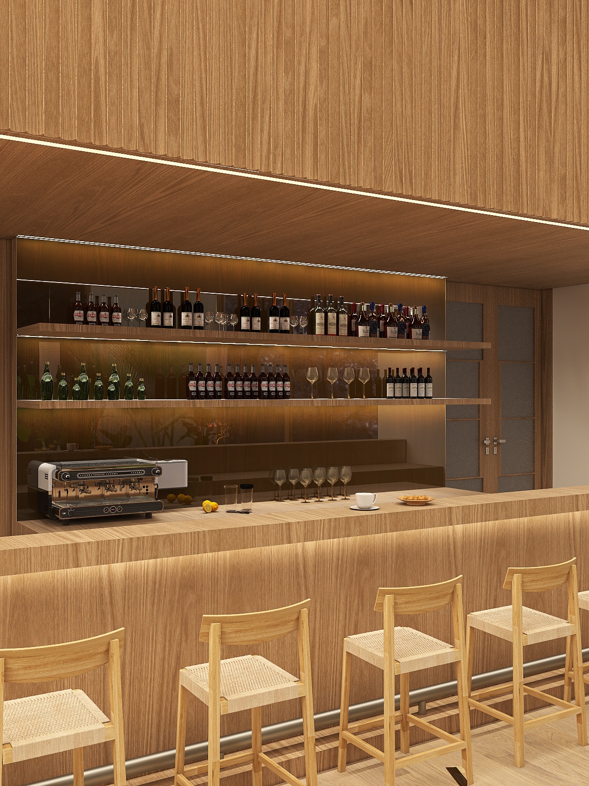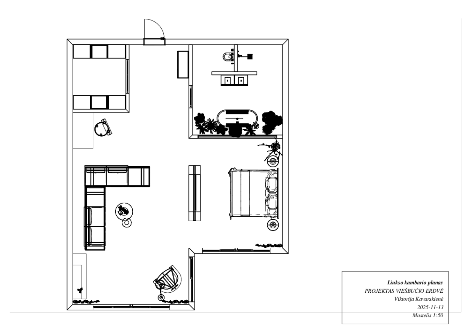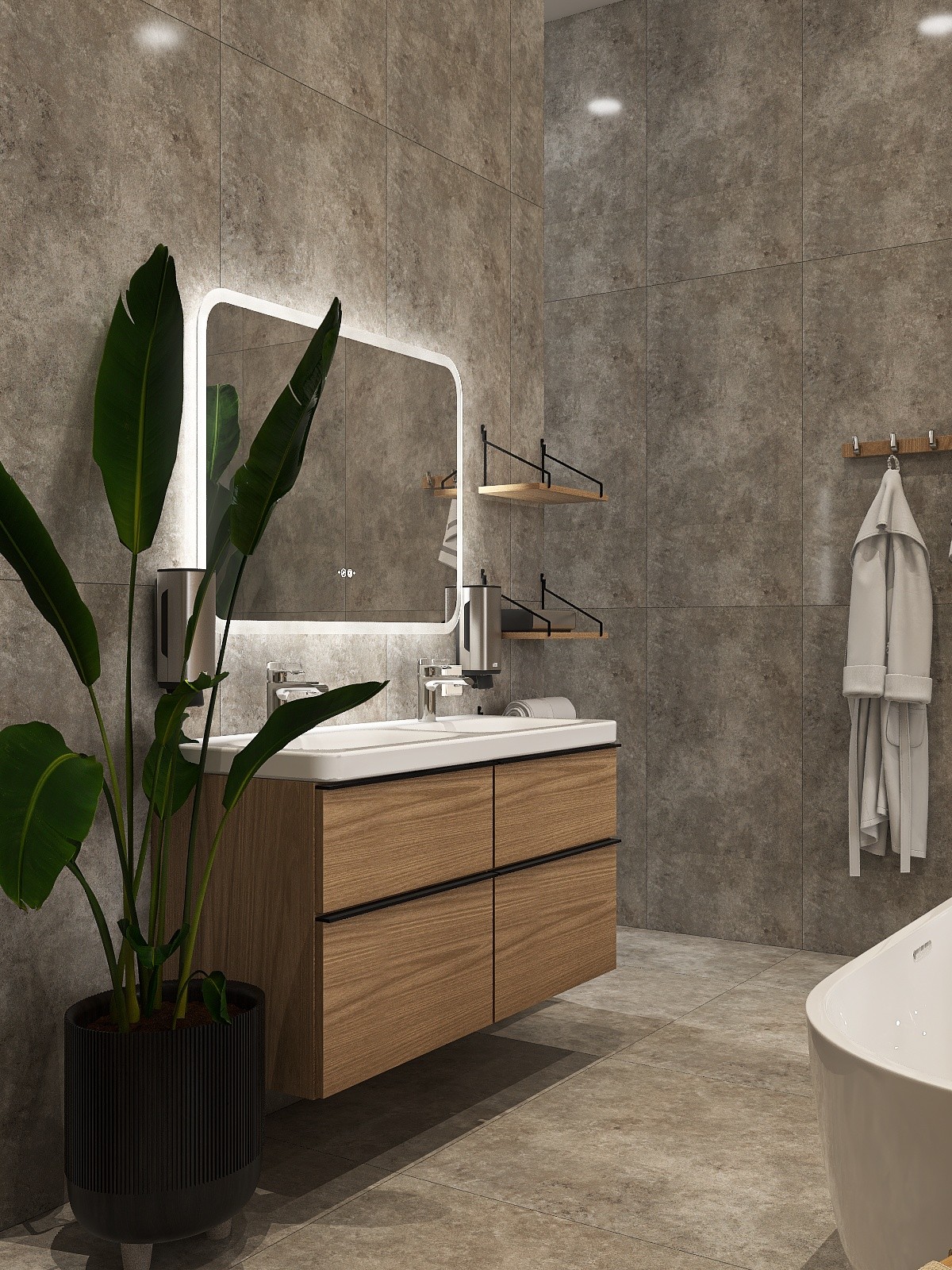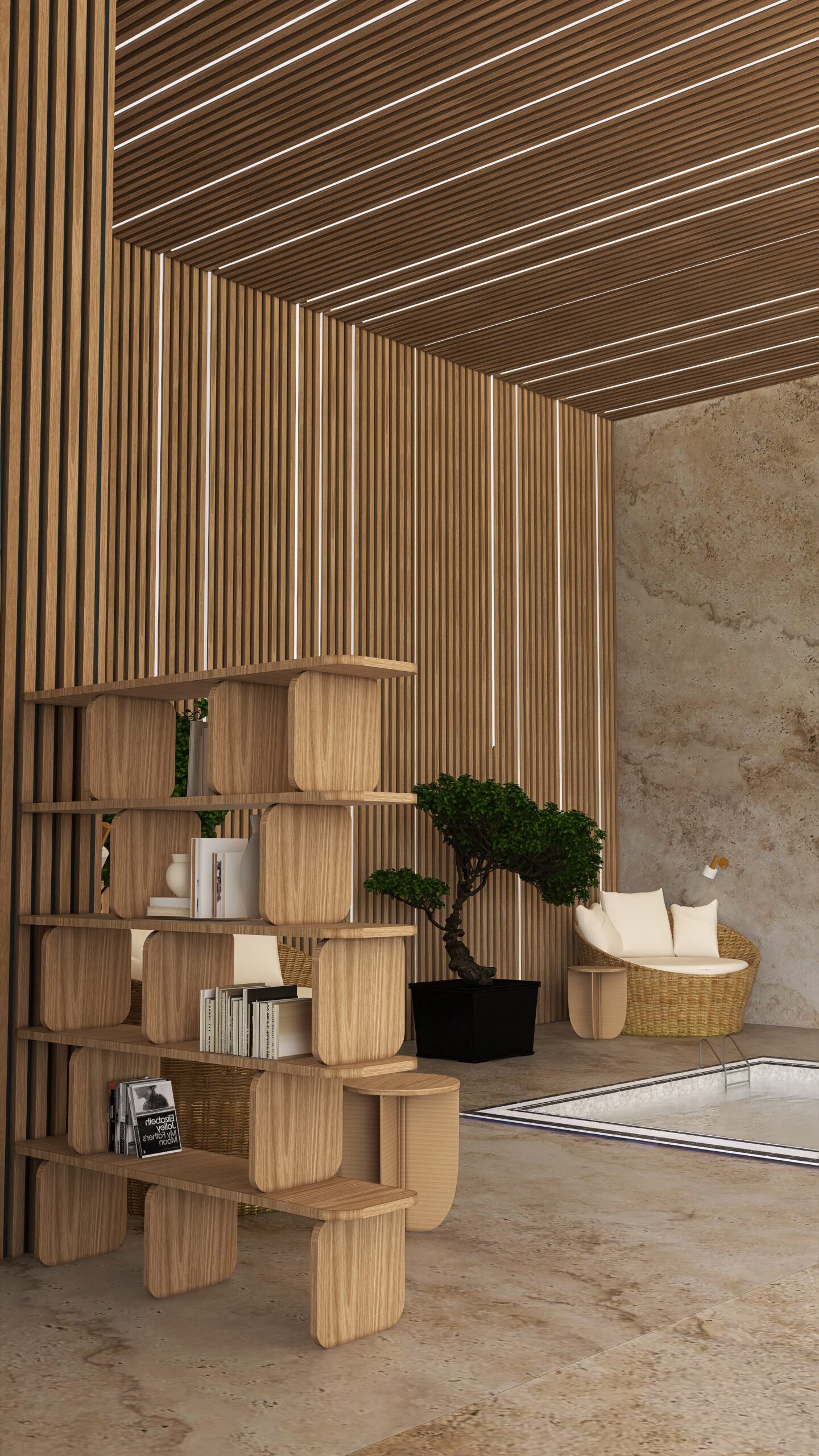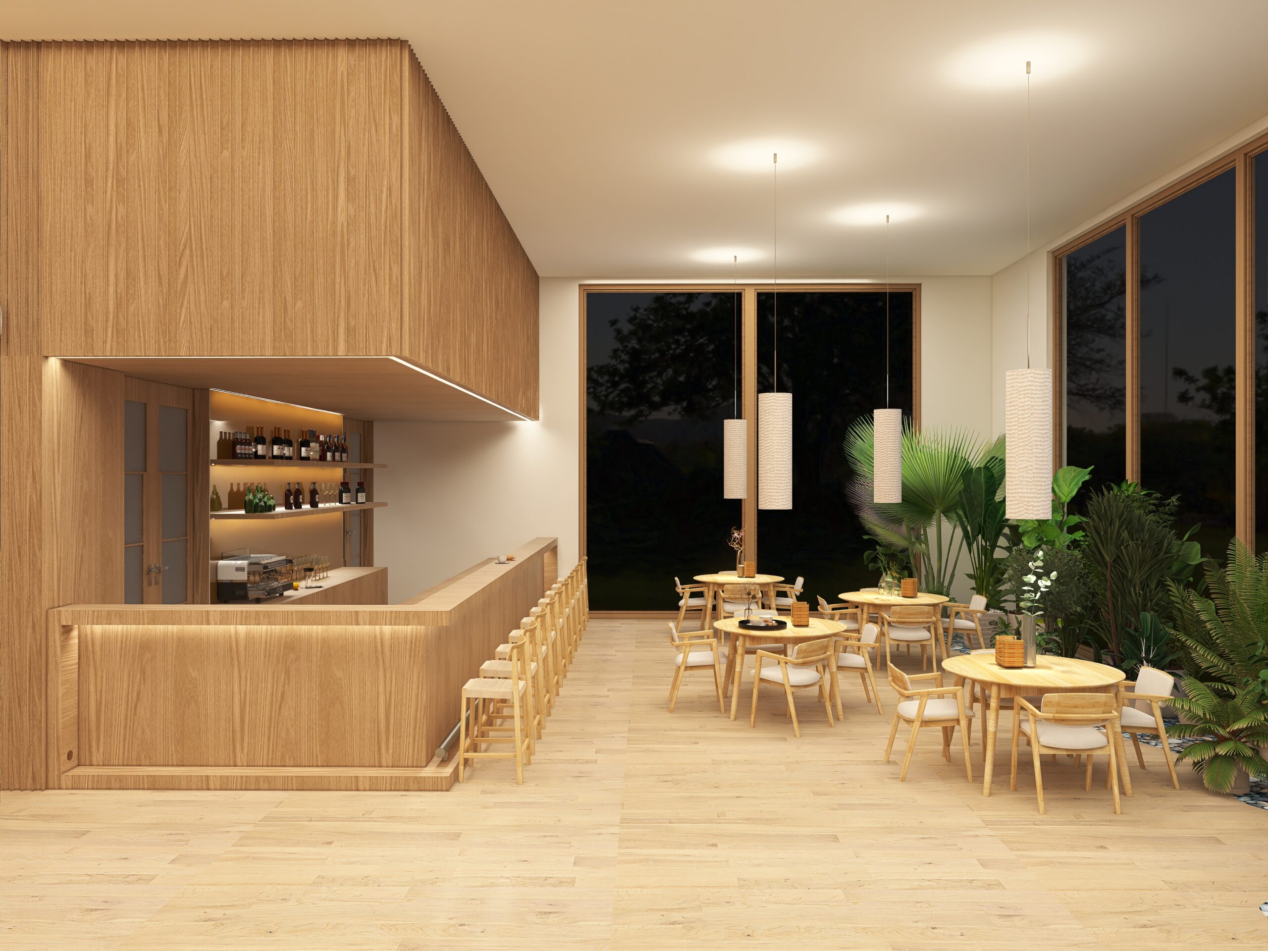 Interjeras kurtas Japandi stiliumi – subtiliu japoniško minimalizmo ir skandinaviško jaukumo deriniu. Dominuoja natūralios medžiagos – medis, akmuo, linas – bei žemiški tonai, įkvepiantys atsipalaiduoti ir jaustis arčiau gamtos. Daug dėmesio skirta natūraliai šviesai ir augmenijai, kad erdvės atrodytų gyvos, kvėpuojančios ir harmoningos, pripildytos ramybės.