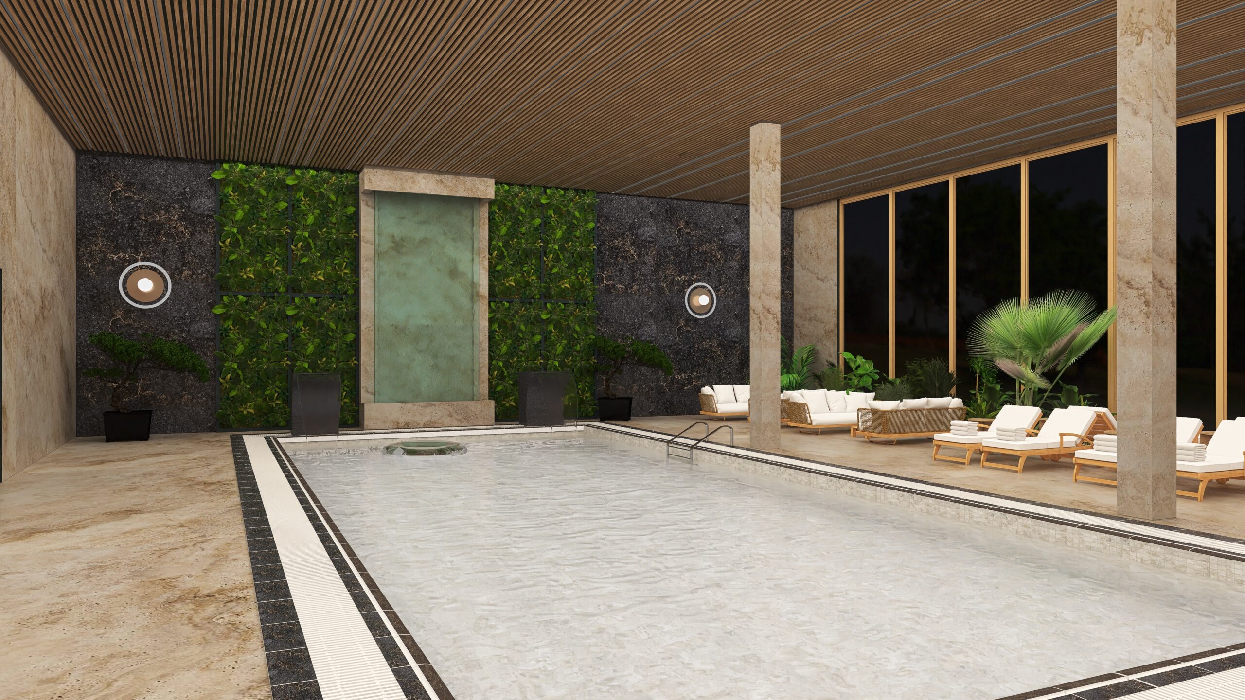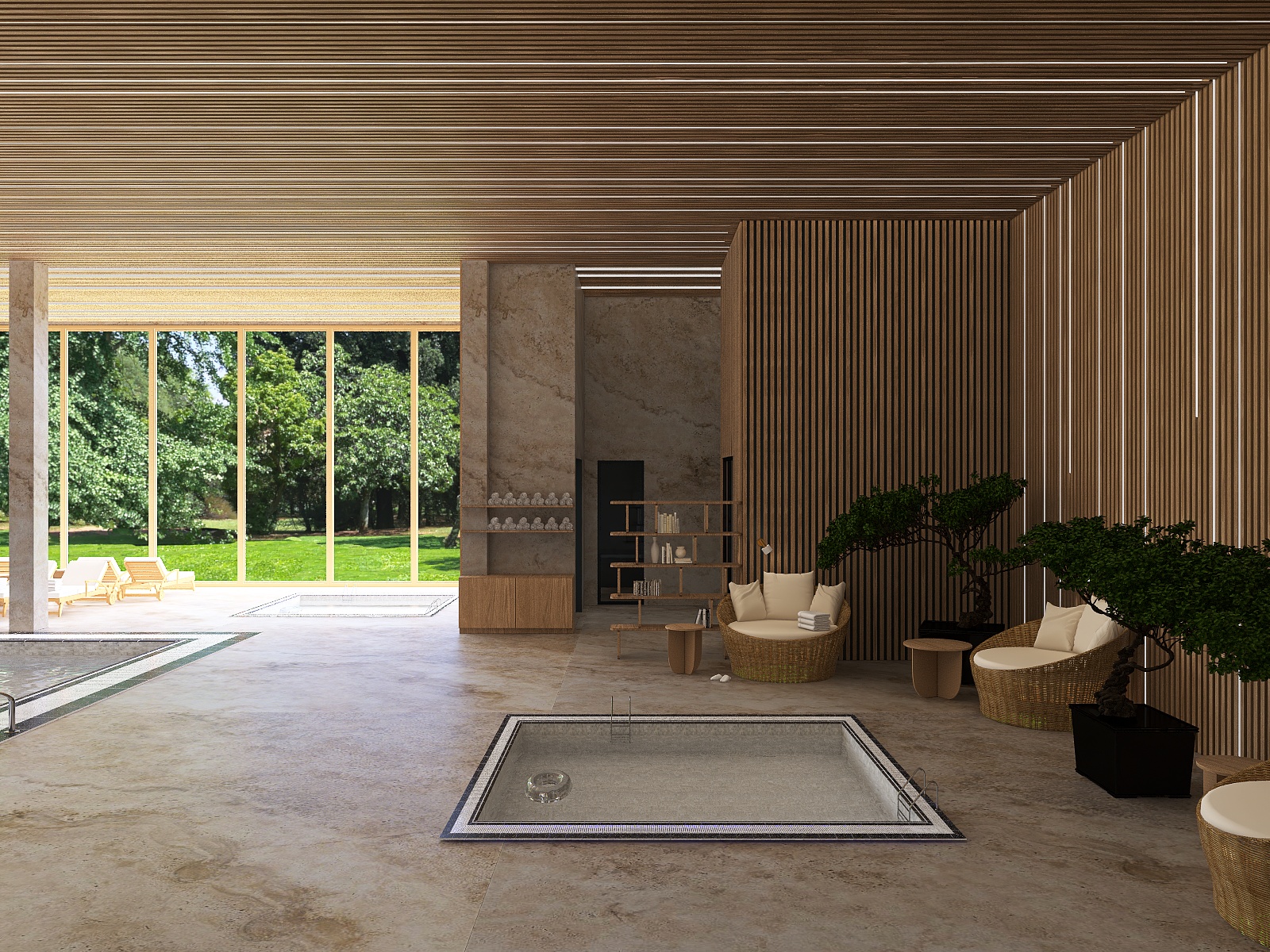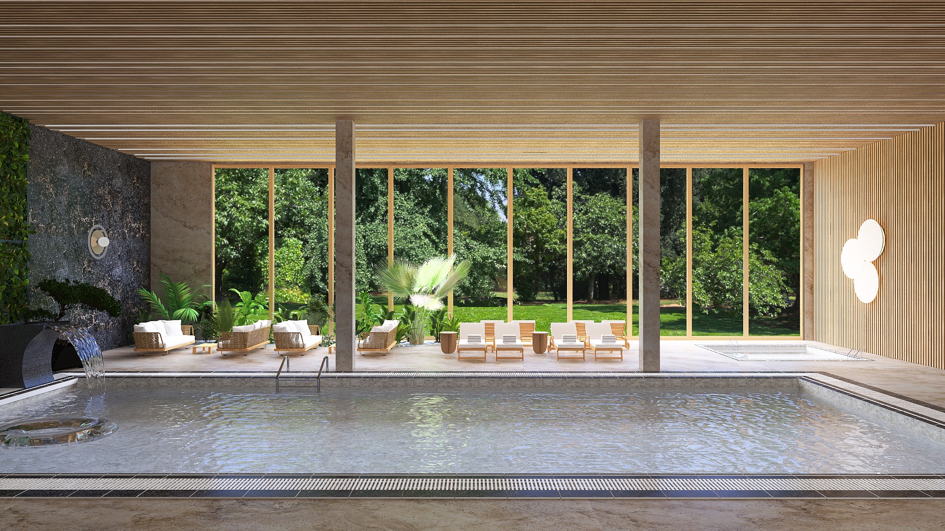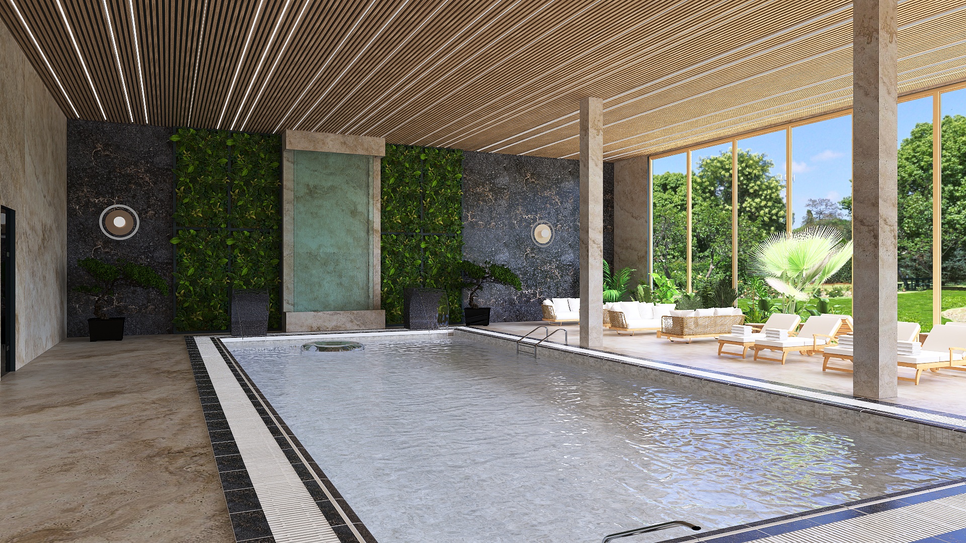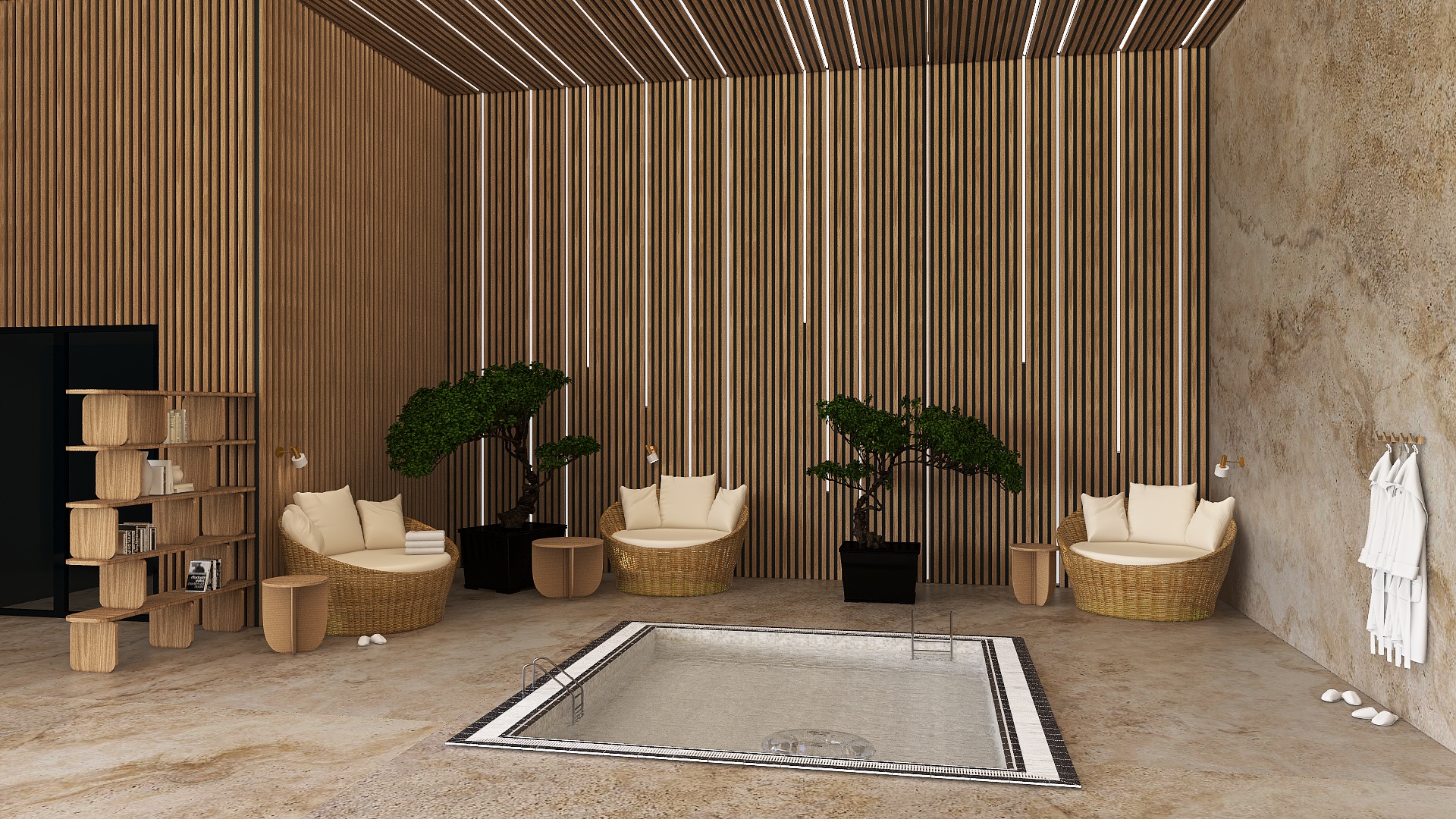 SPA erdvėje matoma šnabždanti tyla. Čia interjeras kuria vandens, šviesos ir žalumos dialogą – harmoningą jungtį, kviečiančią giliam atsipalaidavimui ir poilsiui. Natūralios medžiagos ir organiškų formų baldai sukuria lengvumo, švelnumo ir jaukios prabangos pojūtį.