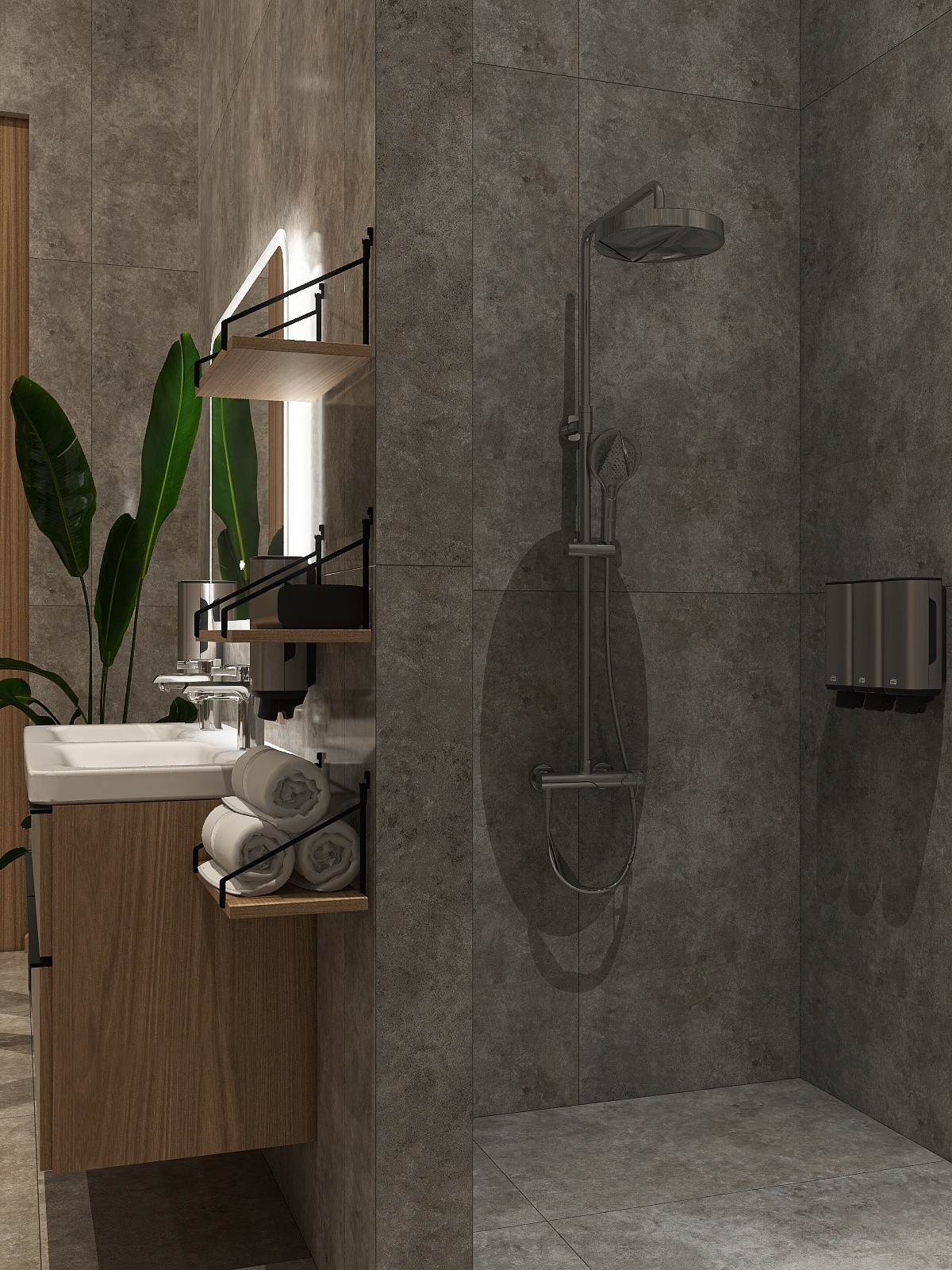 RUBINETA. Vonios kambariuose įrengti modernūs Cosy-18 praustuvo maišytuvai, pasižymintys išskirtiniu dizainu, kokybiška chromuota danga ir ekonomišku vandens naudojimu, užtikrinant tiek estetiką, tiek patogų kasdienį naudojimą. Pasirinkta Rainfall + Cosythermo-10 (SW) dušo sistema. Termostatinis maišytuvas palaiko pastovią, jūsų pasirinktą vandens temperatūrą, todėl naudojimasis visuomet patogus ir be netikėtų pokyčių. Pasukamas snapas – divertorius leidžia lengvai rinktis tarp vonios ir dušo funkcijų, o plati RAINFALL galva suteikia malonią, atsipalaiduoti padedančią vandens srovę. Dėl harmoningos išvaizdos ir kokybiškų detalių ši sistema sujungia prabangą ir kasdienį patogumą.