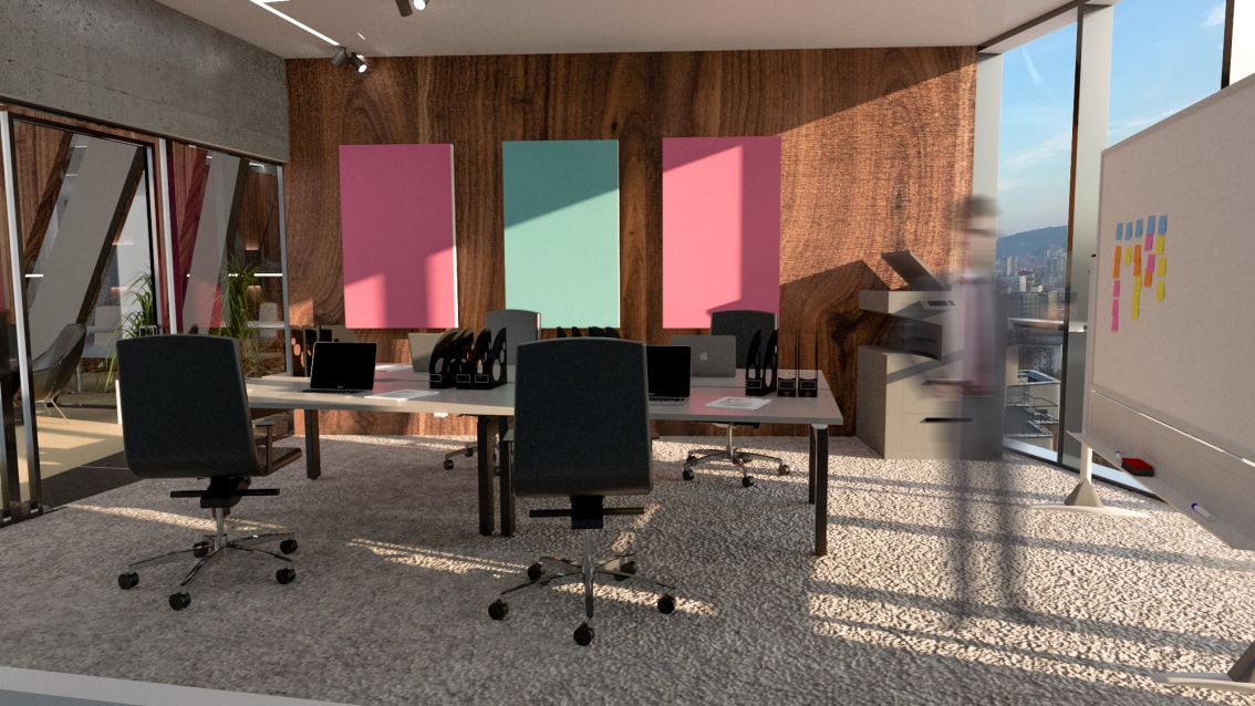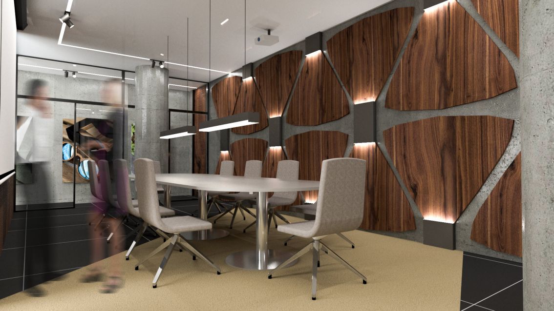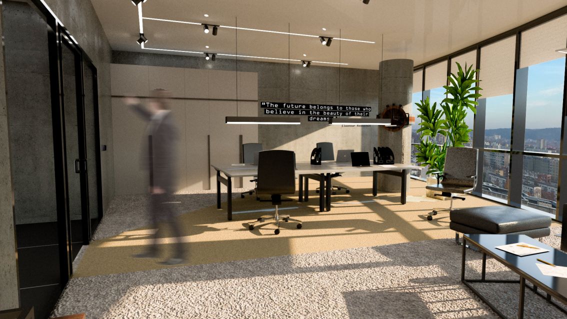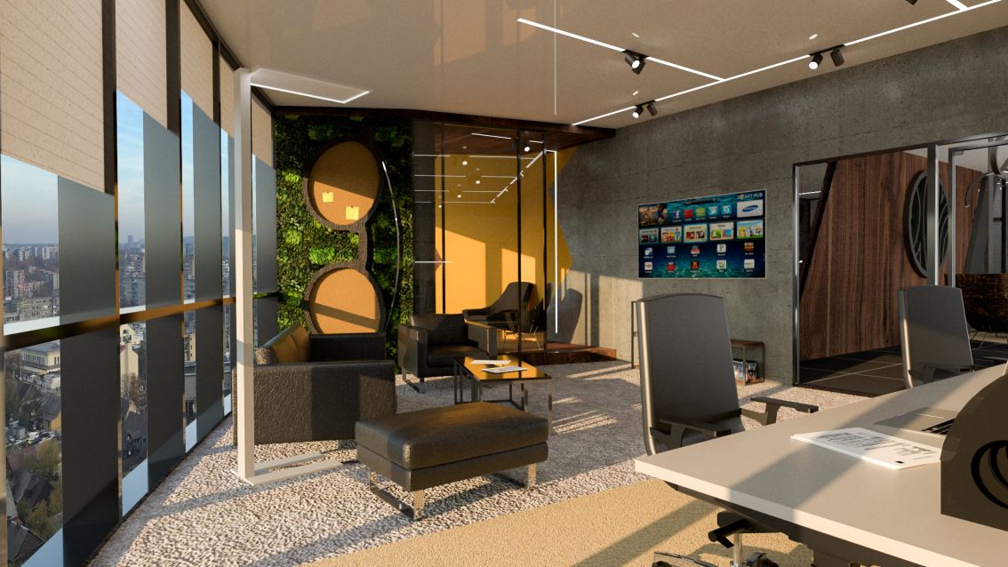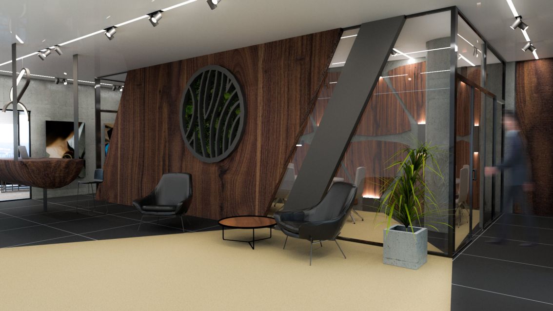 Biuras ne tik reprezentuoja savo įmonės įvaizdį, bet yra ir motyvacinė erdvė darbuotojams, todėl labai svarbu sukurti ergonomiškas darbo vietas. Taip pat šiomis dienomis inovacijos neatsiejamos norint suteikti aukštą komforto lygį. Mano biuro koncepcija norima perteikti šiuolaikišką, patogią darbo vietą. Kaip firminį ženklą pasirinkau įmonę „Booo“, kuri gamina medinius aksesuarus. Kad pabrėžčiau produkto ir interjero sąveiką, jų parduodamus aksesuarus paverčiau akcentinėmis detalėmis. Taigi kaklo papuošalas varlytė virsta dekoro siena pasitarimų zonoje, gigantiški akiniai darbo erdvėje tarnauja kaip užrašų lenta, o laikrodis virsta kolonos elementu.