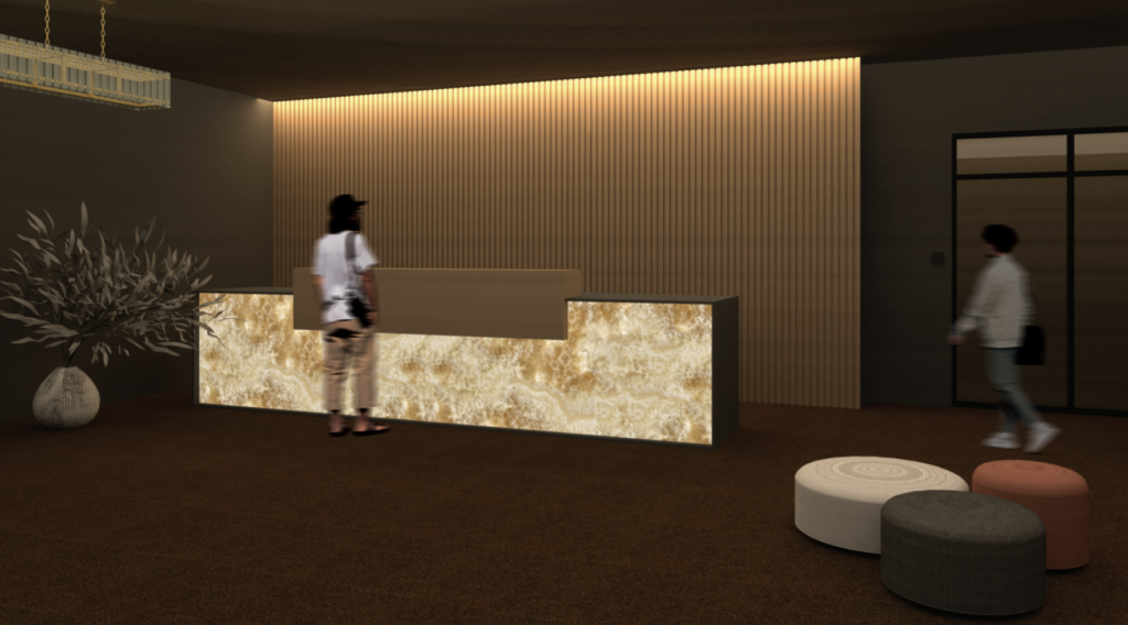 Užduotis: koncepcijos aprašymas, planas (2d išplanavimas) ir vizualizacijos (interjero) demo viešbučio įrengimui. Projekte sukurti novatoriškus, ergonomiškus sprendimus, naudojant partnerių produktus.
