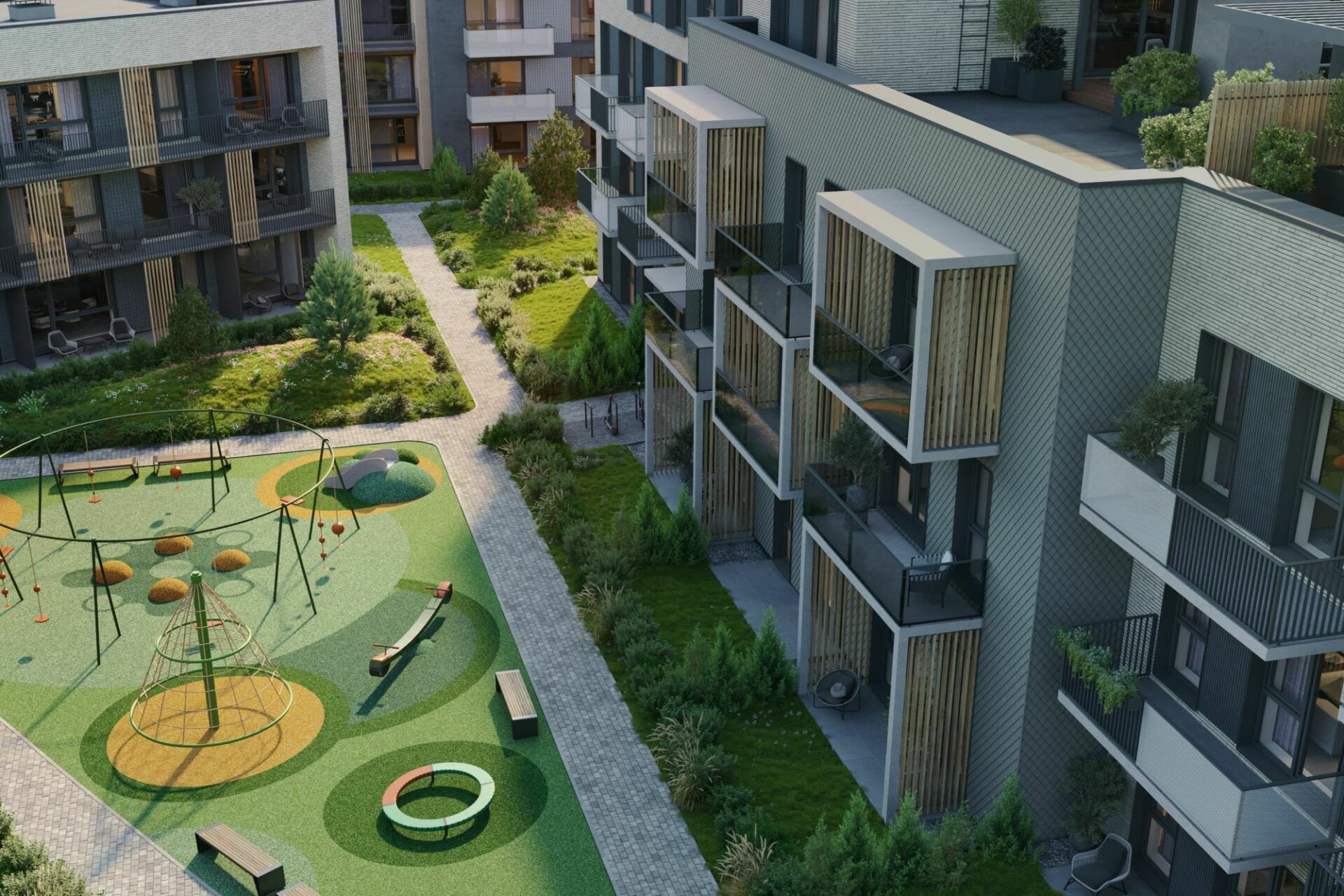 įterpti požemines automobilių aikšteles, suplanuoti skirtingų funkcijų pastatus. Tačiau galiausiai sklypo pobūdis tapo privalumu – čia įrengtos originaliai atrodančios pakopomis išdėstytos kiemelių terasos, o tai, kad pastatai stovi skirtinguose lygiuose, leido išsaugoti vaizdą pro langus – ir administraciniai pasatai, ir gyvenamieji namai suprojektuoti taip, kad iš jų paskutinių