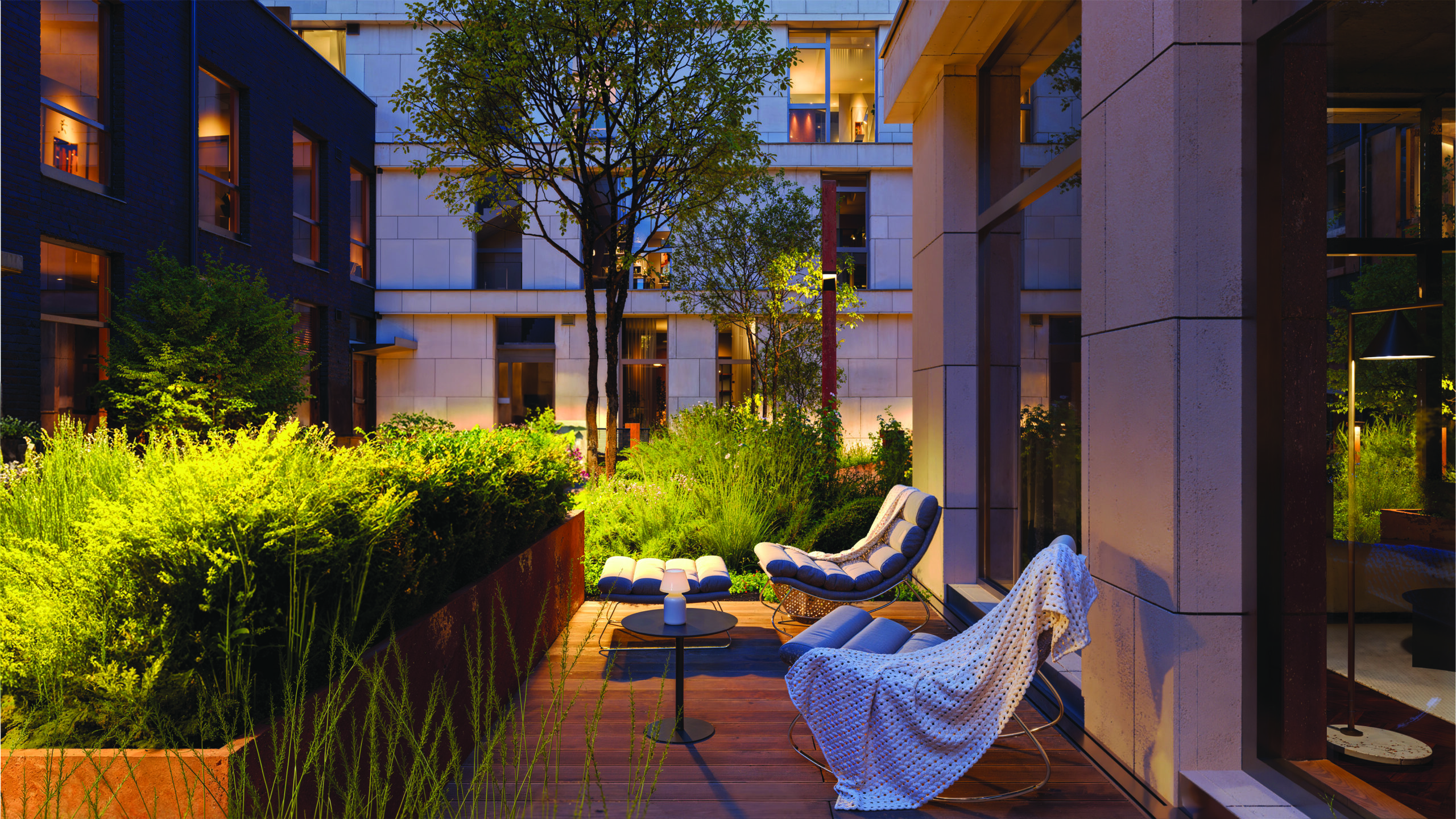 Ypatingą vaidmenį projekte architektai skyrė pastatų fasadų apšvietimui. Iš gatvės pusės integruoti fasadiniai šviestuvai su RGB šviesos diodais suteikia galimybę kurti norimą nuotaiką: kasdienybėje fasadai apšviečiami ramia balta šviesa, o jei yra proga, jie gali nušvisti teminėmis spalvomis – nuo kalėdinių motyvų iki valstybinių švenčių simbolikos. Spalvos gali būti ir statiškos, ir lengvai dinamiškos, švelniai kintančio intensyvumo – pavyzdžiui, galima atvaizduoti vėliavos plevenimą vėjyje. Apšvietimas valdomas automatiniu būdu – sutemus įsijungia iš anksto suprogramuoti apšvietimo scenarijai.