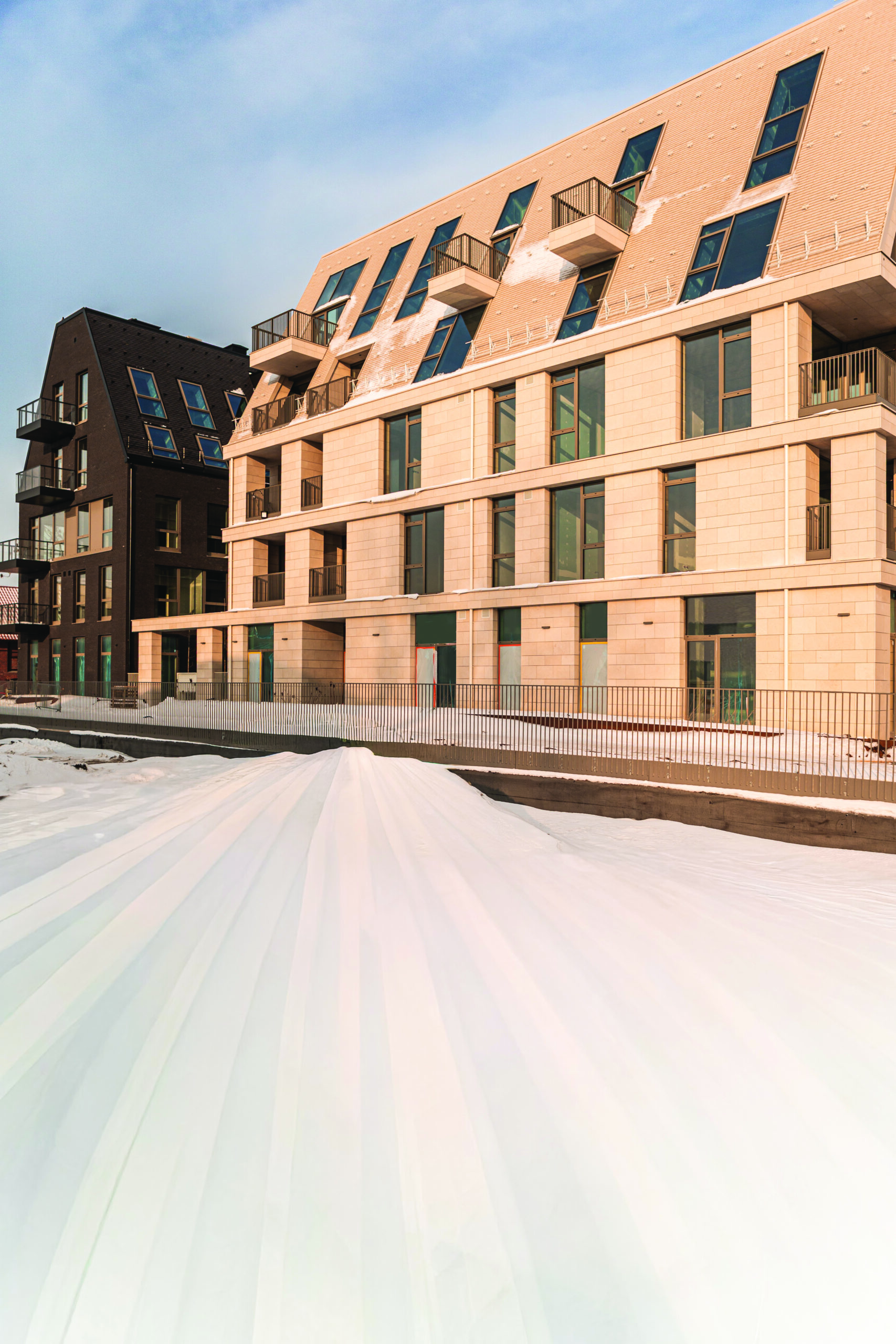 „Labai daug nestandartinių sprendinių gimė diskutuojant su architektais ir profilių tiekėjais. Tam tikrose pastato fasado zonose langų junginiai sudaro vieningą maždaug 25 m juostą, kuri vietomis sumontuota Z forma. Teko analizuoti, kaip sumontuoti langų sistemą, kad ji atitiktų ne tik šiluminės varžos, garso charakteristikas, bet ir būtų estetiška“, – apie netipinių konstrukcijų montavimą pasakoja R. Gajauskas ir priduria: išeitis rasti pavyko. Langų juosta sumontuota sklandžiai, su papildoma kiekvienam butui garso izoliacija.