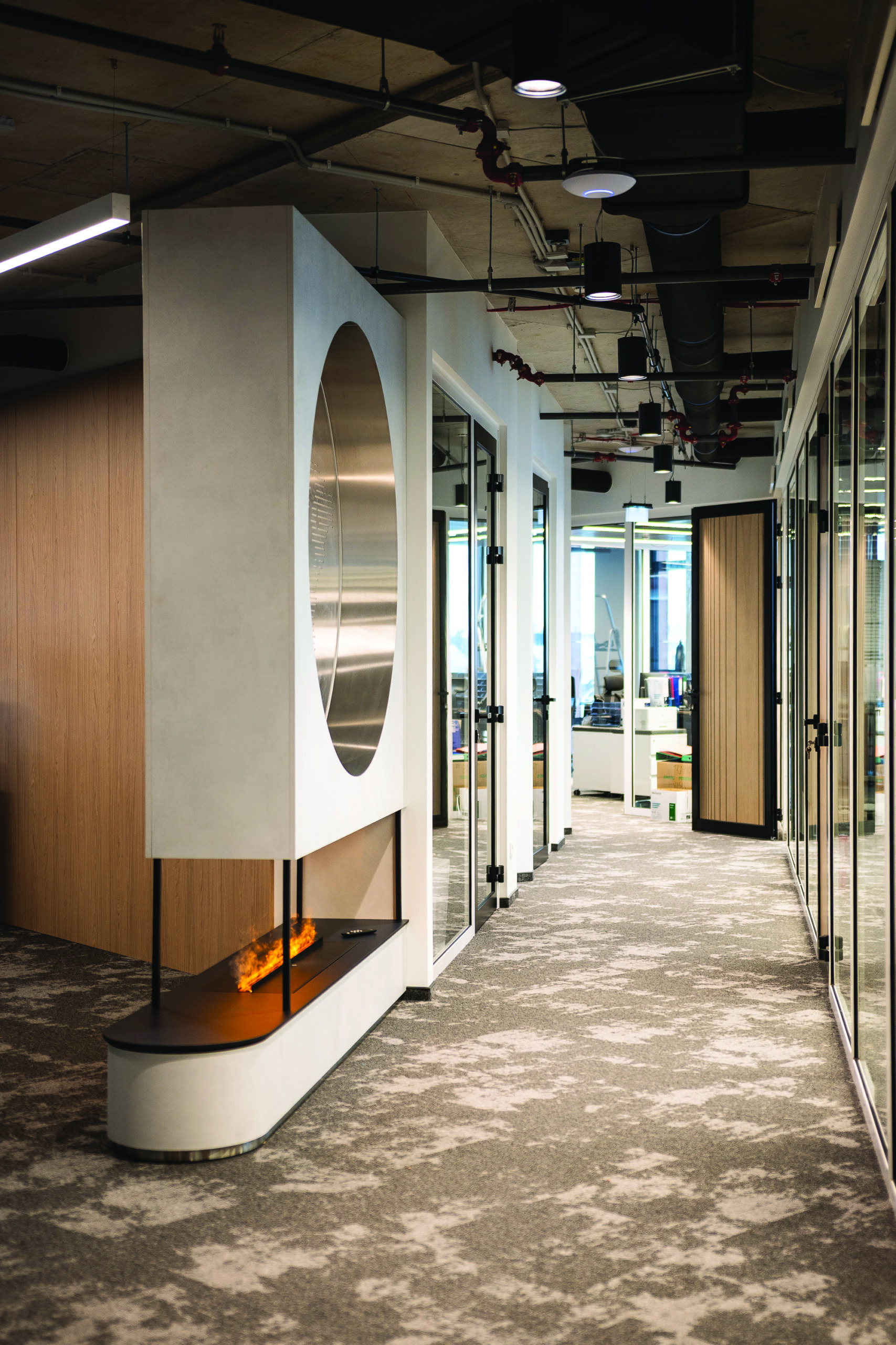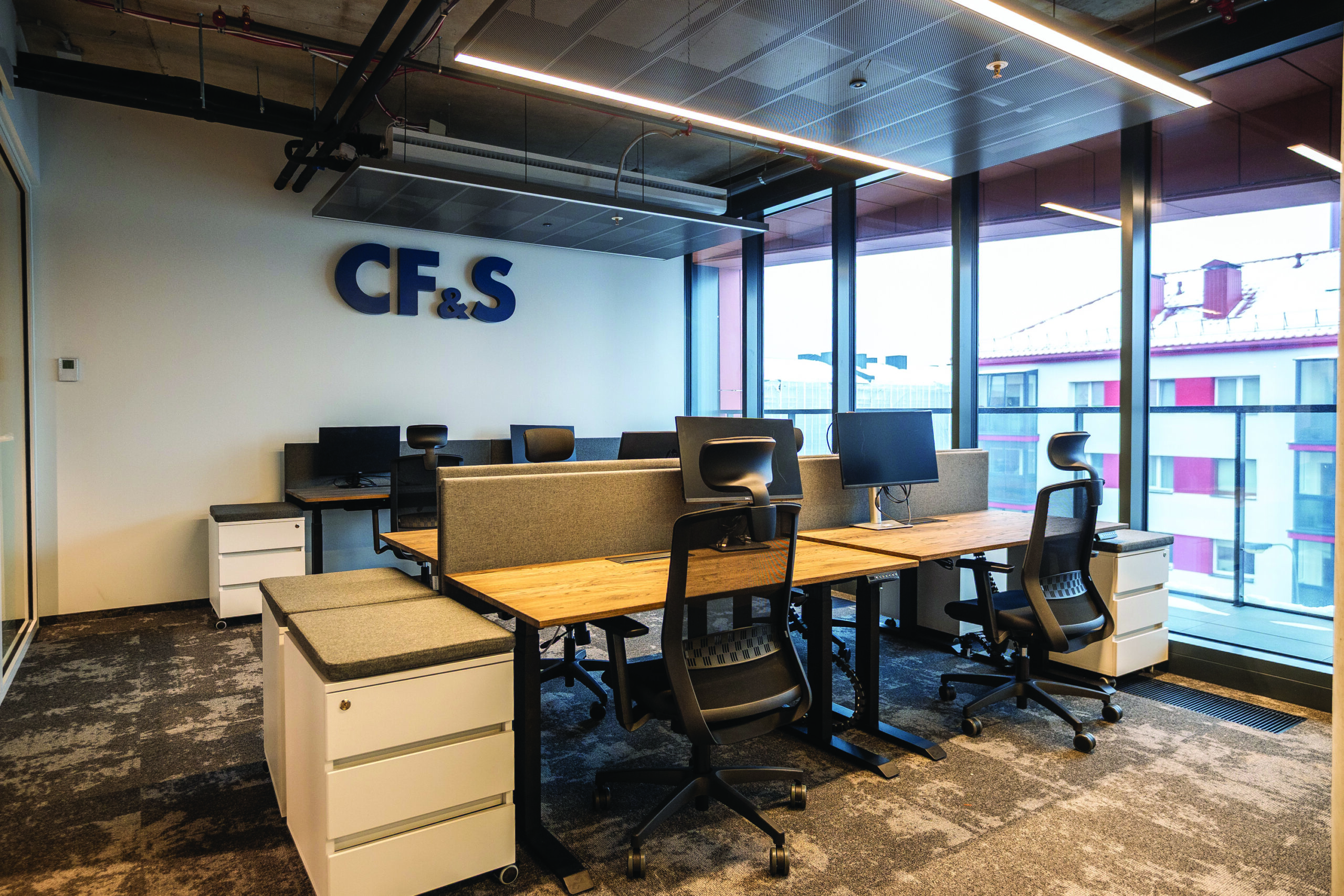 Biurų erdvėse išlaikytas šiuolaikinis techno stilius: paliktos atviros betoninės konstrukcijos, neslepiamos vėdinimo sistemos ir kiti inžineriniai elementai. Jaukumo šioms erdvėms suteikia ir tinkamą akustiką užtikrina specialiai šiam objektui „Gaudrės“ suprojektuotos ir pagamintos pakabinamos lubų salos. Jose integruoti ne tik apšvietimo, bet ir akustiniai, priešgaisriniai sprendiniai, be to, jos paslepia stambesnius vėdinimo įrenginius ir pagerina erdvės vaizdą.