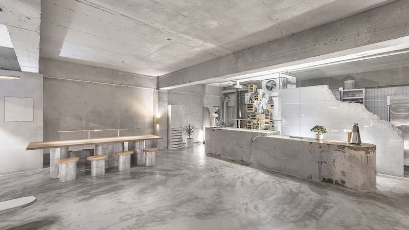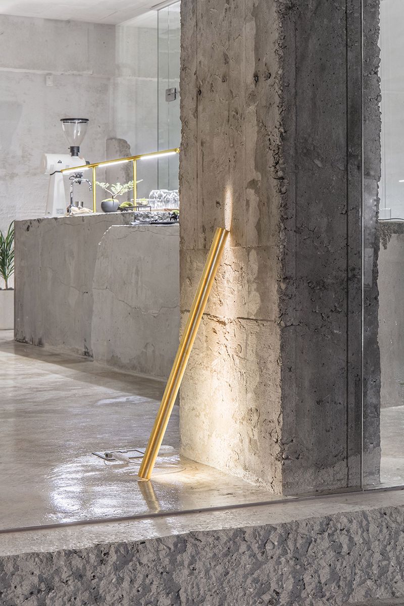 Betonas, metalas arba akmuo šiandien yra realūs baldų elementai, nors tai skamba neįtikėtinai. Seulo dizaineris Jeonghwa Seo sukūrė lieto aliuminio ir žalvario baldus kavinei ir vyno barui. Baldai buvo gaminami pagal užsakymą erdvei, kuriai būdingas neapdoroto betono interjeras. Norėdamas jį papildyti, dizaineris pasirinko dirbinius iš aliuminio, žalvario ir ąžuolo. Dideli stalviršiai, kėdžių sėdynės bei suolų lentos uždėtos ant masyvių stovų, pagamintų iš lieto aliuminio lakštų, suvirintų pailgos elipsės forma. Suvirinimo linijos nenušlifuotos, kad būtų matyti gamybos procesas. Kėdėms ir stalviršiams pasirinktas ąžuolas. Apšvietimo elementams daugiausia naudojamas žalvaris. Siekiant išreikšti erdvės tęstinumą, suoliukai, žibintai ir pavieniai akmenys išdėlioti erdvėje, kurią dalija tik stiklo pertvaros. Kavinės interjere naudojama daug stiklo – iš jo pagamintas kavinės fasadas, t. y. visa erdvė kiaurai permatoma. Norėdamas pabrėžti atvirumą, dizaineris vieną suoliuką tarsi perkišo per priekinę stiklinę kavinės sieną – įrengė sėdimas vietas ant jo ir kavinėje, ir lauke. Kavinės grindys pakeltos virš gatvės lygio ir pagamintos iš vienos betoninės plokštės. Betono kraštai palikti atviroje lauko terasoje, kad būtų parodytas vientisas masyvas. Sieninės ir grindų lempos maksimaliai išnaudojamos tekstūrai atskleisti. O prie vienos vidinės sienos pastatyta aukštai iškilusi vyno lentyna, padaryta iš senų vyno dėžių – tarsi vyno bokštas iš medienos ir plytų. Išilgai stiklinės priekinės fasado sienos išrikiuotas betoninis „kubų miškas“, ant kurio statomi gėlių vazonai.