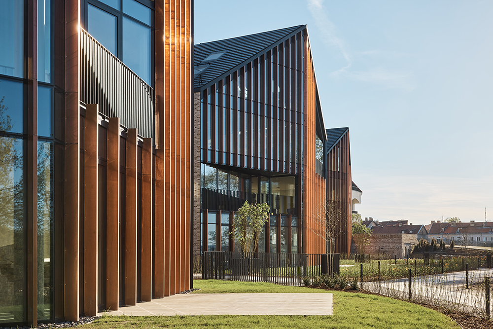 Taip pat šiam unikaliam projektui pasirinktos labiausiai užsakovo lūkesčius atitikusios „Reynaers Aluminium“ langų sistemos. „Nuolatos atnaujinama ir tobulinama fasadinė didesnės izoliacijos sistema „Reynaers CW50 HI“ šiame projekte buvo naudojama net keliais skirtingais variantais: dalis stiklinio fasado yra struktūrinio tipo (kai iš lauko pusės nėra jokių matomų stiklo prispaudimo profilių), dalis fasado yra su plokščiaisiais dangteliais, kurių nesimato iš tolo, tačiau juos galima pamatyti priėjus arti pastato, o įstiklintų plokštumų perimetru panaudoti paaukštinti, variu dengti apdailiniai dangteliai, suteikiantys pastatui grakštumo ir prabangos. Tokio fasado sprendimo nesutiksime visame Pabaltijyje. Džiugu, kai geras sistemas gerais langais paverčia profesionalus langų gamintojas, mokantis išspręsti ir suderinti tikrai sudėtingus mazgus“, – apie naudotus sprendimus pasakoja UAB „Reynaers Aluminium“ vadovas Linas Kėvelaitis.