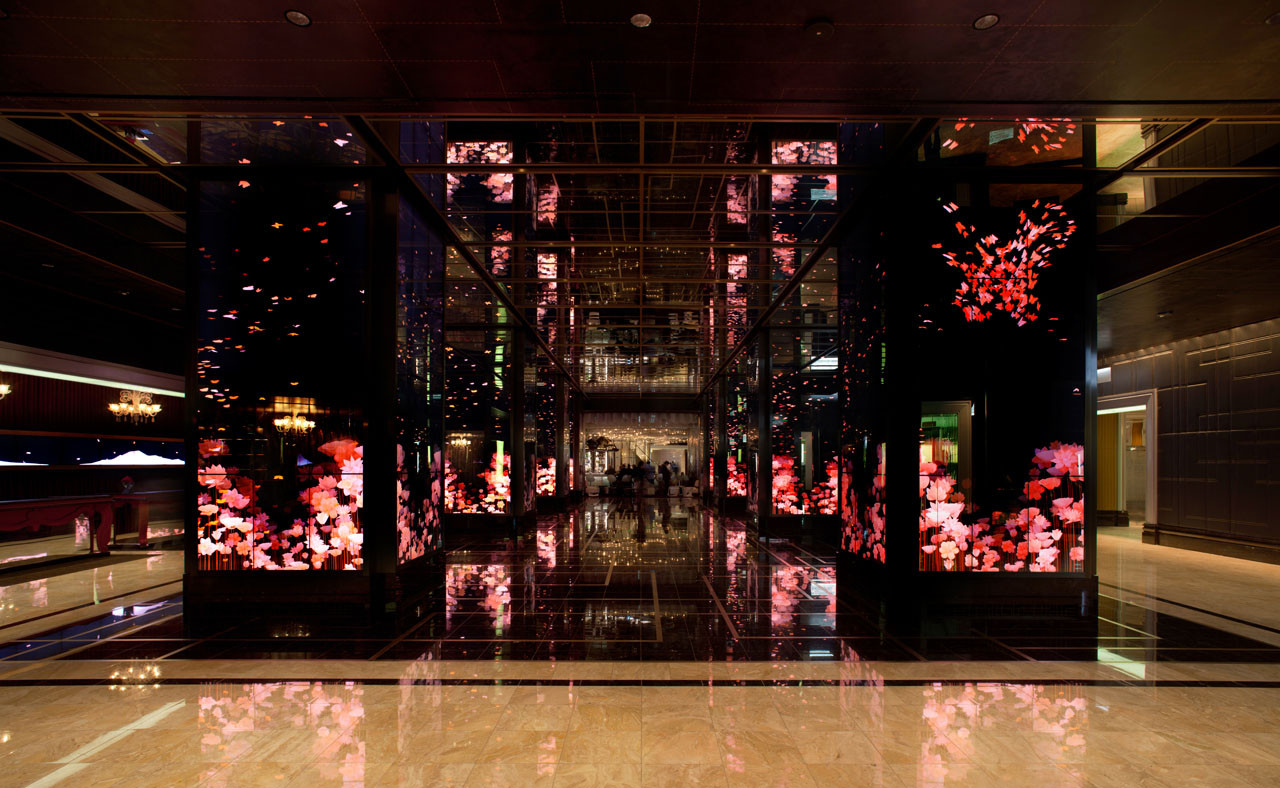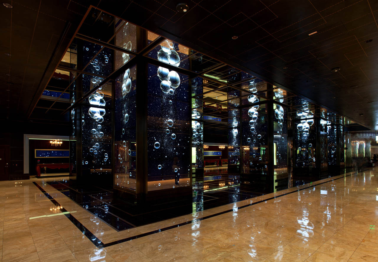 Vakarinė fojė yra kinetinė erdvė su aštuoniais milžiniškais stulpais, dengtais veidrodžiais ir skystųjų kristalų ekranais. „Rockwell Group“ sumontavo 384 ekranus ant stulpų ir dar 26 ekranus už registratūros, taigi taip erdvėje sukūrė visą įvairovę skaitmeninių potyrių.