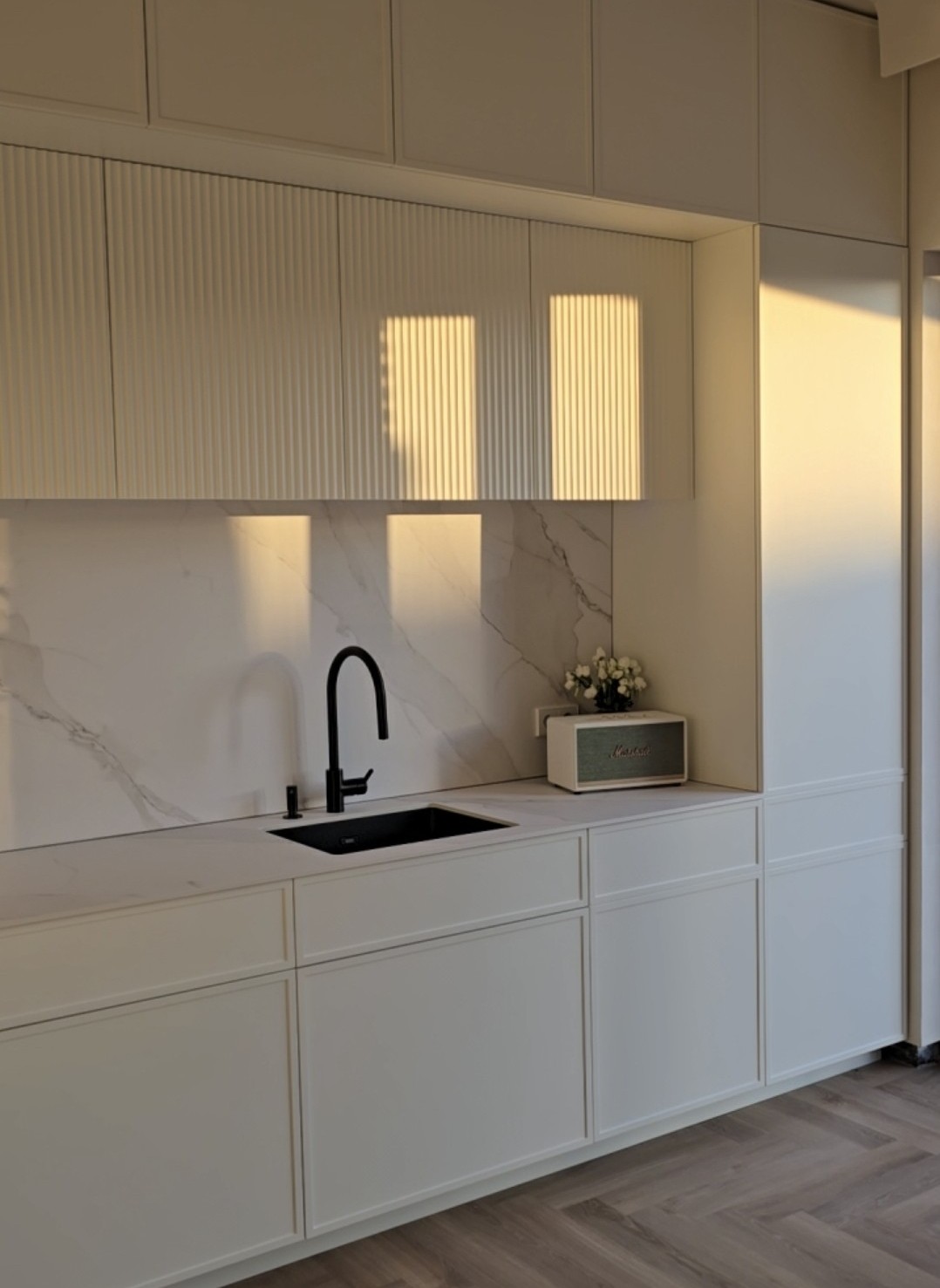 Jų namai tapo pavyzdžiu to, ką kūrėjai vadina „apgalvotu estetizmu“ – kai grožis kyla iš funkcionalumo, o ramybė – iš erdvės logikos. Vienas subtiliausių sprendimų – vadinamosios „nematomos durys“, kurios vizualiai susilieja su sienomis. Toks sprendimas sukuria vientisumo jausmą, padidina erdvę ir mažina vizualinį triukšmą, kuris, pasak dizainerių, mus veikia labiau, nei dažnai suvokiame.