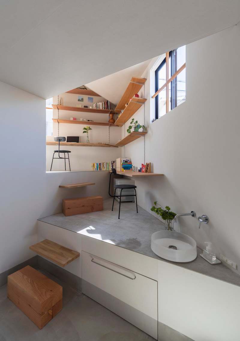 „Užuot naudodamas sienas ir skirtingus grindų lygius, norėdamas aiškiai padalyti erdvę į įvairias funkcijas, erdves atskyriau per pakopines grindis. Idėja yra sukurti erdvės pojūtį mažo namo viduje, kad jūs vieną akimirką atsidurtumėte palėpėje, o kitą – galite klaidžioti rūsyje“, – aiškino „Tato Architects“ įkūrėjas Yo Shimada.
