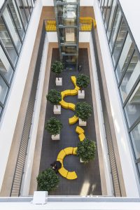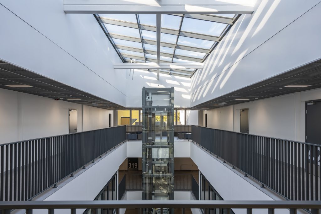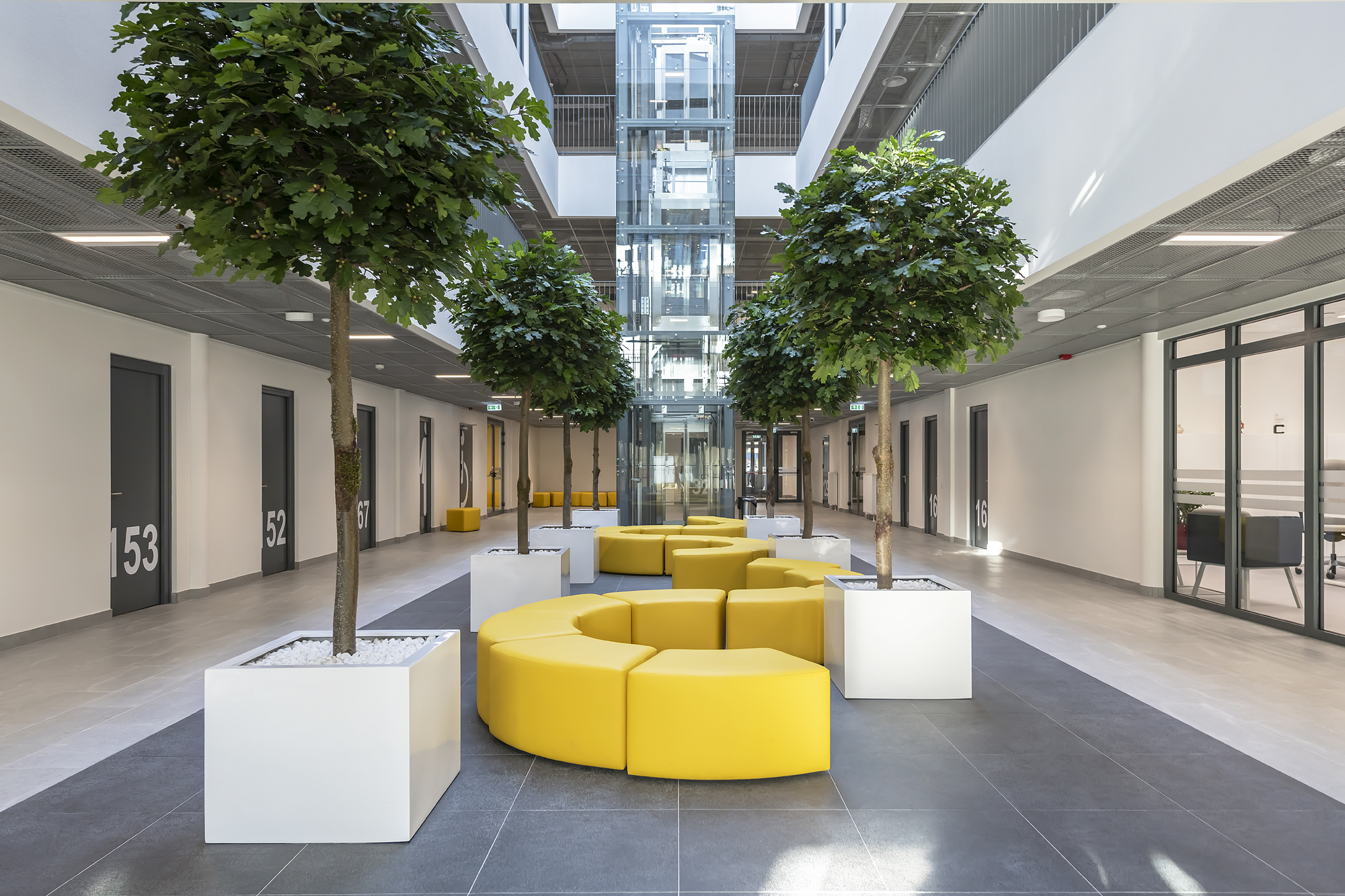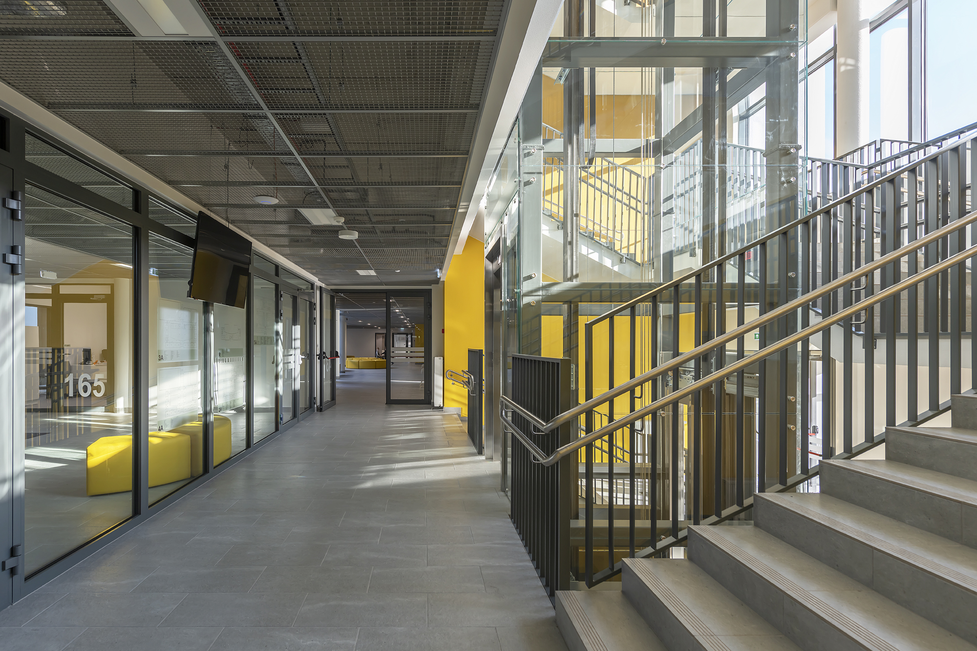 „Interjere naudojome ir iš pradžių sunkiai pastebimus sprendimus, pavyzdžiui, šoninės koridorių sienos yra dažytos geltona spalva, tačiau ji keičiasi kylant aukštais į viršų. Pirmame aukšte naudotas tamsesnis atspalvis, o viršutiniame gerokai šviesesnis“, – sako V. Juozaitis.