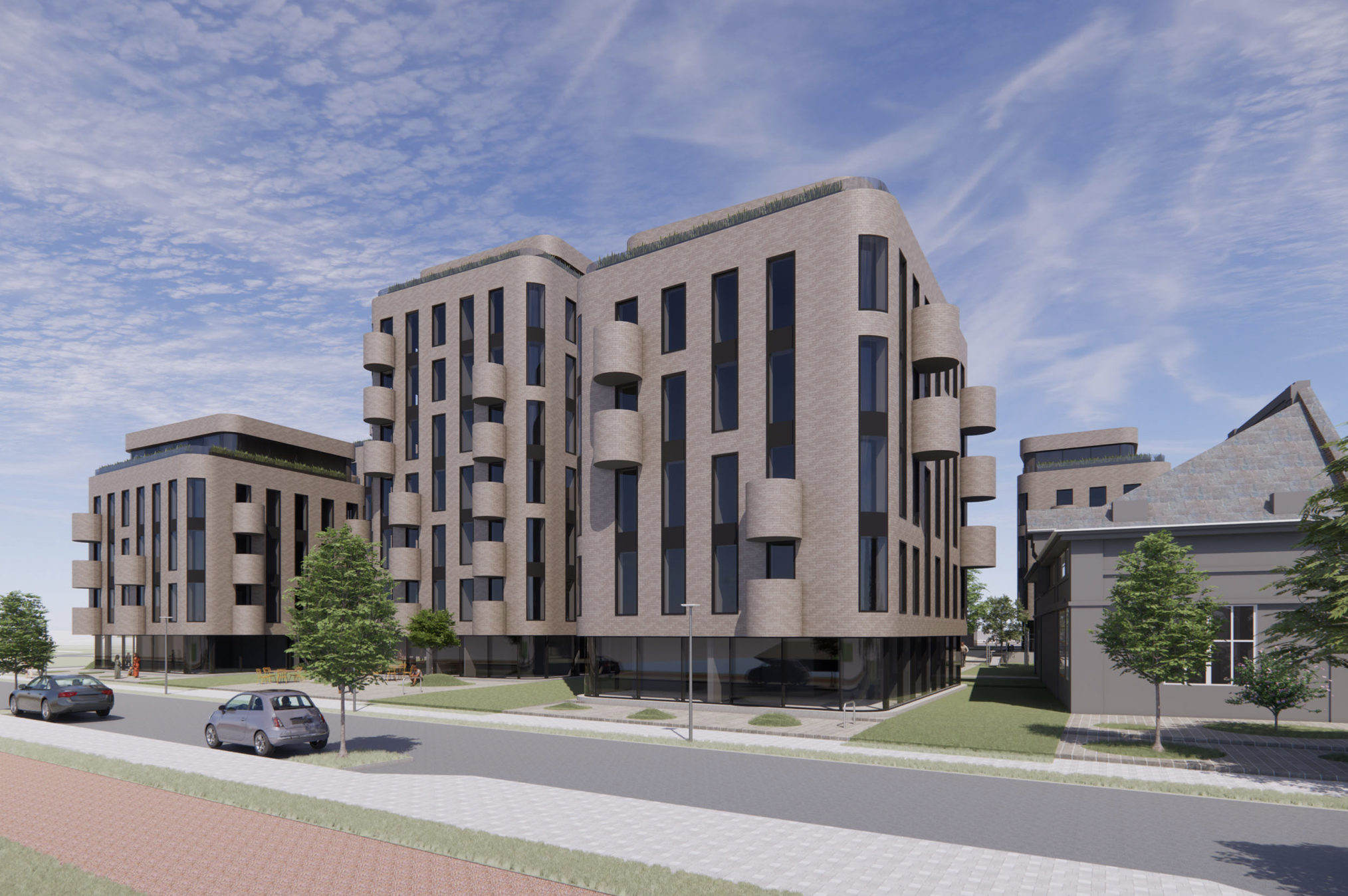 Architektūrinį charakterį sustiprina užapvalinti pastato kampai bei cilindriniai balkonai, suteikiantys lengvumo ir modernumo įspūdį. Atviruose kiemuose planuojama išsaugoti natūralią medžių alėją, įrengti poilsio zonas bei aikšteles, kurios skatins gyventojų bendravimą ir leis mėgautis ramia aplinka.