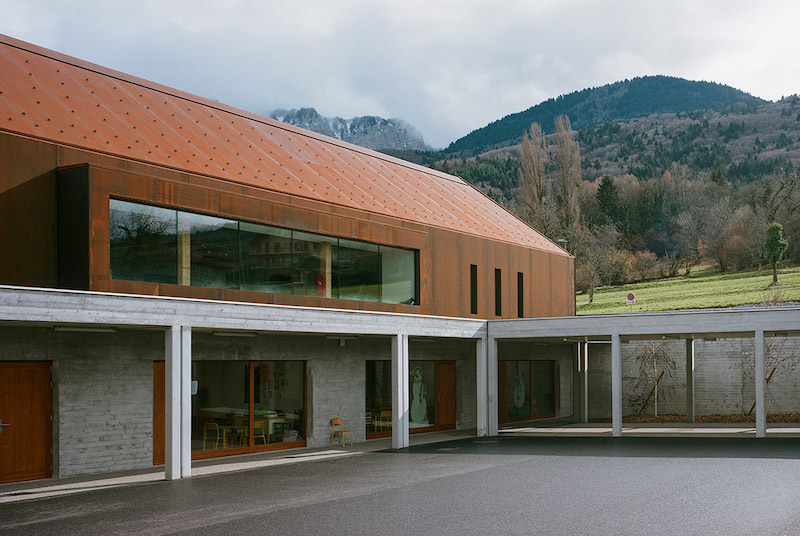 Architektų studija „Ateliers O-S Architectes“ pasirinko naudoti betoną ir susieti mokyklą su aplinkiniu kraštovaizdžiu bei kitais pastatais Lugrin kaime.