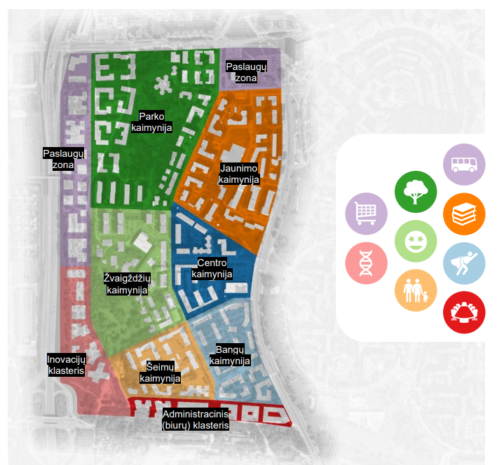 Rajono vystymo koncepcija grindžiama šiuolaikinės urbanistikos principais, pasitelkiant kaimynijų modelį. Čia svarbus ne tik pastatų išdėstymas, bet ir jų ryšys su viešosiomis erdvėmis, judumo galimybėmis bei bendruomenės identitetu.