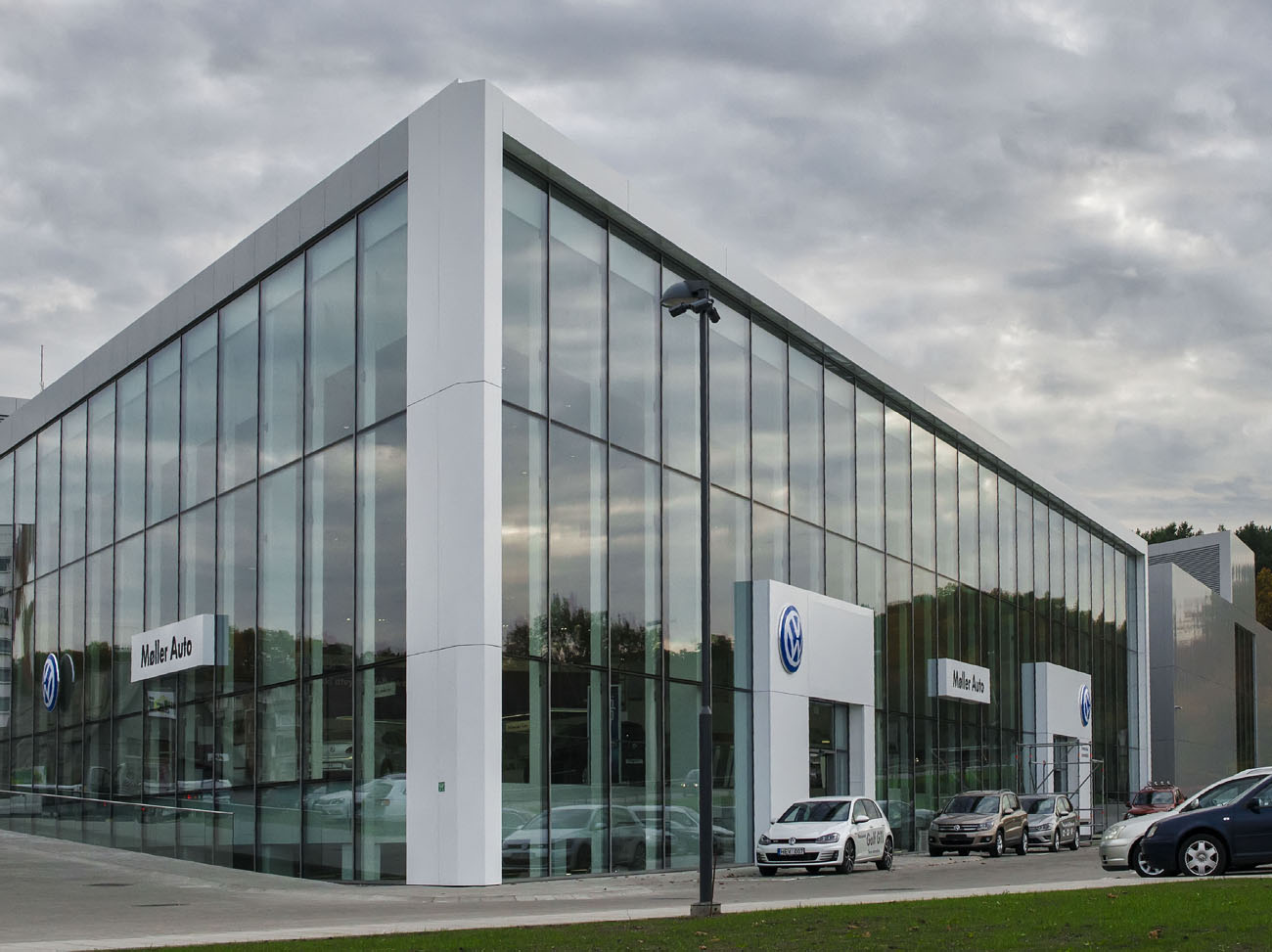 Įstiklintos pastato sienos yra iš fasadinės dviejų stiklų stiklo paketų ir aliuminio profilių struktūros. Pagrindinio fasado elementams naudoti aliuminio kompozicinių plokščių lankstiniai. Vieno automobilių centro fasado stiklo paketo svoris kone 2,5 karto viršijo didelių gabaritų stiklų, kuriuos montuojant galima apsieiti be specialių sprendimų, svorį. Centro namų fasadams, stogams ir patalpų pertvaroms įrengti buvo naudotos ypač sandarios daugiasluoksnės plokštės. Kadangi automobilių salėse norėjosi didelių erdvių, kurių neskaidytų kolonos, buvo pasirinktos ir ilgesnės negu įprasta perdangų plokštės. Šiame objekte naudota ilgiausia plokštė buvo net 19,5 metro. Pertvaros tarp visų patalpų padarytos iš mūro arba surenkamųjų gipskartonio ir metalo karkaso profilių su normine mineralinės vatos izoliacija. Darbuotojų darbo vietos atitvertos grūdintu ir laminuotu stiklu, įrėmintu šveisto nerūdijančiojo plieno rėmais. Net ir sienų spalva griežtai reglamentuota „Volkswagen AG“ ir turėjo būti itin tiksli.