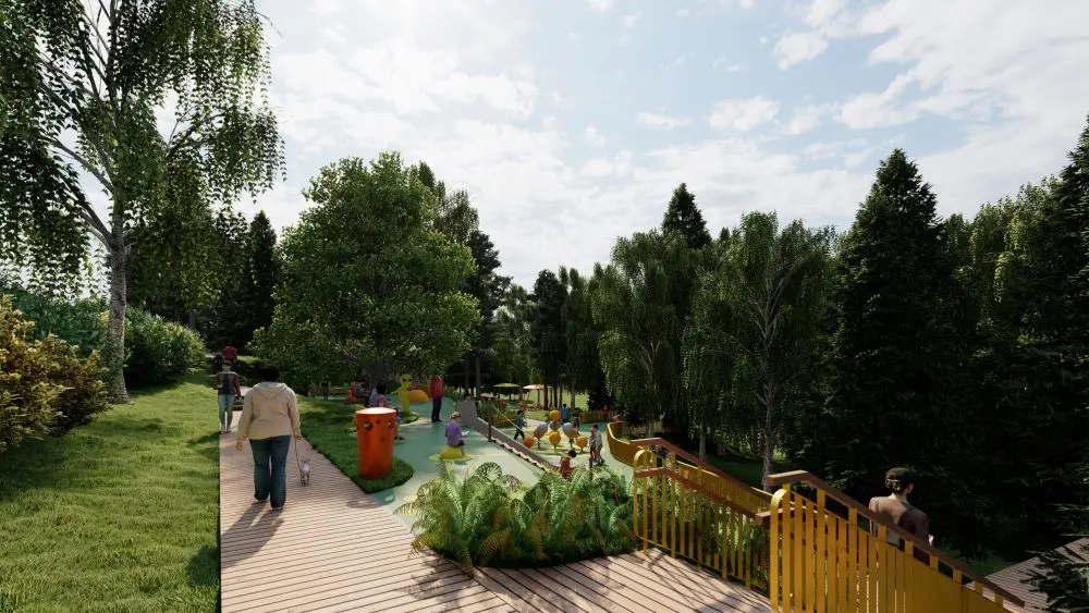 Natūralų, spygliuočių apsuptą reljefą papildys vaikų žaidimų aikštelė su ateivių motyvais, geltonos spalvos akcentai, žaisminga ateivio skulptūra. Tai ne tik džiugins vaikus, bet ir taps vizualiniu simboliu visai bendruomenei.
