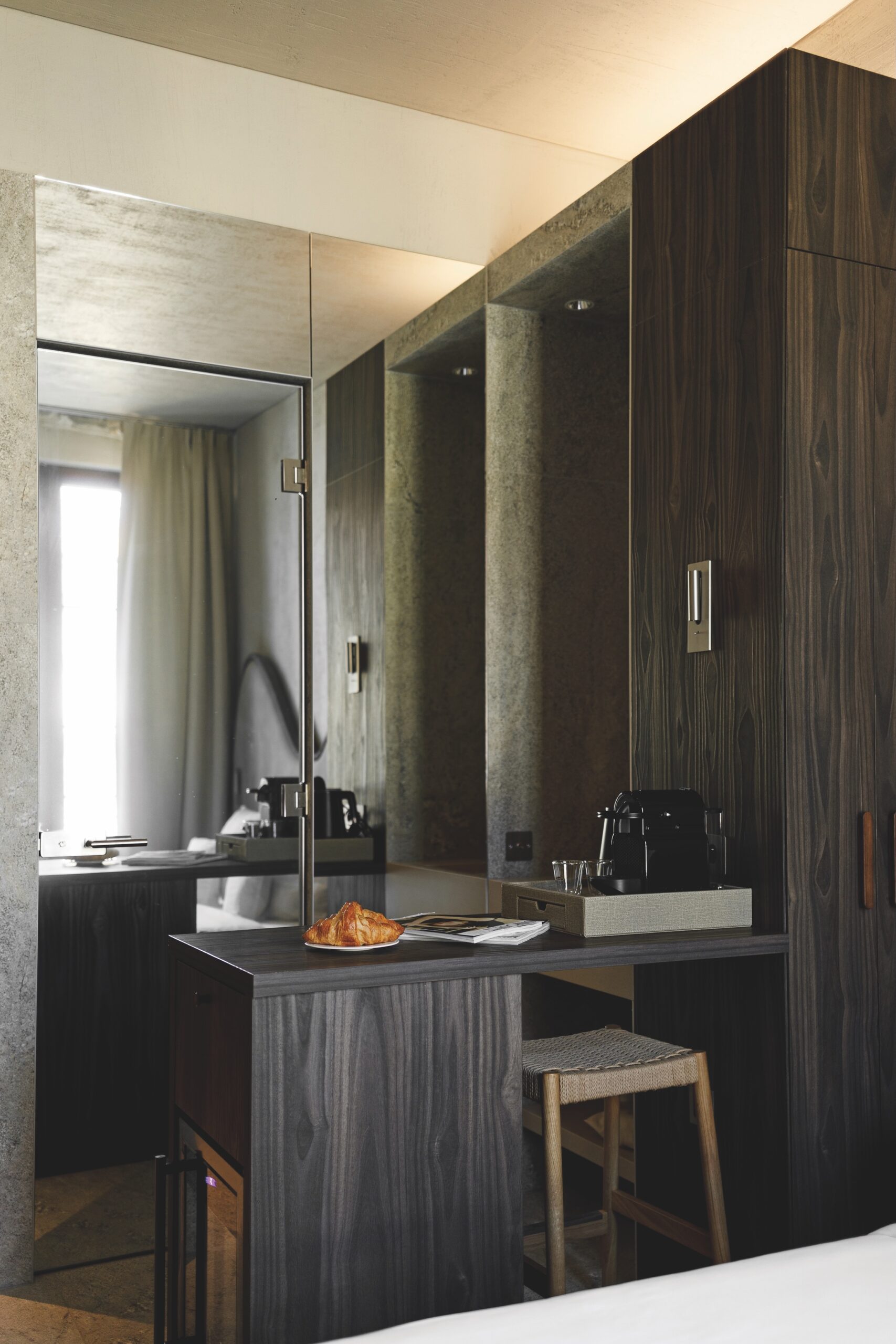 „Nenorėjome kambariuose kurti didelio kontrasto. Kad praplėstume erdvę, panaudojome nemažai veidrodžių – jie čia funkcionuoja ir kaip sienų apdaila. Tai nėra standartinis viešbučių projektų sprendinys, nes visoms atspindinčioms, blizgioms medžiagoms reikia daugiau priežiūros ir valymo, tačiau šįkart įspūdis nugalėjo“, – pasakoja I. Sangus.
