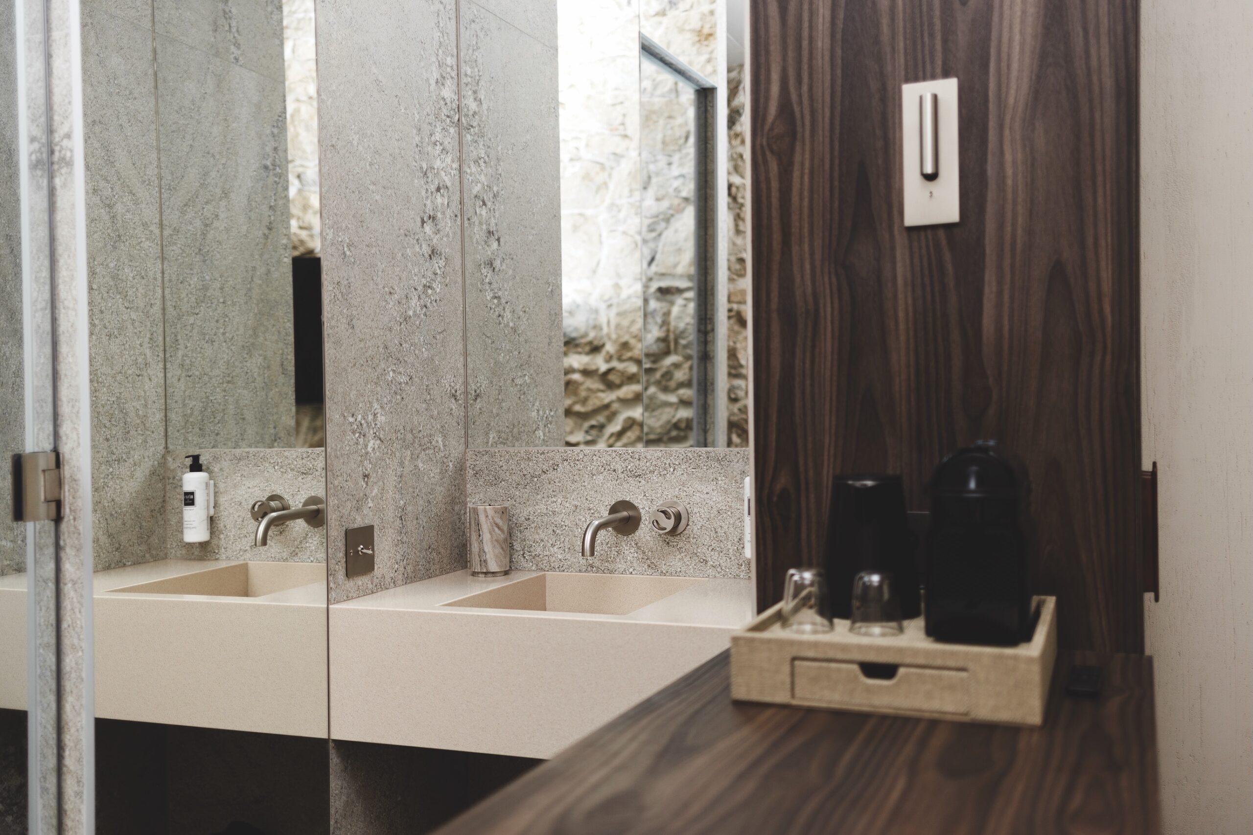 Dušo zonose įrengtos berėmės stiklo pertvaros vizualiai išplečia erdvę ir sukuria lengvumo pojūtį. Toks sprendimas ne tik estetiškas, bet ir praktiškas – konstrukcijos ilgaamžės, patogios naudoti ir lengvai prižiūrimos. Viešbučiams tai ypač svarbu, nes patvarumas ir patogumas tiesiogiai susijęs su svečių potyriais.
