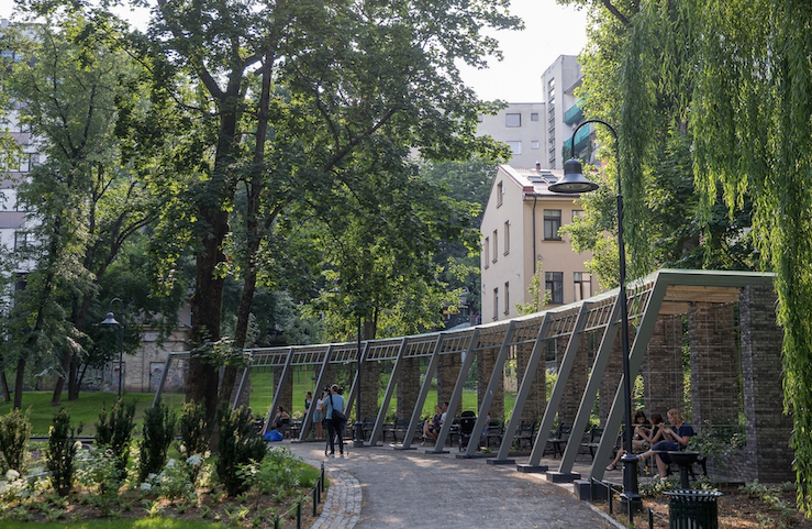 Rekonstrukcijos projektas – išskirtinis, projekto architektų komanda, vadovaujama architekto Aldis Polis siekė atkartoti šalia Siguldos esančios Gaujos upės kraštovaizdį, perteikti ledynmečio metu susiformavusių uolienų sluoksnių grožį ir koloritą. Šis subtilus atspalvių žaismas pakartotas ir rekonstruojant dangas – aplink pastatą iškloti 11 skirtingų atpalvių natūralaus akmens faktūrų gaminiai, kuriais padengtas 6.800 m2 plotas.