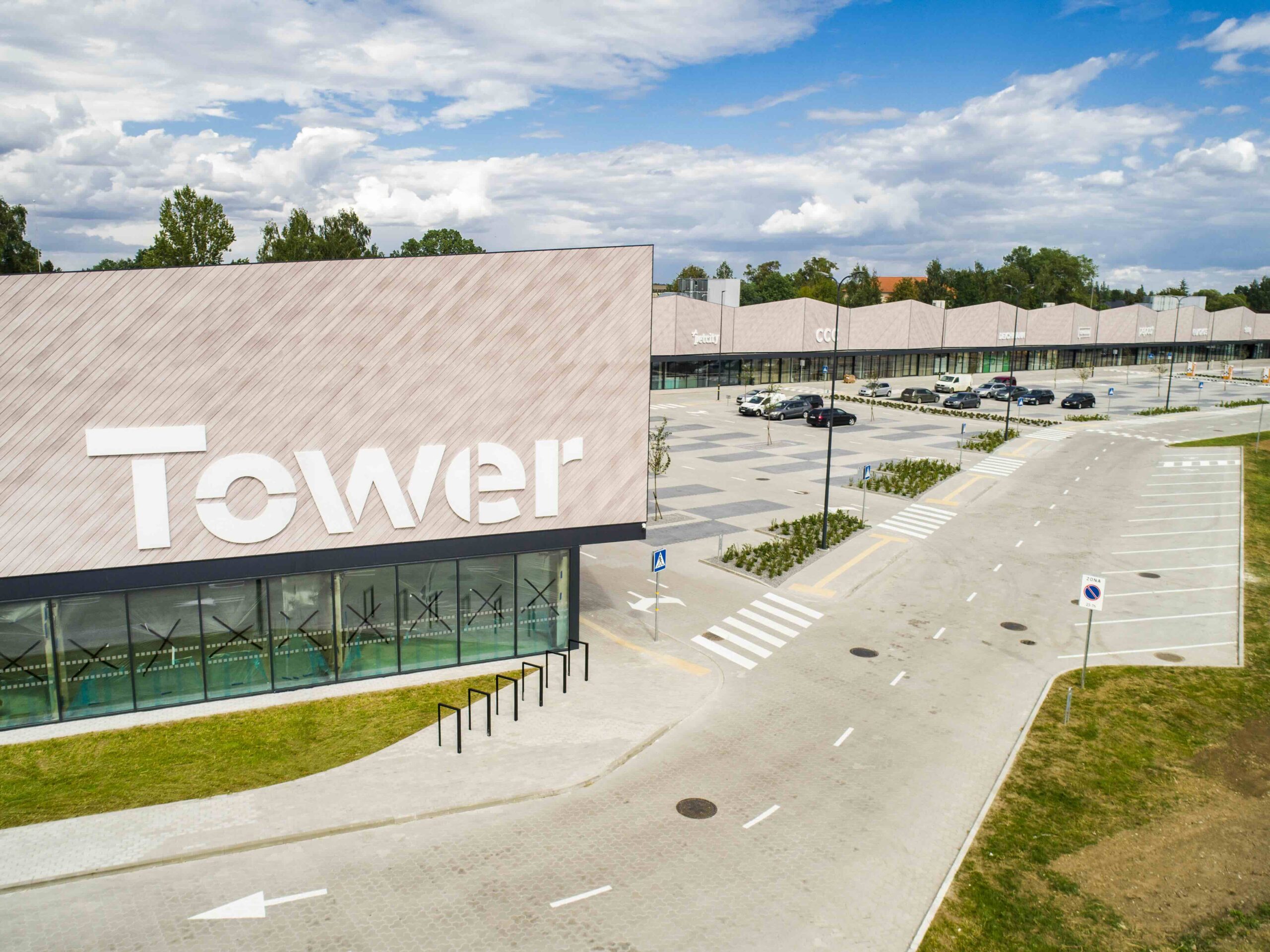„Tower“ lankytojų jau laukia beveik 250 vietų stovėjimo aikštelė, 6 greitieji taškai elektromobiliams ir prekybos parko koncepcijai būdingi atskiri įėjimai į kiekvieną parduotuvę iš lauko.