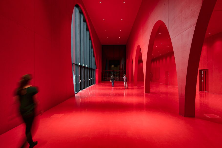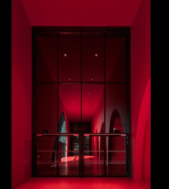 Įspūdingas fojė tarp dviejų parodų salių yra visiškai raudonos spalvos, o penkios elipsės formos arkos su atramine betonine plokšte formuoja arkadą ir atskiria lankytojų srautą nuo tų, kurie atsipalaiduoja kavinėje.