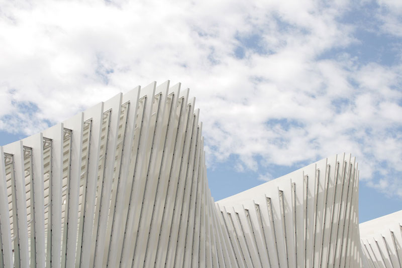 Santiago Calatrava suprojektuota stogo konstrukcija susideda iš 19 modulių, kurių kiekvienas yra sudarytas iš pakopinės 25 plieninių elementų serijos, esančios maždaug 1 m atstumu vienas nuo kito. Moduliai išdėstyti trimatėje sinusoidinėje kreivėje. Tai sukuria įtikinamą dinaminę struktūrą – tobulą bangą. Visą paviršių palaiko gelžbetonio konstrukcija, sudaryta iš išilginės sijos. Stogą ir sienas sudarančios konstrukcijos yra baltos, tarp jų – stiklas. Skaidrios laminuotos stiklo plokštės įterptos į plienines, naudojant aliuminio rėmus.