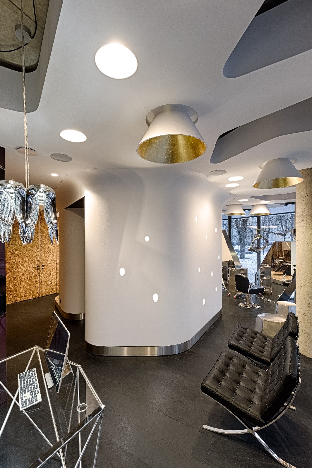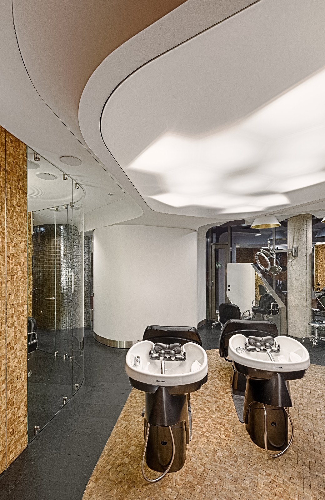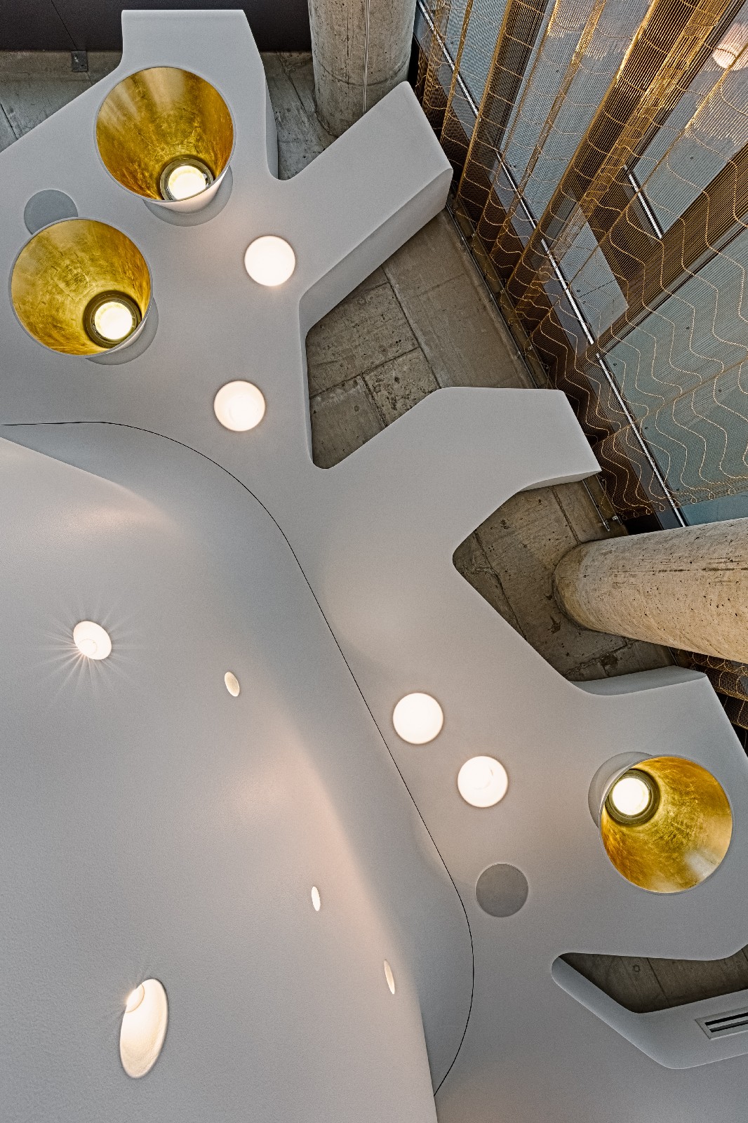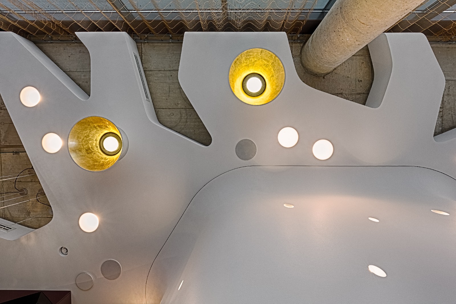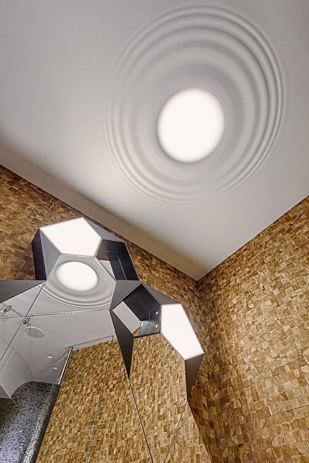 Dėl įvairių ant lubų esančių bioninių kreivių, formuojančių medžio lają ir savo plastika kontrastuojančių su atvira gelžbetonio perdanga, architektai sukūrė tūrio erdvę taip, kad lankytojai suvokia ją tarsi per vadinamąjį „žuvies akies“ (angl. fisheye) objektyvą. Kreivių gausa yra objekto dominantė, kuri esant įvairioms perspektyvoms susilieja su gipsiniais FLOS šviestuvais, primenančiais rojaus vaisius – tam jų vidinė pusė dekoruota aukso patalijos plokštelėmis, dėl kurių šviesa sklinda paauksuotu srautu ant pintų metalo užuolaidų, sukurdama mistišką metalo žaižaravimo efektą. Tos pačios kreivės apipina ir „Performa“ architektų suprojektuotą bei įmonės „Gaudrė“ dizainerių pagamintą telefono išmaniąja programa valdomą išsklaidytos šviesos sistemą „korys“. Kintamo spektro šviesa ir pagrindinių spalvų gama atlieka ne tik stilistinę, bet ir šviesos terapijos funkciją.